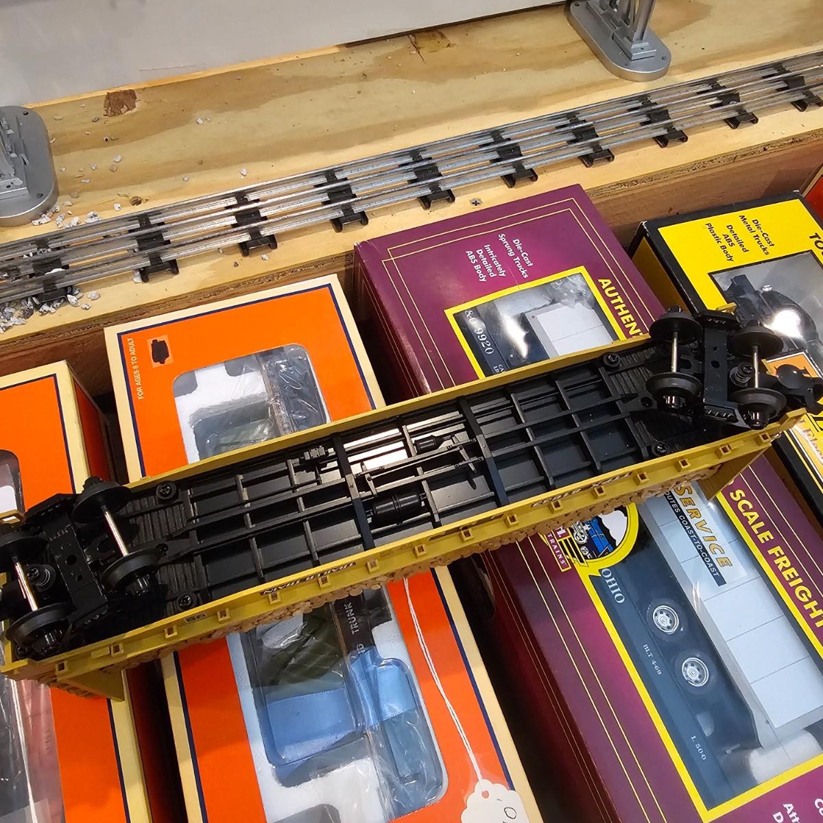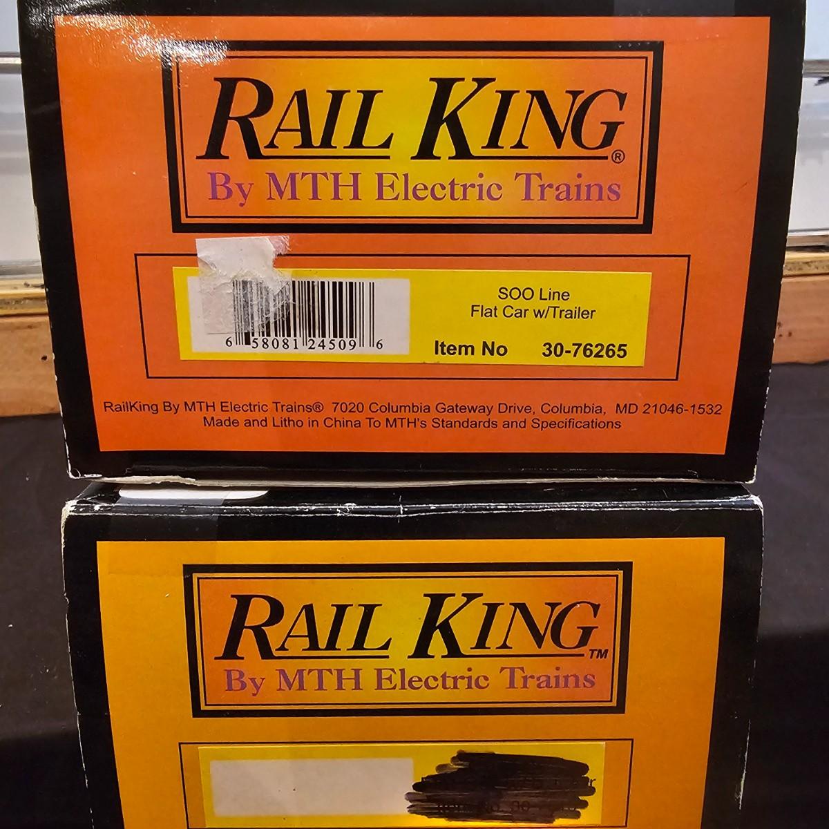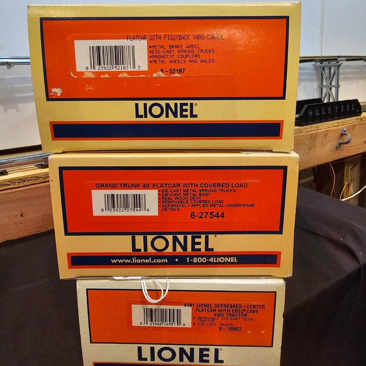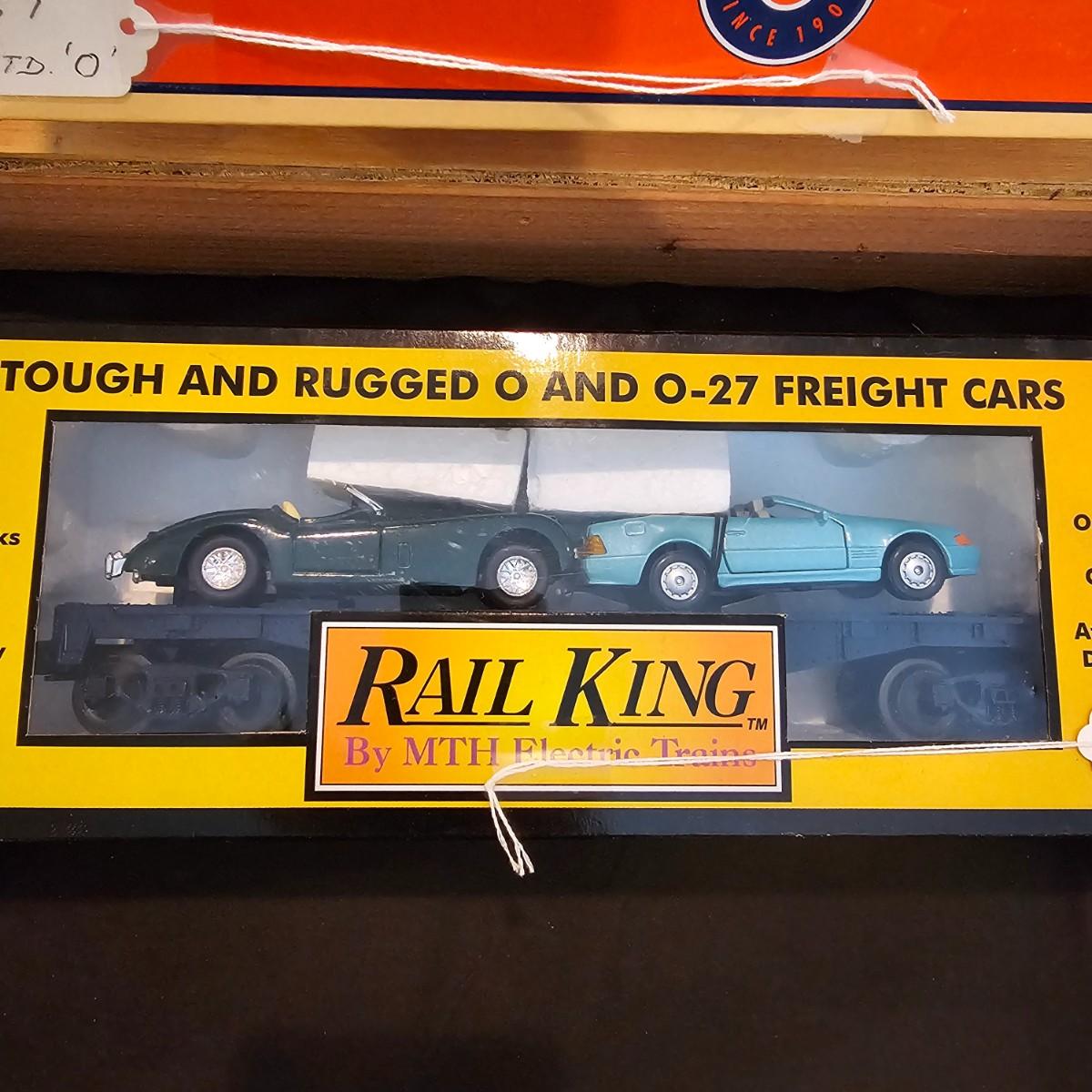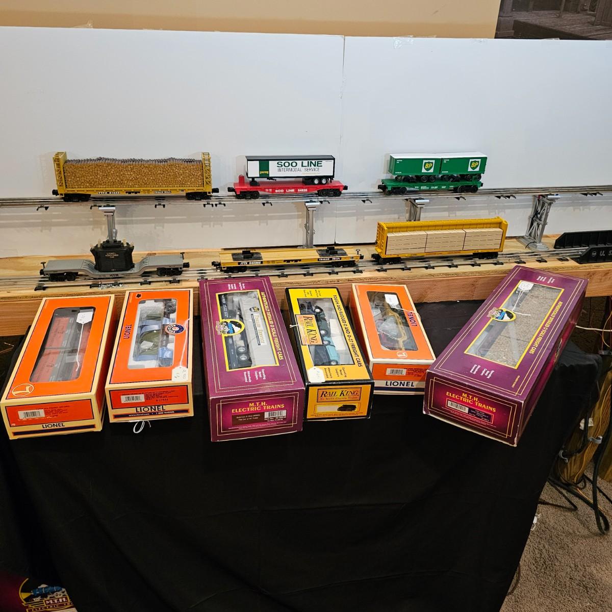 Several different styles of flatcars for specialty loads. Trailers, wood rounds, lumber, vehicles and other interesting items. Cars range from 11" to 18" in length, are all O gauge. Lionel, MTH/Rail King represented here. All but two cars have original boxes. See photos for details. Shipping available. Please note that any price tag seen on an item was not put there by Sterling Transitions and does not reflect the current value of the item. Any train tracks shown in photos are not included but are available in another lot in this sale.