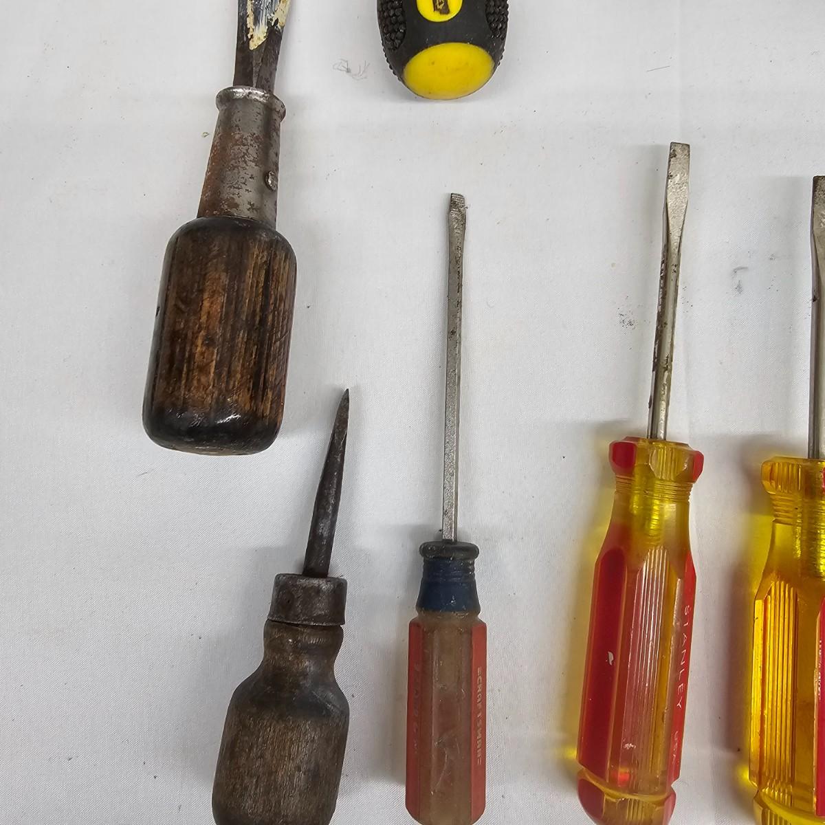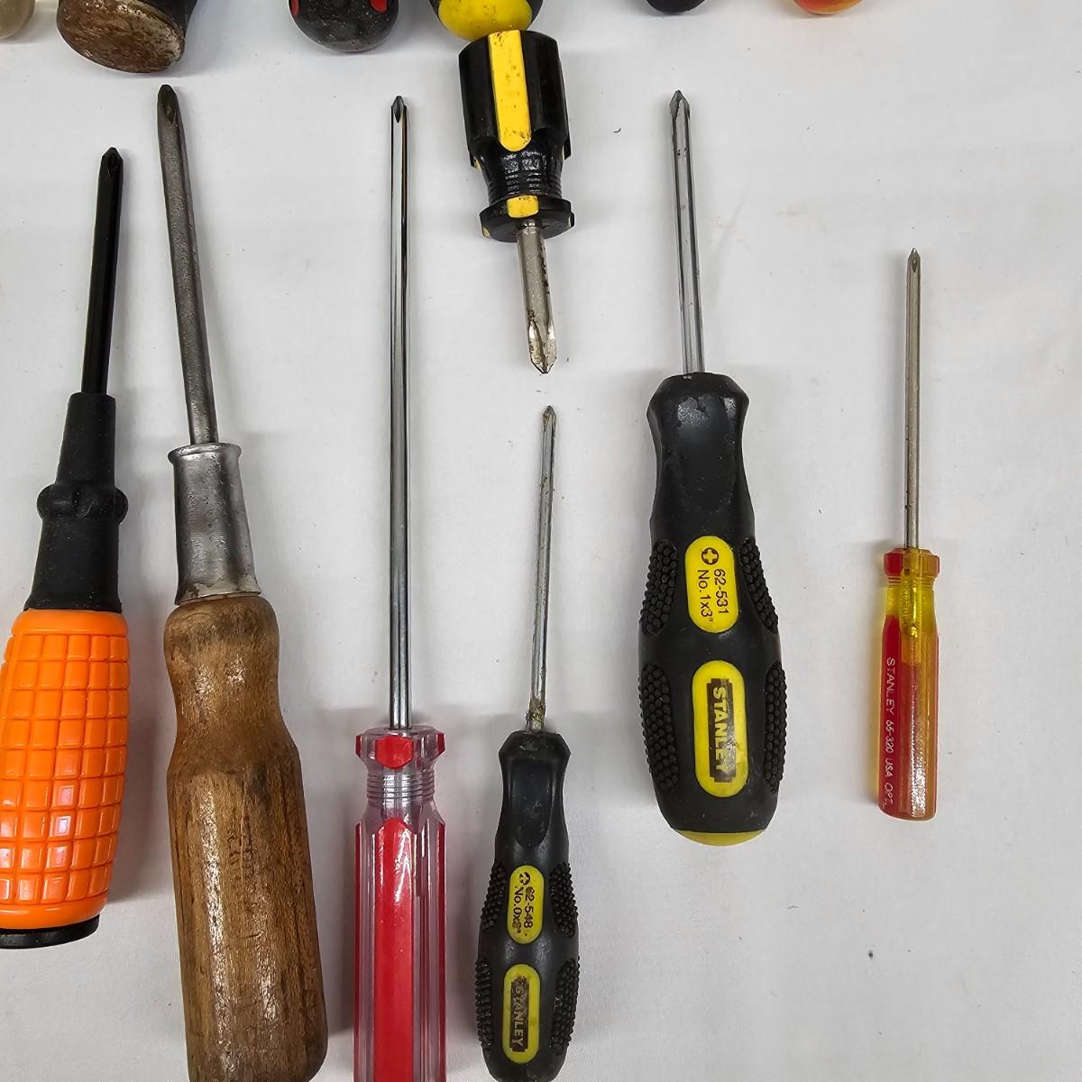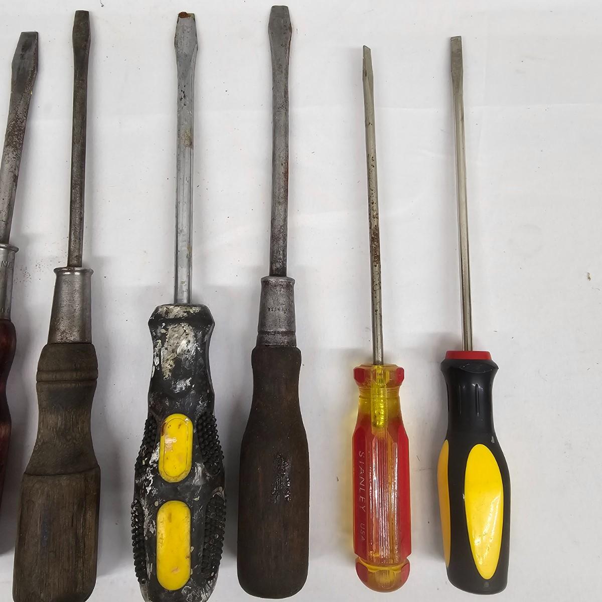 Stanley, Great Neck and other brands in this lot. Slender tiny heads to full width power on these items. Most items show signs of wear. Lengths range from3.5" to 11". See photos for details. Local pickup only.