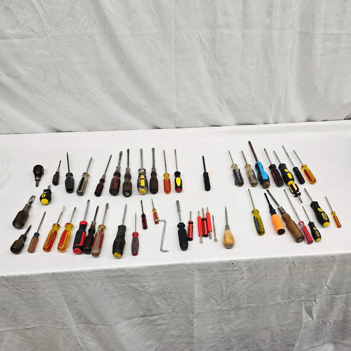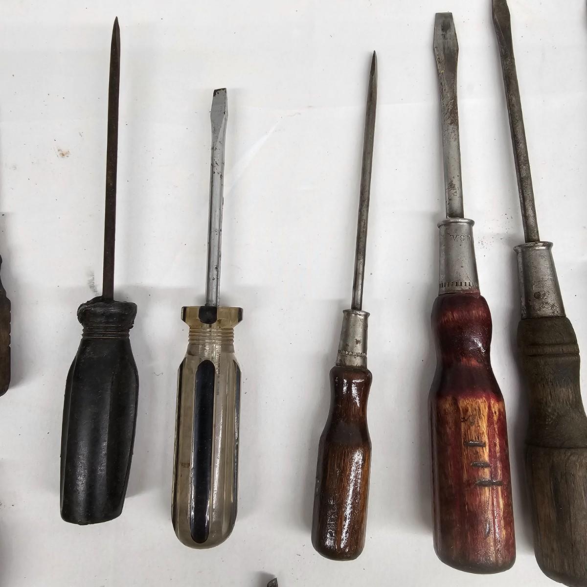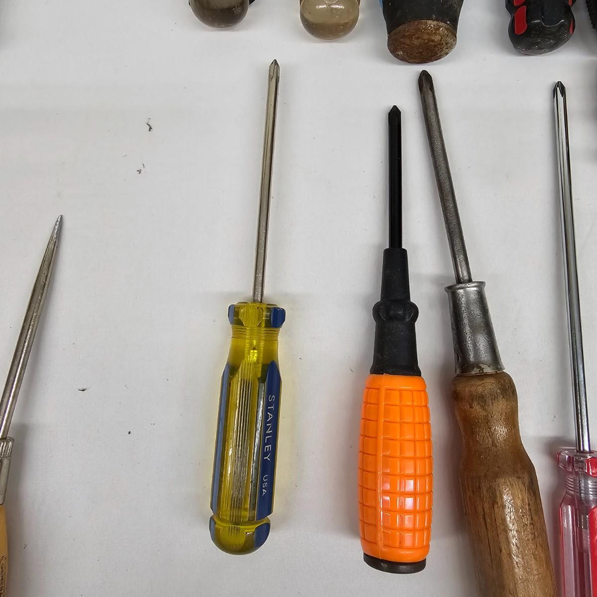 Stanley, Great Neck and other brands in this lot. Slender tiny heads to full width power on these items. Most items show signs of wear. Lengths range from3.5" to 11". See photos for details. Local pickup only.