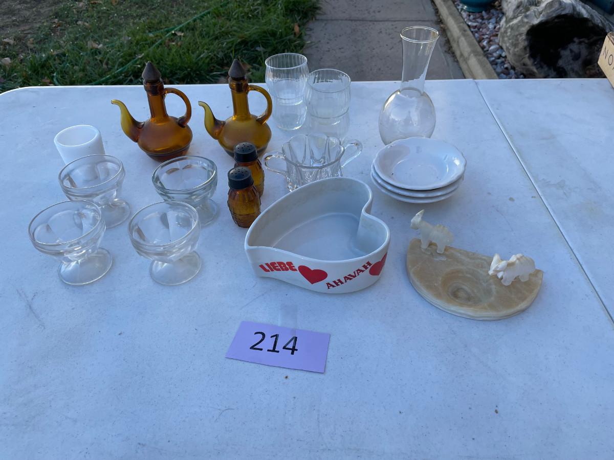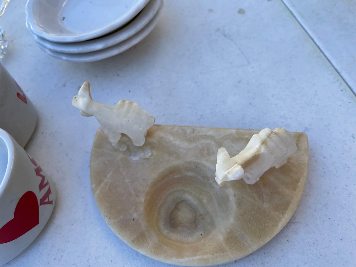 Vintage items. The alabaster ashtray has two donkeys...the one is lazy. He came unglued and only lays around. Can I say more.... LOL.
