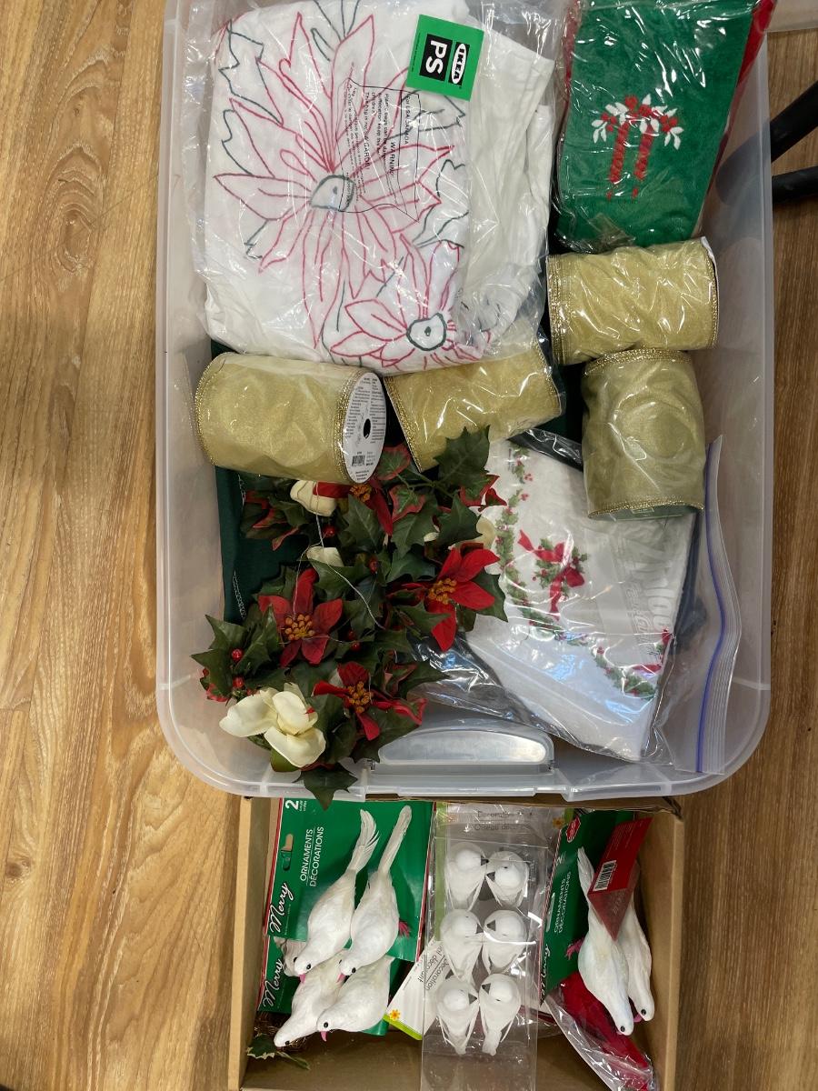 Flat tote with Christmas ribbon and decor with doves