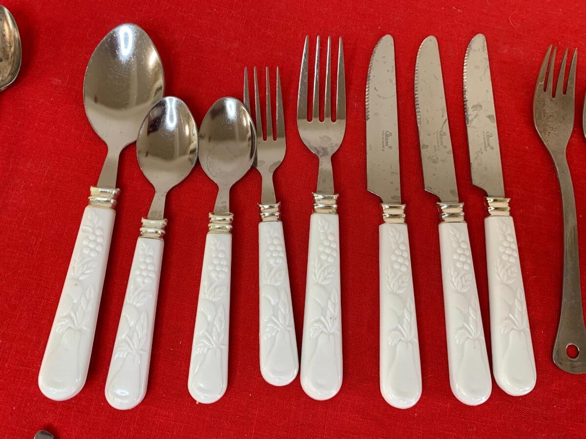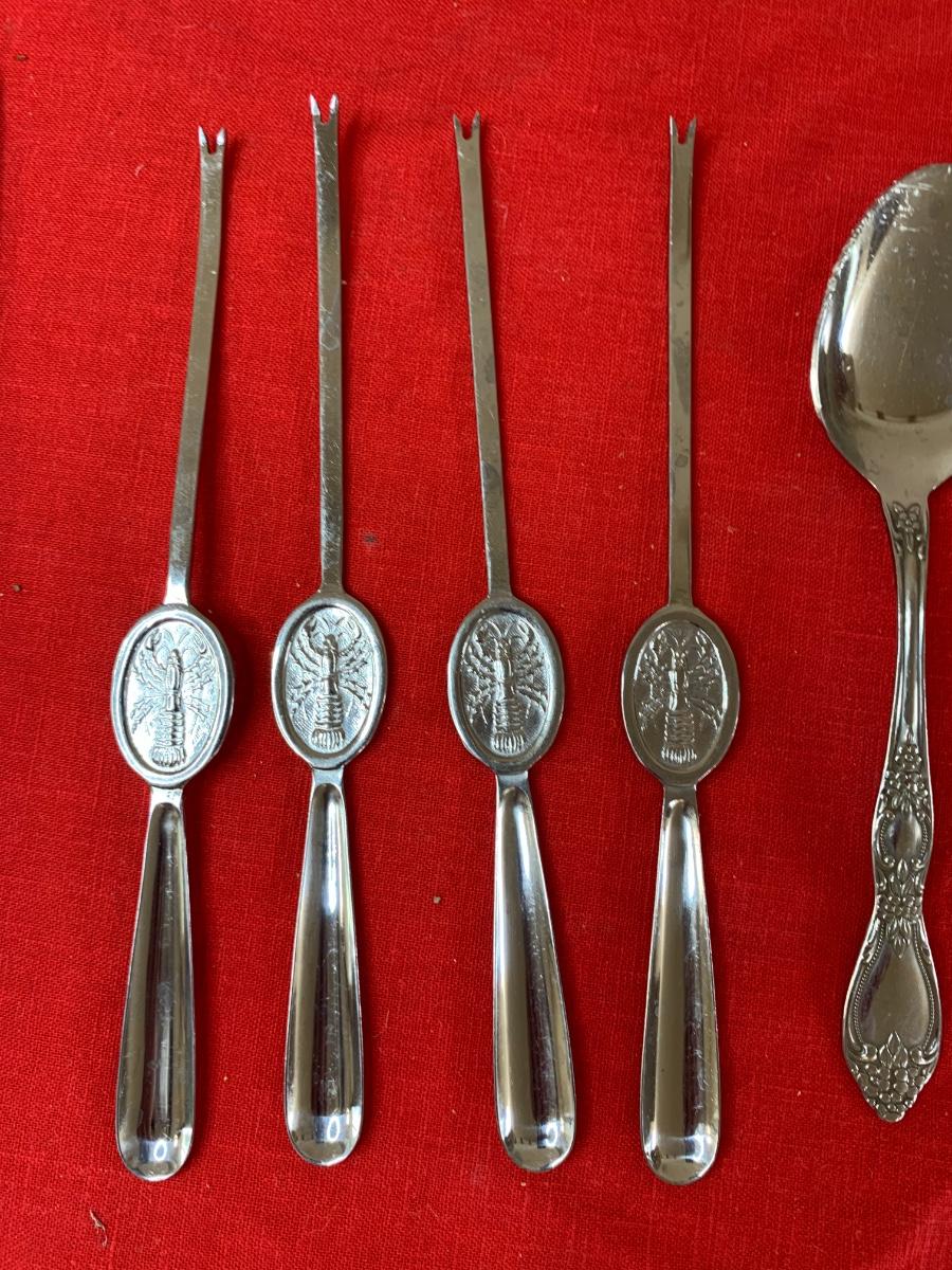 Lot includes 3 partial sets with plastic handles, a set of Oneida iced tea spoons, a set of lobster tools, and other random missed matched pieces of flatware.