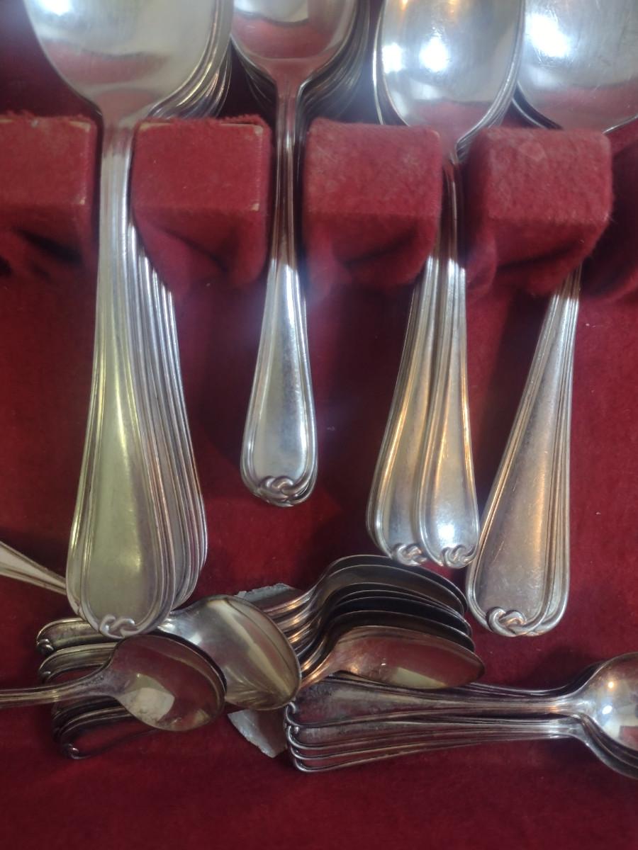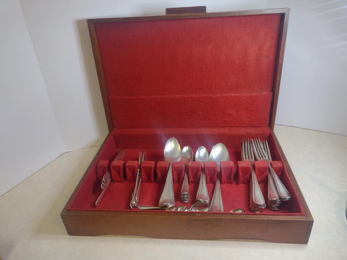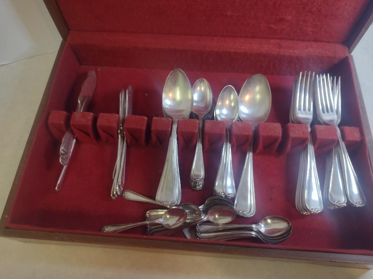 Flatware With Box- Approx 80 Pieces. Includes: dinner fork- 21, regular spoon- 17, large spoon- 12, serving spoon- 2, butter spreader- 10, demitasse spoon- 18.