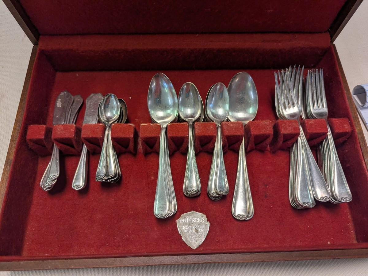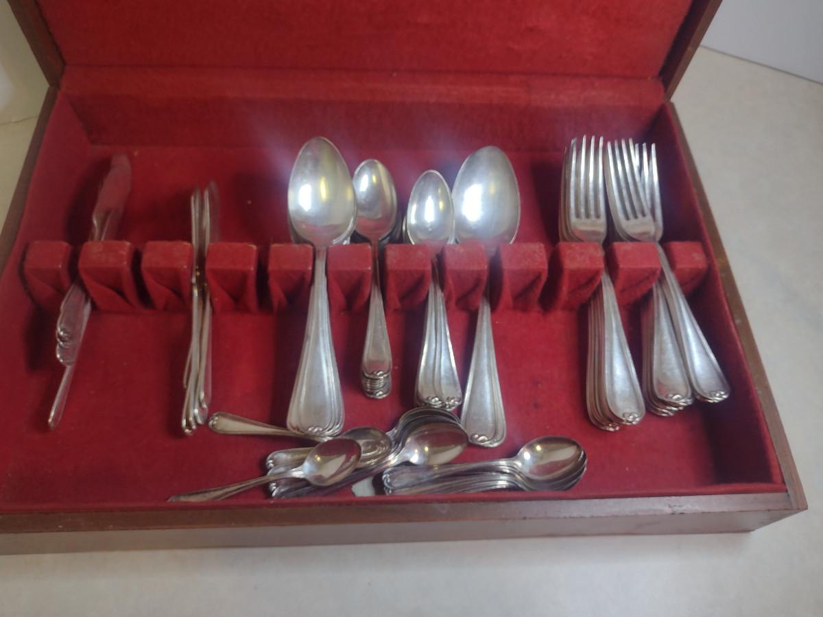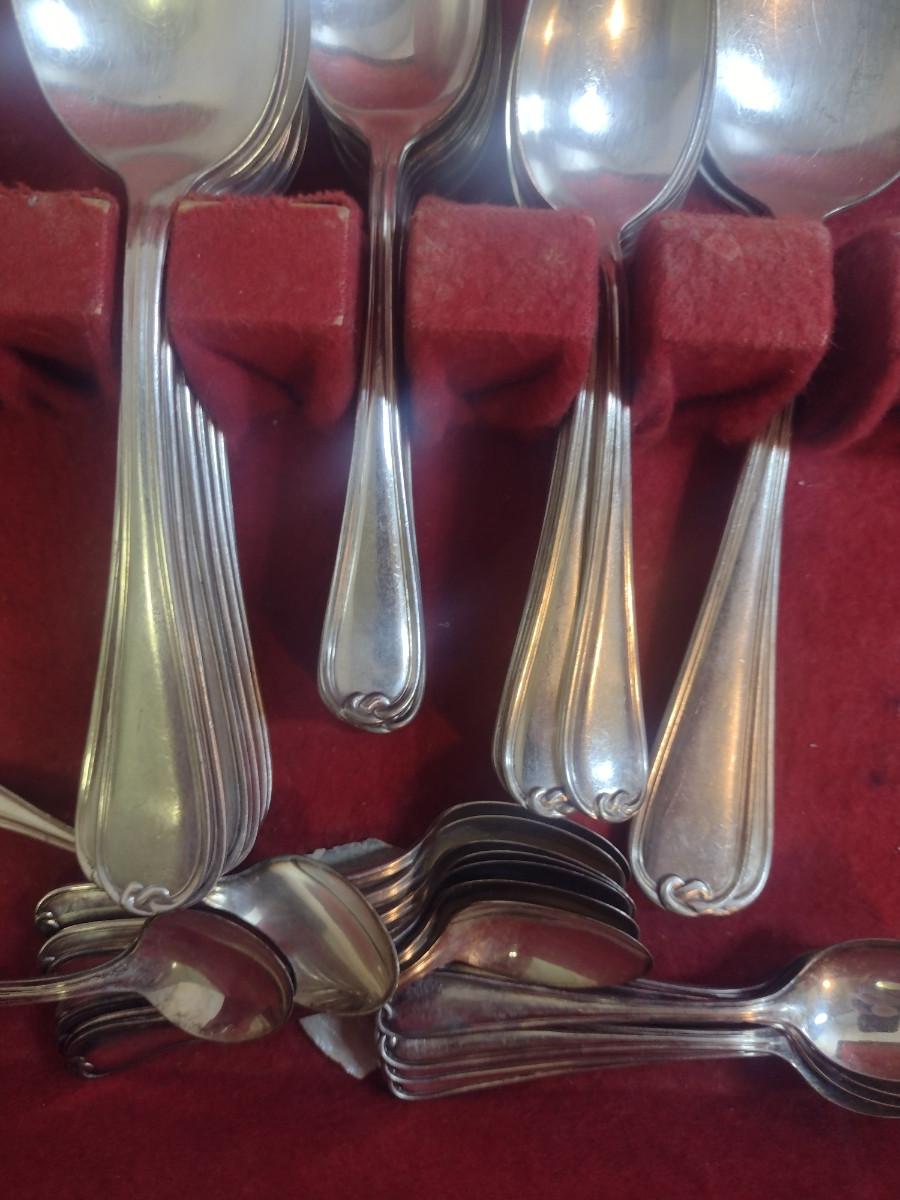 Flatware With Box- Approx 80 Pieces. Includes: dinner fork- 21, regular spoon- 17, large spoon- 12, serving spoon- 2, butter spreader- 10, demitasse spoon- 18.