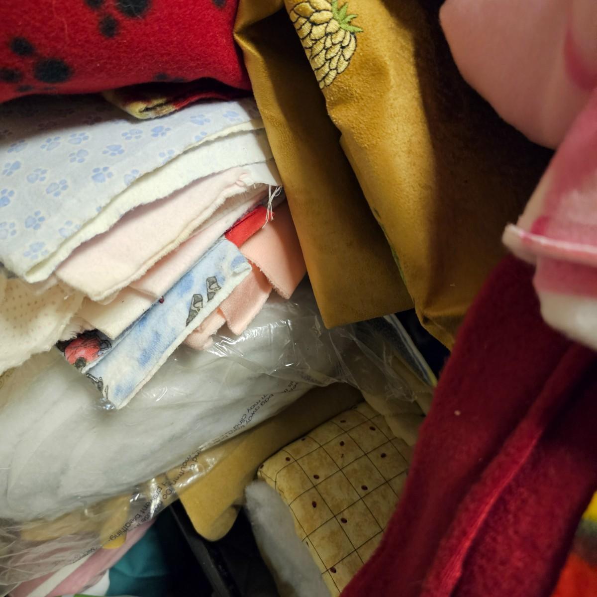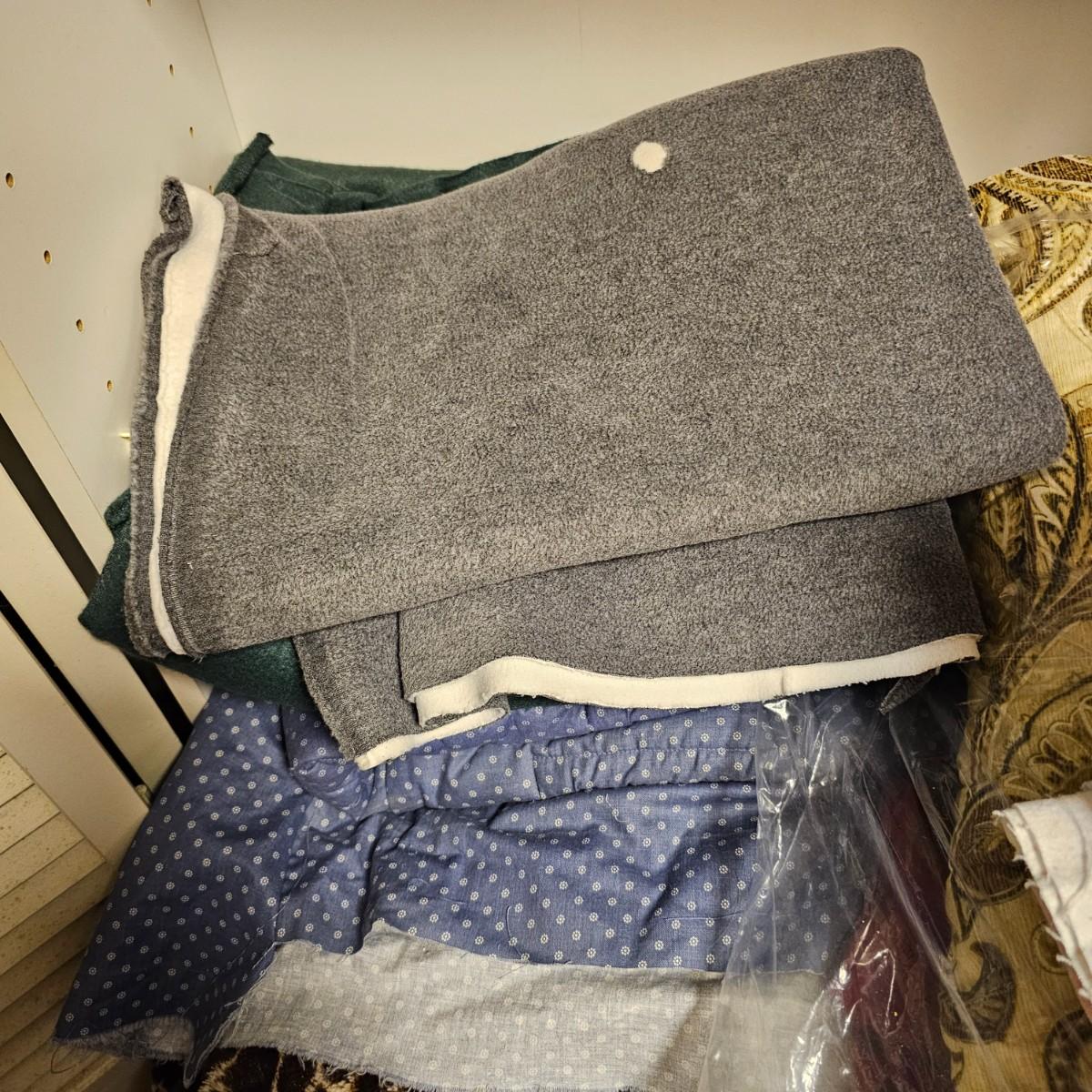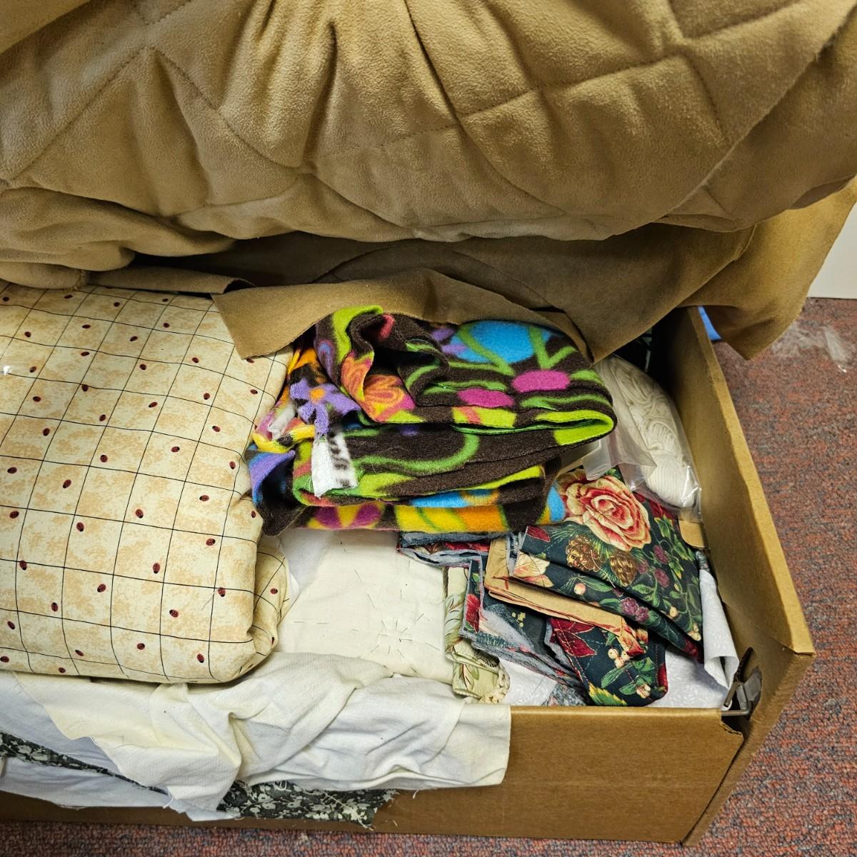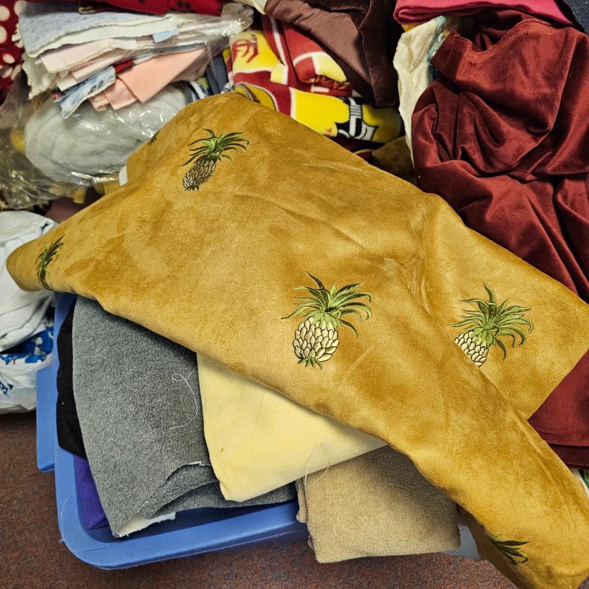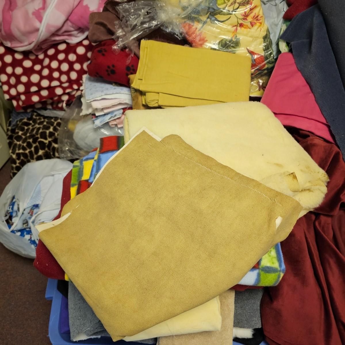 If it's soft and fluffy it is probably in this batch. All manner of blanket type fabric with lots of colors, patterns, sports team logos and more. Pieces for quilt backs or other uses. Also includes velveteen, some leather and many pieces already backed with batting. Several projects in work as well. Long rolls of red and blue are 62" wide, length indeterminate. Any items in tubs or baskets, they are included. All fabric is sold as is, where is. Winning bidder must bring their own boxes, bags or tubs and pack their winnings for removal. See photos for details. Local pickup only.