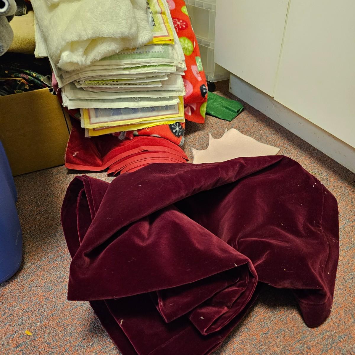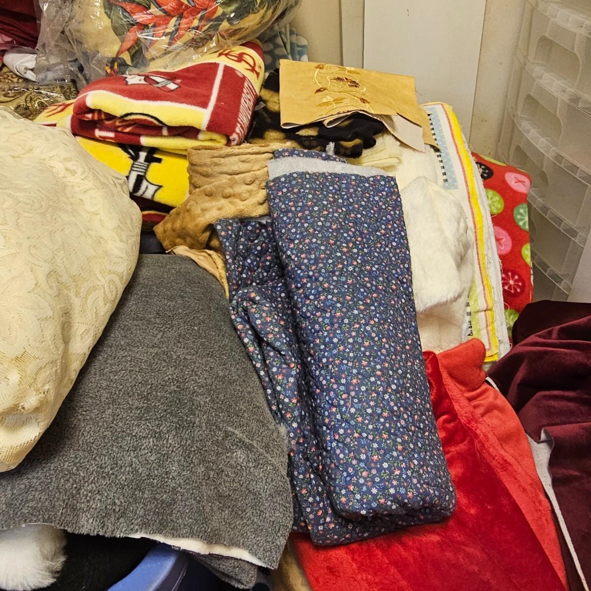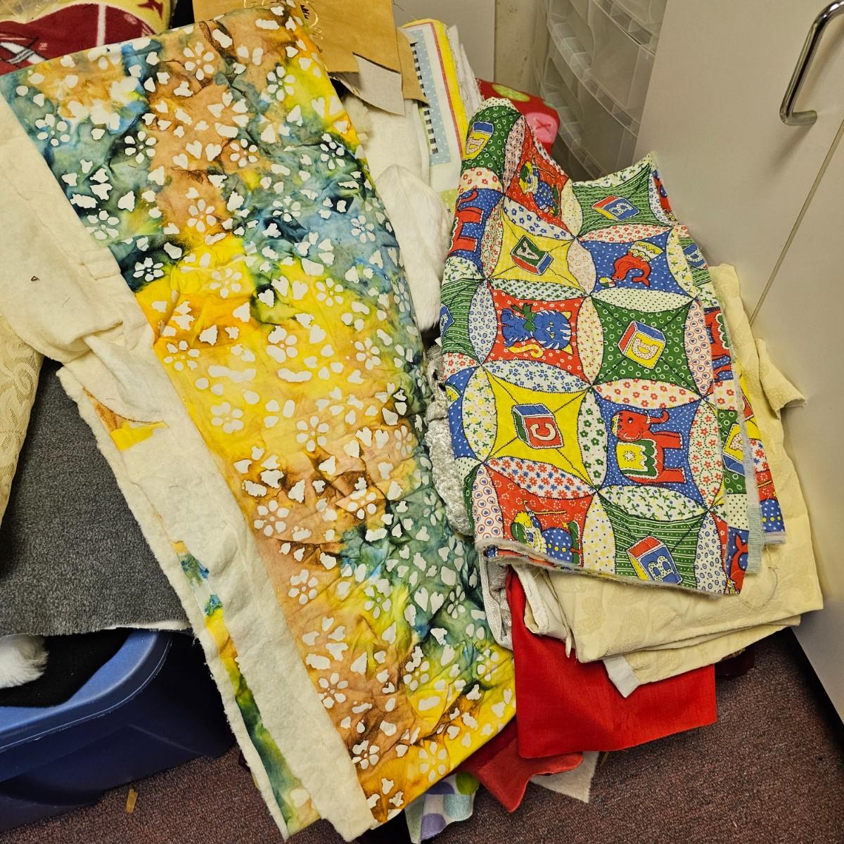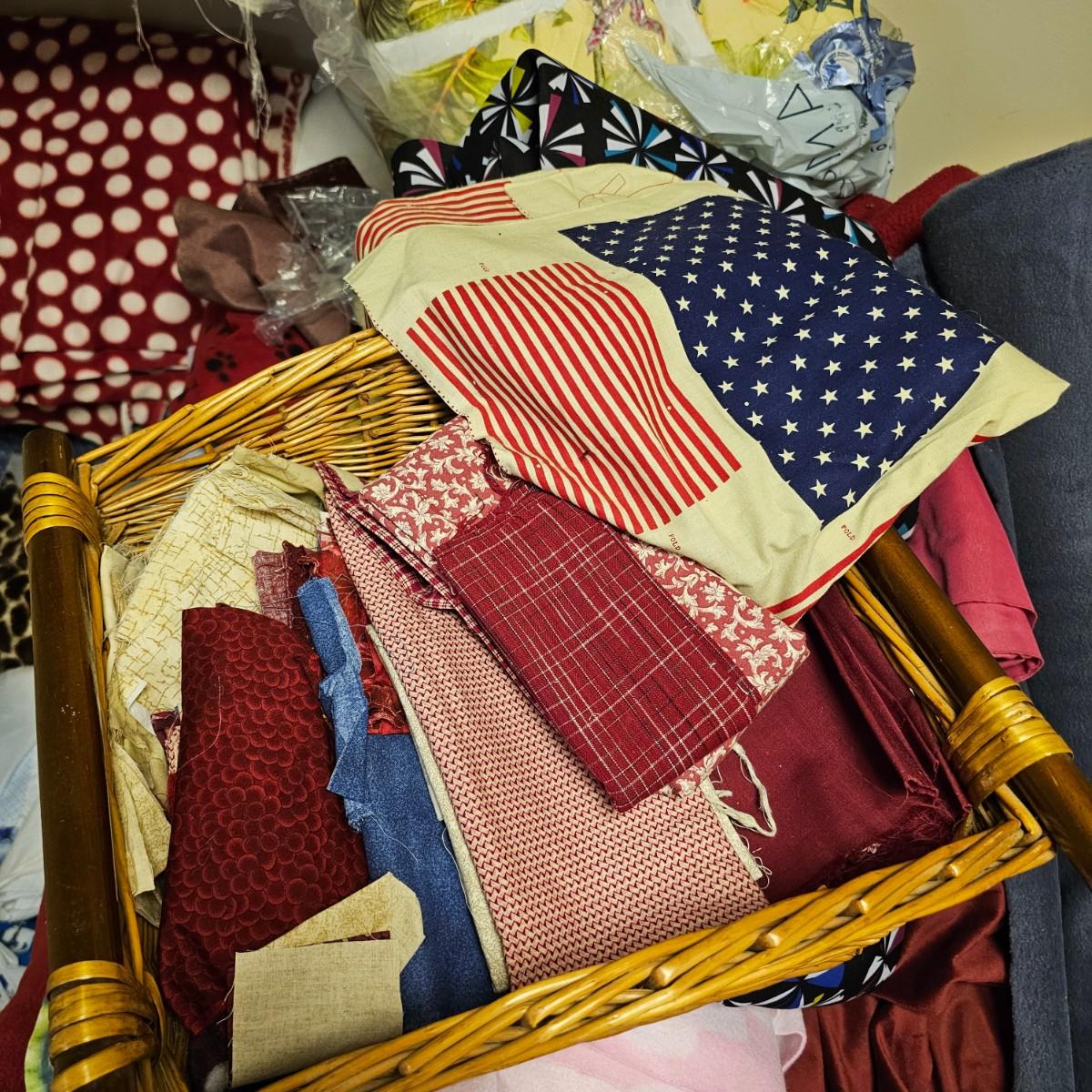 If it's soft and fluffy it is probably in this batch. All manner of blanket type fabric with lots of colors, patterns, sports team logos and more. Pieces for quilt backs or other uses. Also includes velveteen, some leather and many pieces already backed with batting. Several projects in work as well. Long rolls of red and blue are 62" wide, length indeterminate. Any items in tubs or baskets, they are included. All fabric is sold as is, where is. Winning bidder must bring their own boxes, bags or tubs and pack their winnings for removal. See photos for details. Local pickup only.