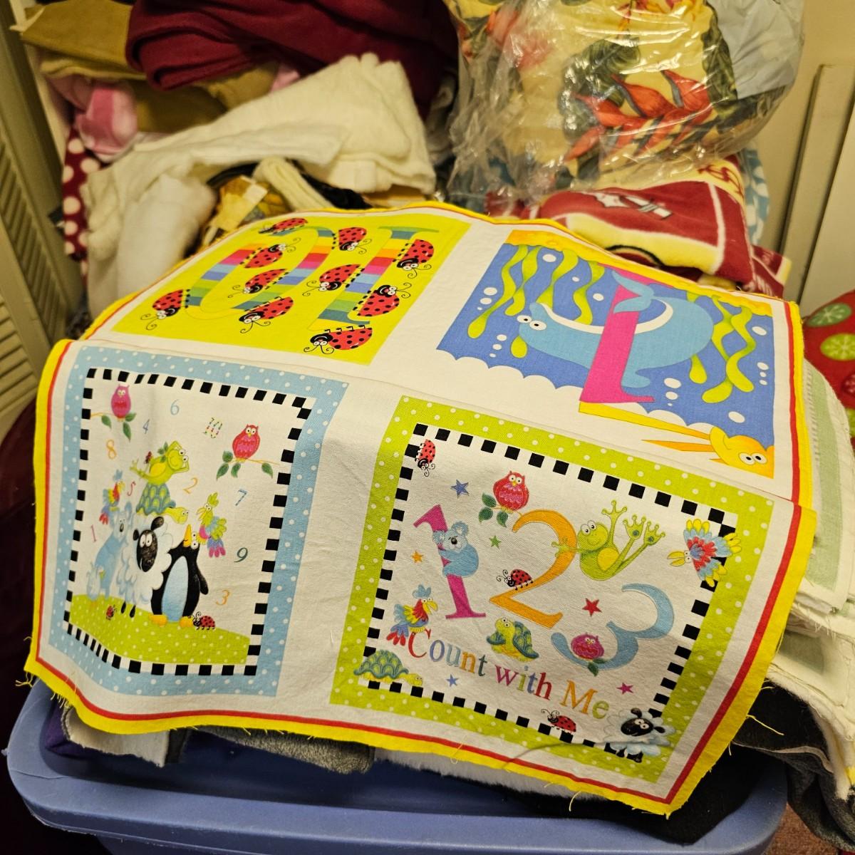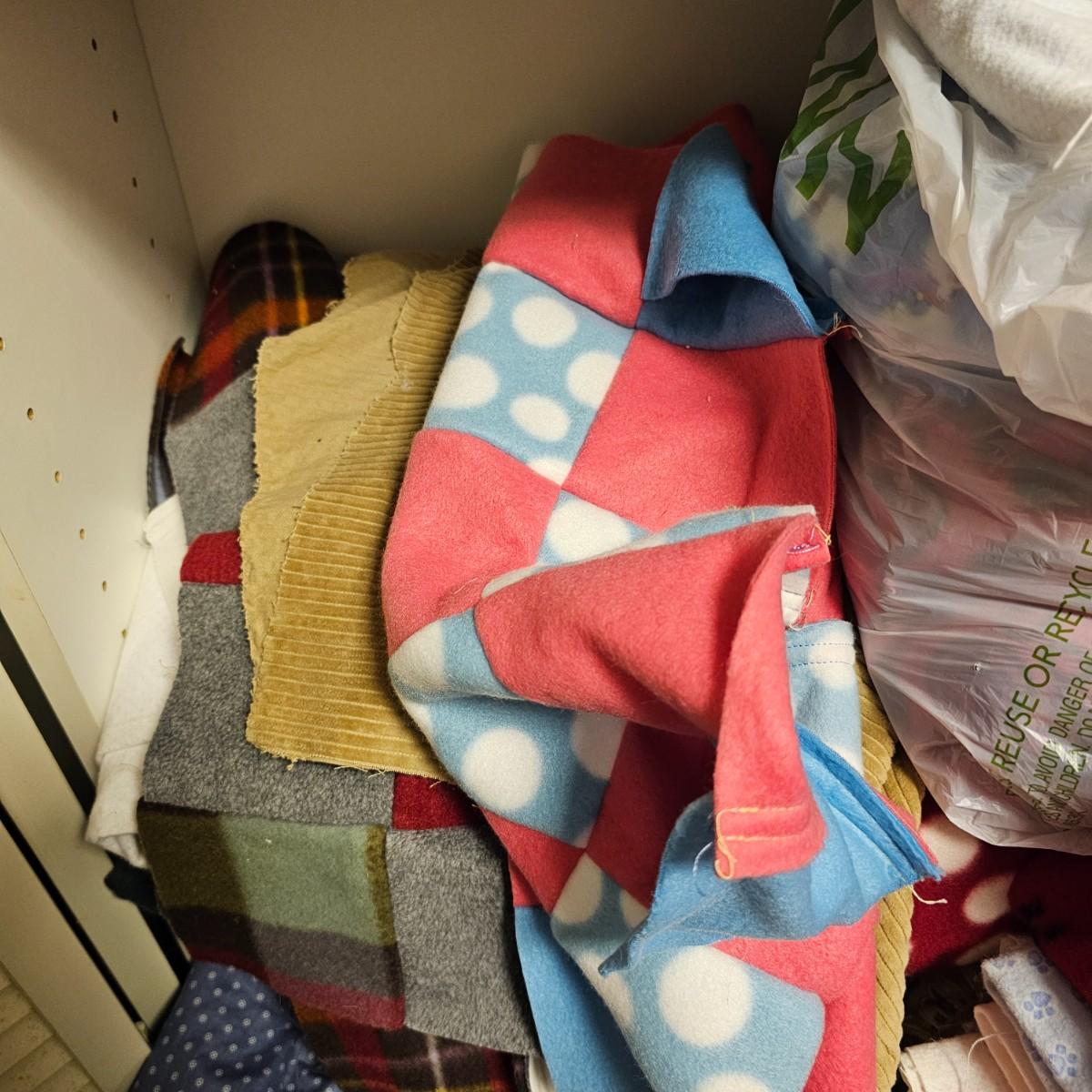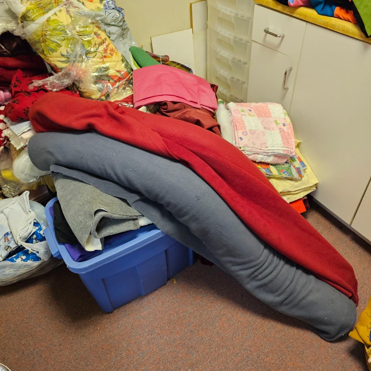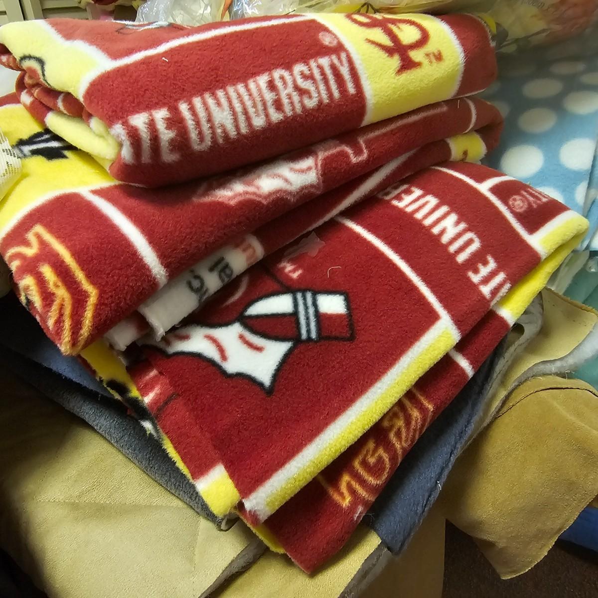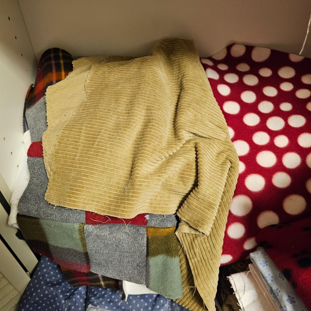 If it's soft and fluffy it is probably in this batch. All manner of blanket type fabric with lots of colors, patterns, sports team logos and more. Pieces for quilt backs or other uses. Also includes velveteen, some leather and many pieces already backed with batting. Several projects in work as well. Long rolls of red and blue are 62" wide, length indeterminate. Any items in tubs or baskets, they are included. All fabric is sold as is, where is. Winning bidder must bring their own boxes, bags or tubs and pack their winnings for removal. See photos for details. Local pickup only.