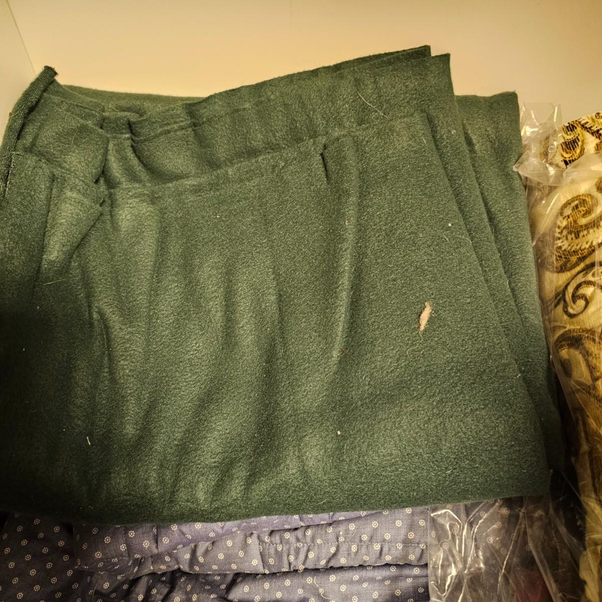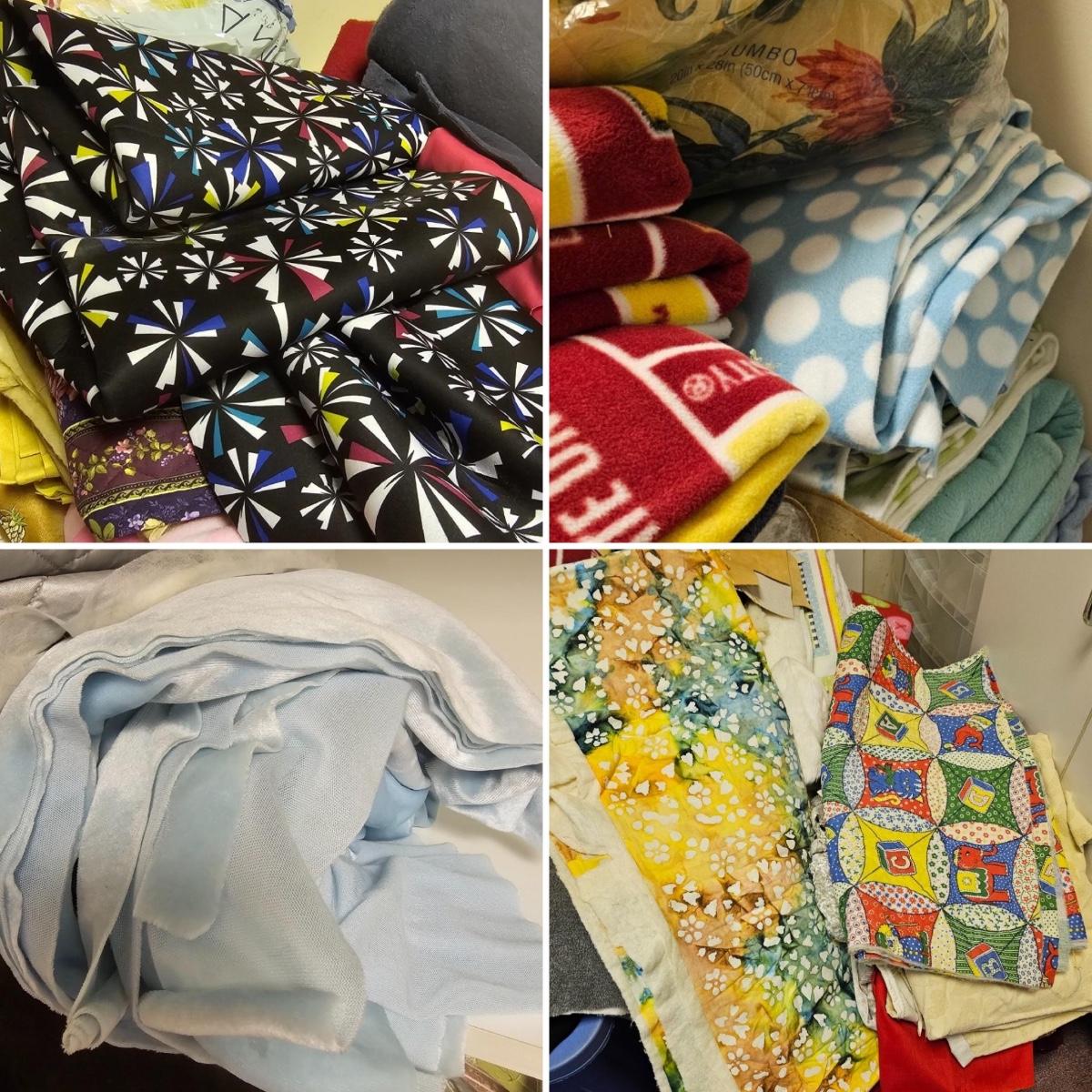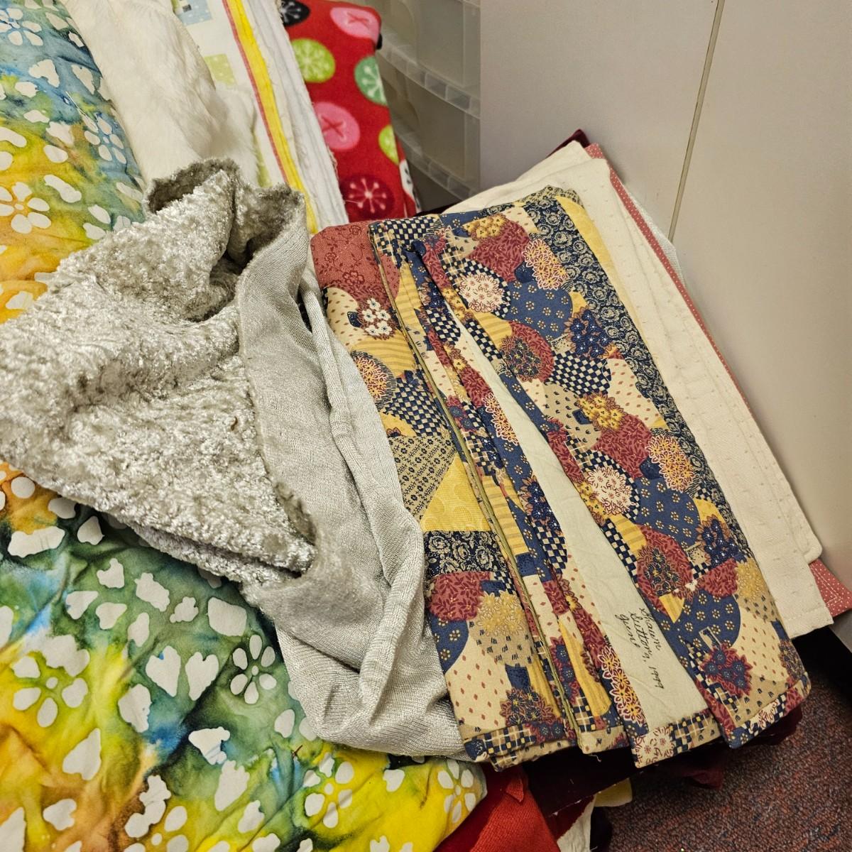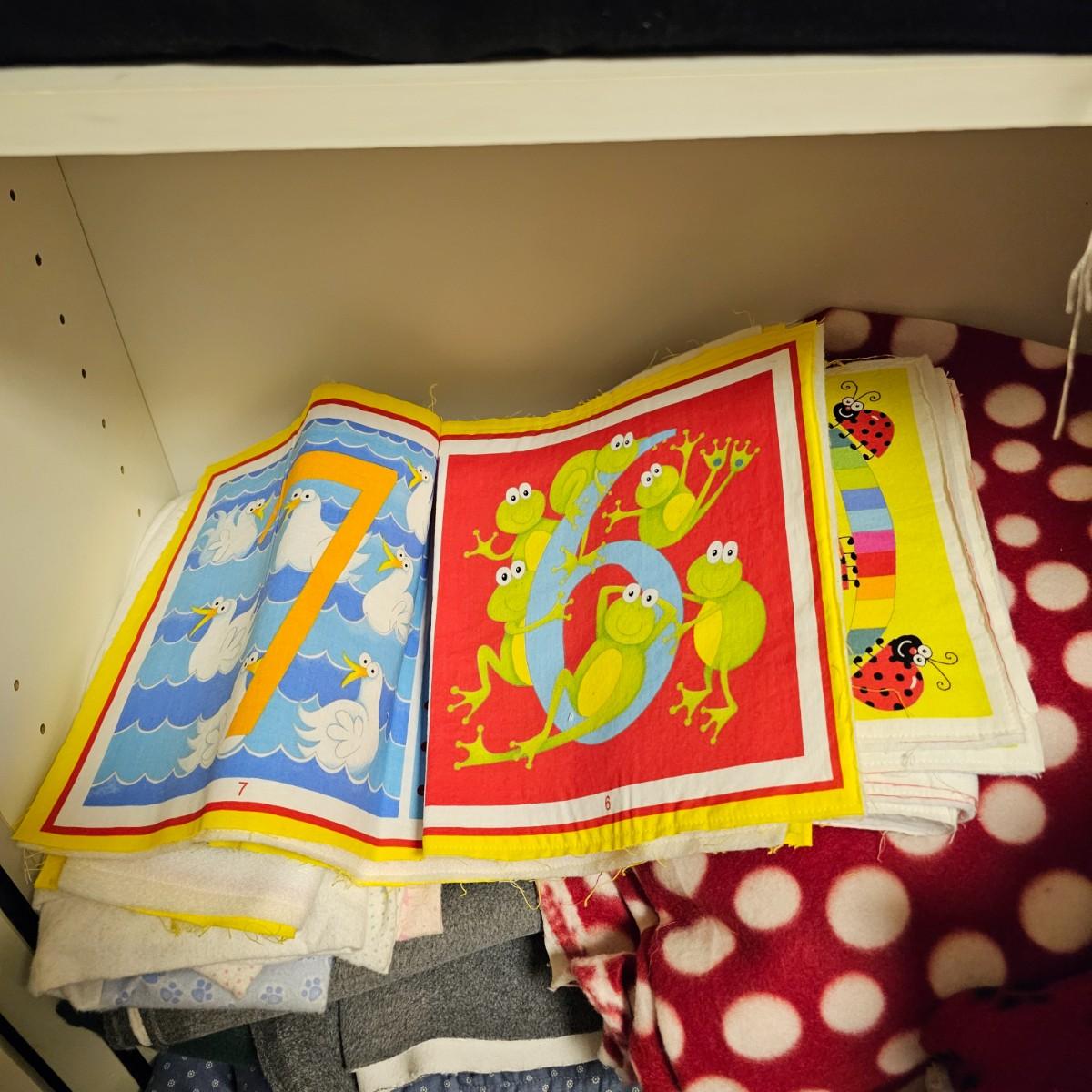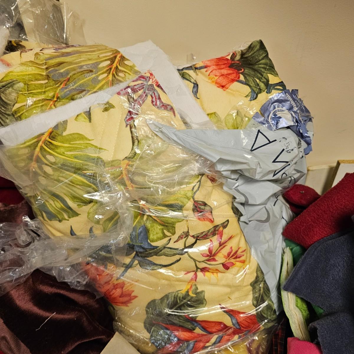 If it's soft and fluffy it is probably in this batch. All manner of blanket type fabric with lots of colors, patterns, sports team logos and more. Pieces for quilt backs or other uses. Also includes velveteen, some leather and many pieces already backed with batting. Several projects in work as well. Long rolls of red and blue are 62" wide, length indeterminate. Any items in tubs or baskets, they are included. All fabric is sold as is, where is. Winning bidder must bring their own boxes, bags or tubs and pack their winnings for removal. See photos for details. Local pickup only.