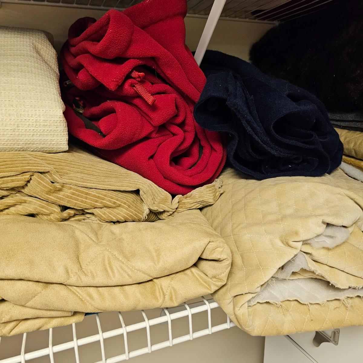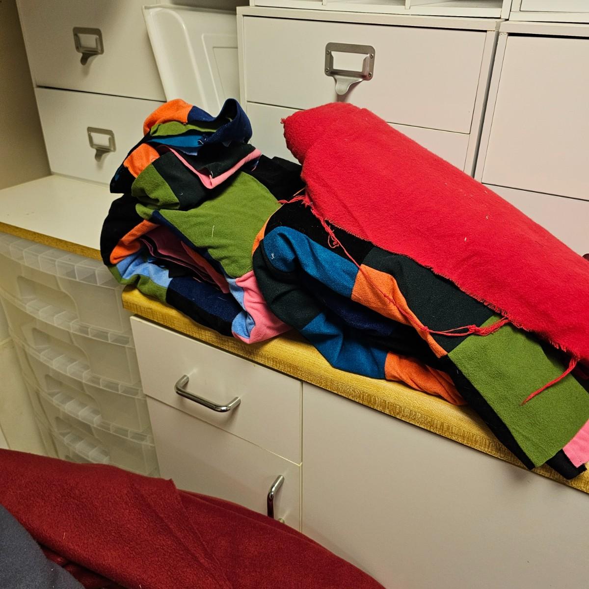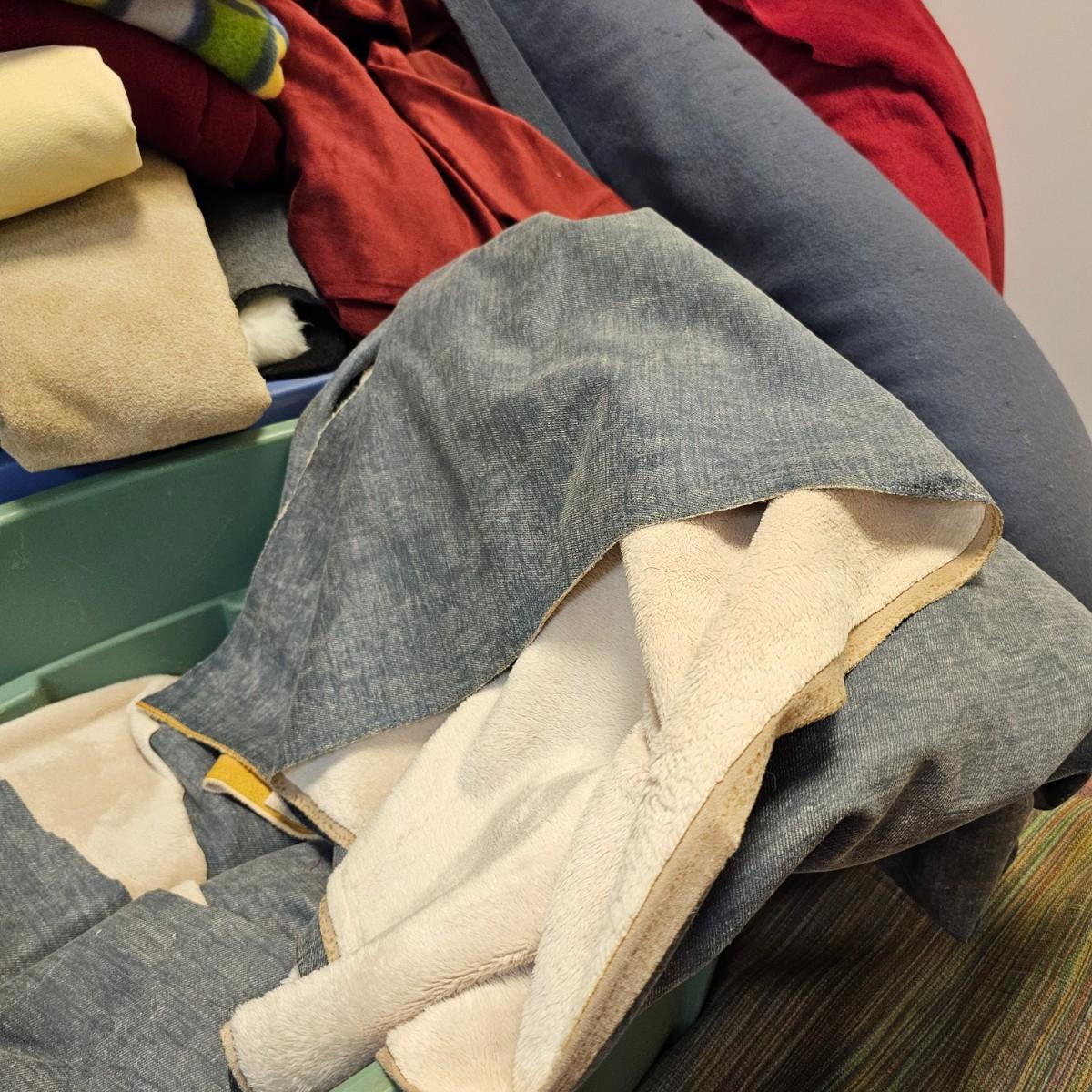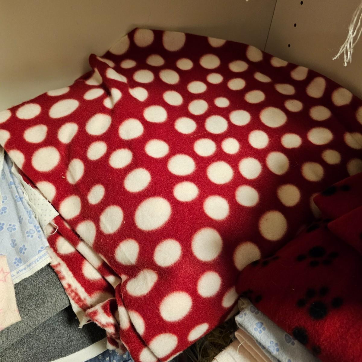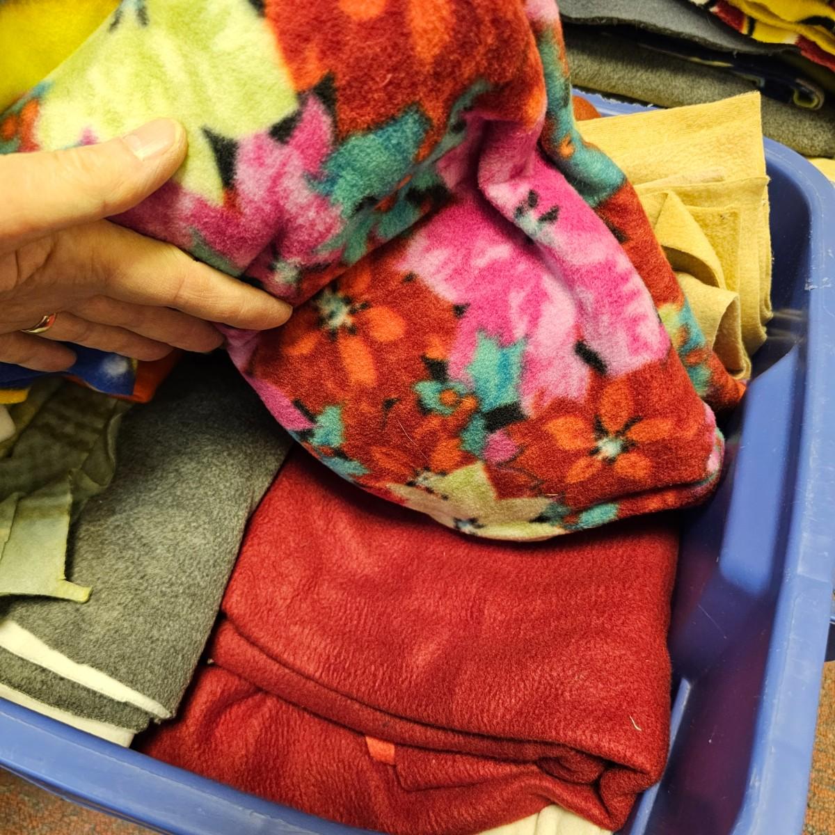 If it's soft and fluffy it is probably in this batch. All manner of blanket type fabric with lots of colors, patterns, sports team logos and more. Pieces for quilt backs or other uses. Also includes velveteen, some leather and many pieces already backed with batting. Several projects in work as well. Long rolls of red and blue are 62" wide, length indeterminate. Any items in tubs or baskets, they are included. All fabric is sold as is, where is. Winning bidder must bring their own boxes, bags or tubs and pack their winnings for removal. See photos for details. Local pickup only.