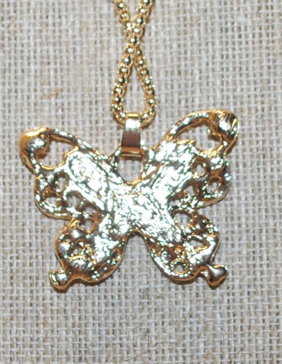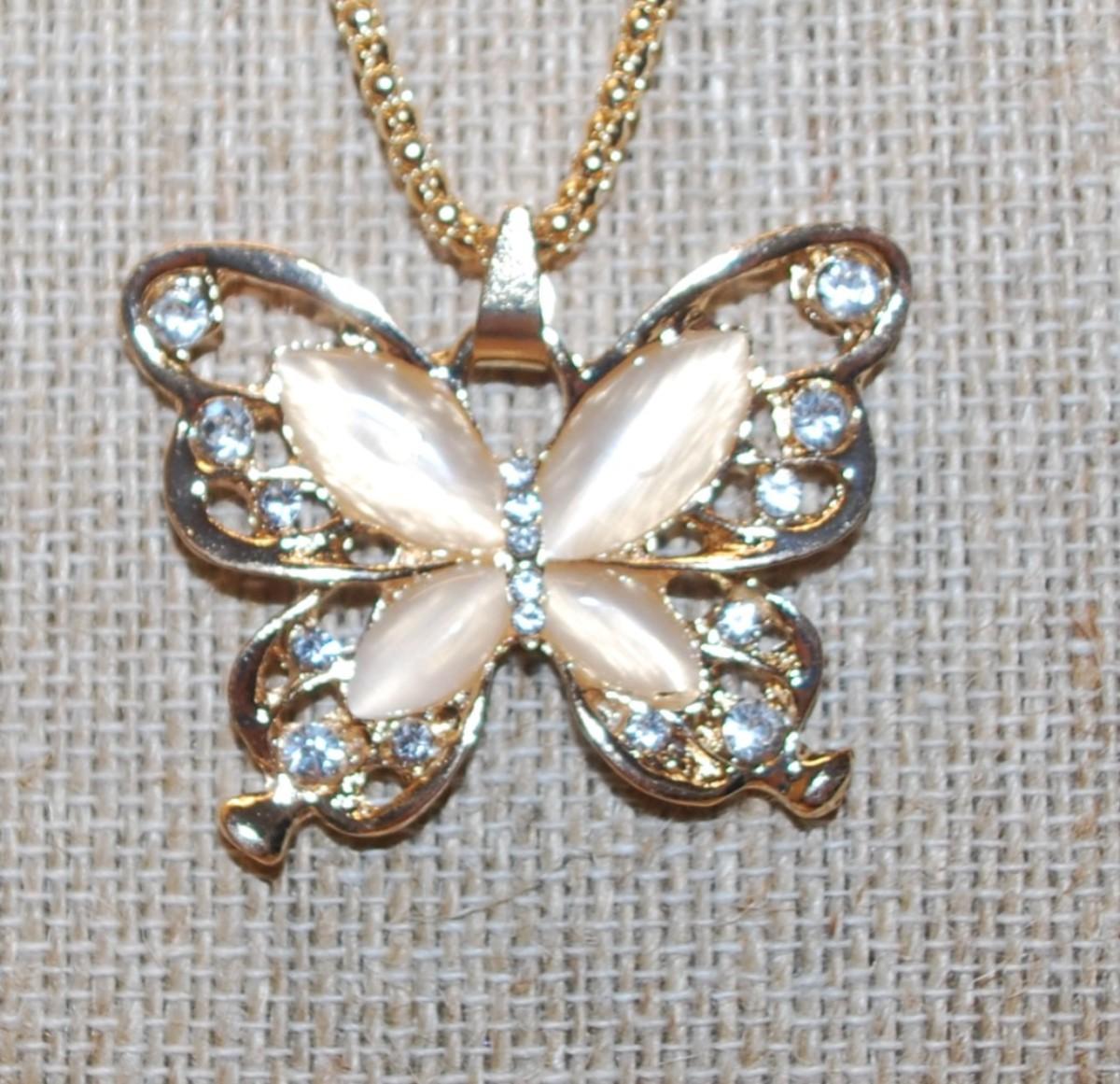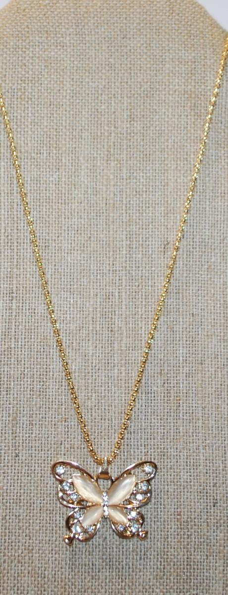 Flesh Colored Main Stones Butterfly PENDANT (1½" x 1¼") with Clear Stone Accents on a Gold Tone Necklace Chain 27" L