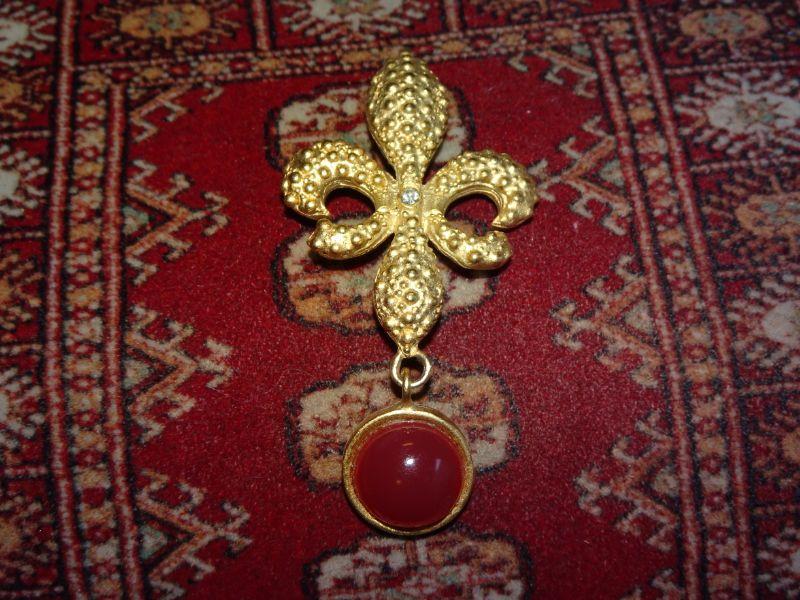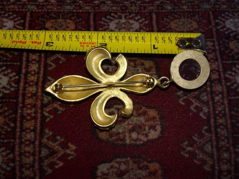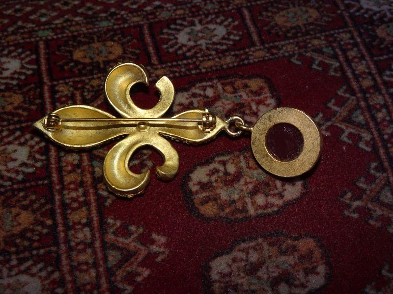 Fleur De Lis Gold Tone Brooch w/dangle pendant