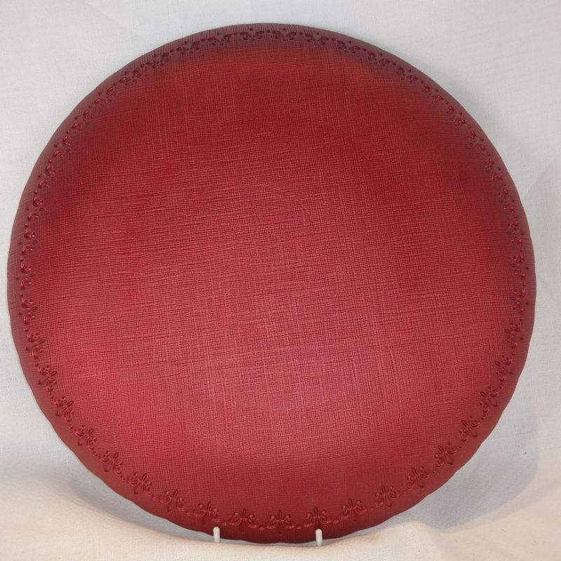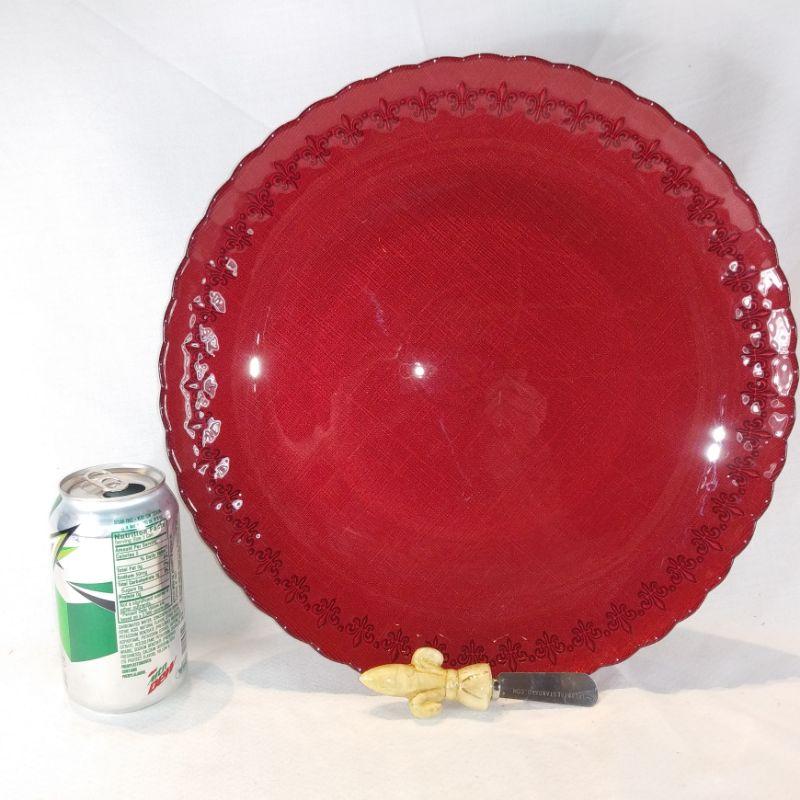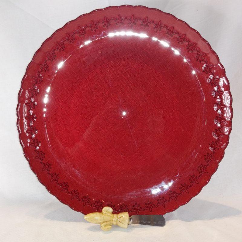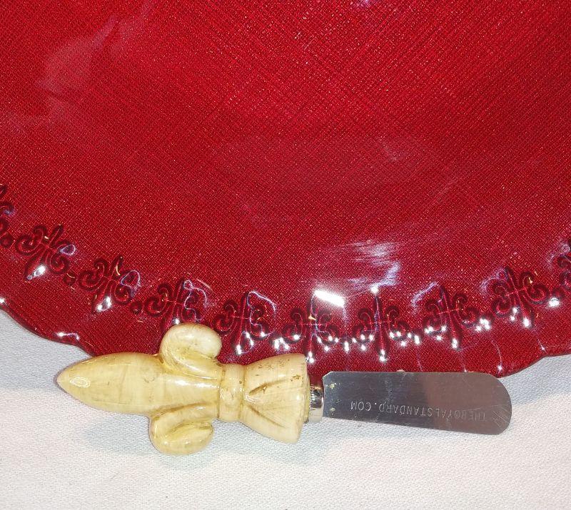 A large, red, serving platter with coordinating spreader for the Fleur de Lis lovers out there. The platter is 14-inches in diameter and shows little to no wear. The back of the platter has a linen effect that shows thru very nicely. No chips or cracks. Ready to serve your Brie Cheese Wheel with matching Fleur de Lis spreader. Very showy.