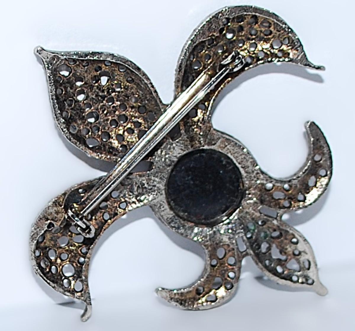 Fleur-de-Lis Style BLACK BROOCH (2½" x 2¼") with Hollowed Design on a Dark Silver Tone Setting