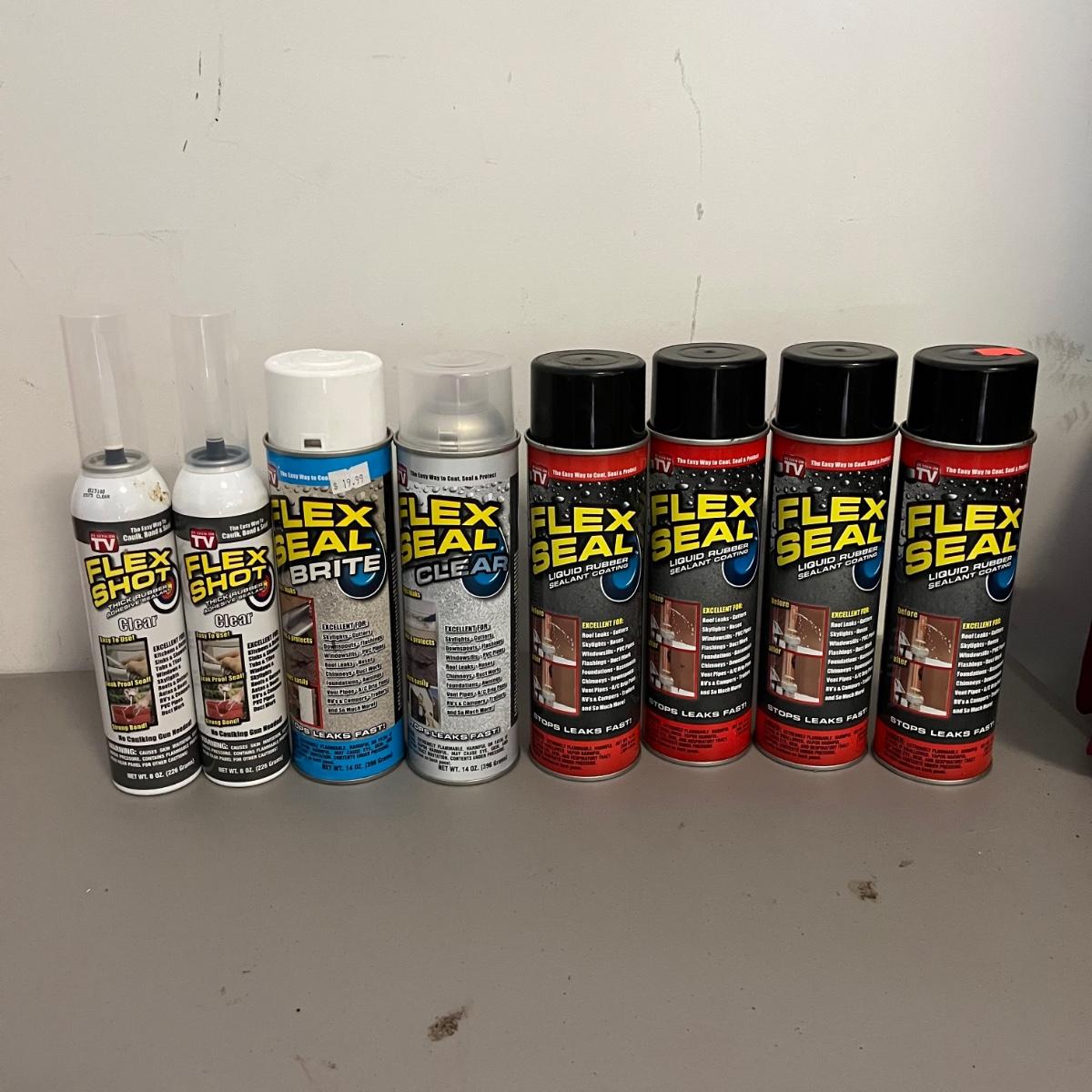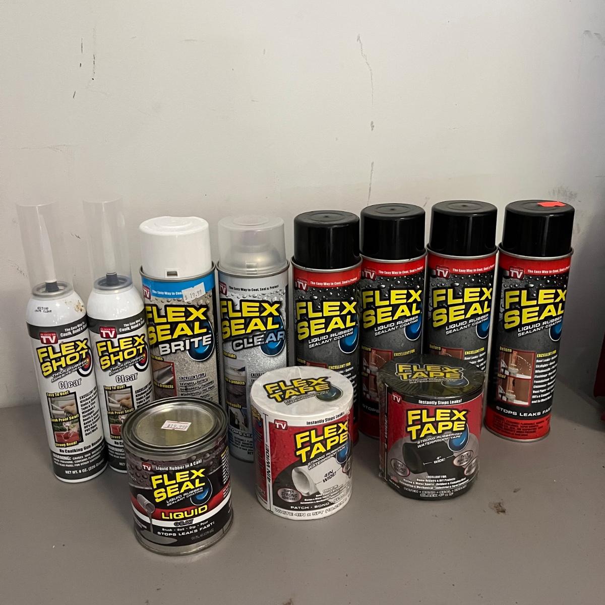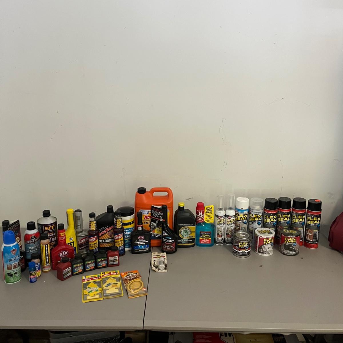 Lot includes eight cans of Flex Seal, two Flex Tapes, five bottles of two cycle oil, fuel cleaners, antifreeze and more. That are all new.