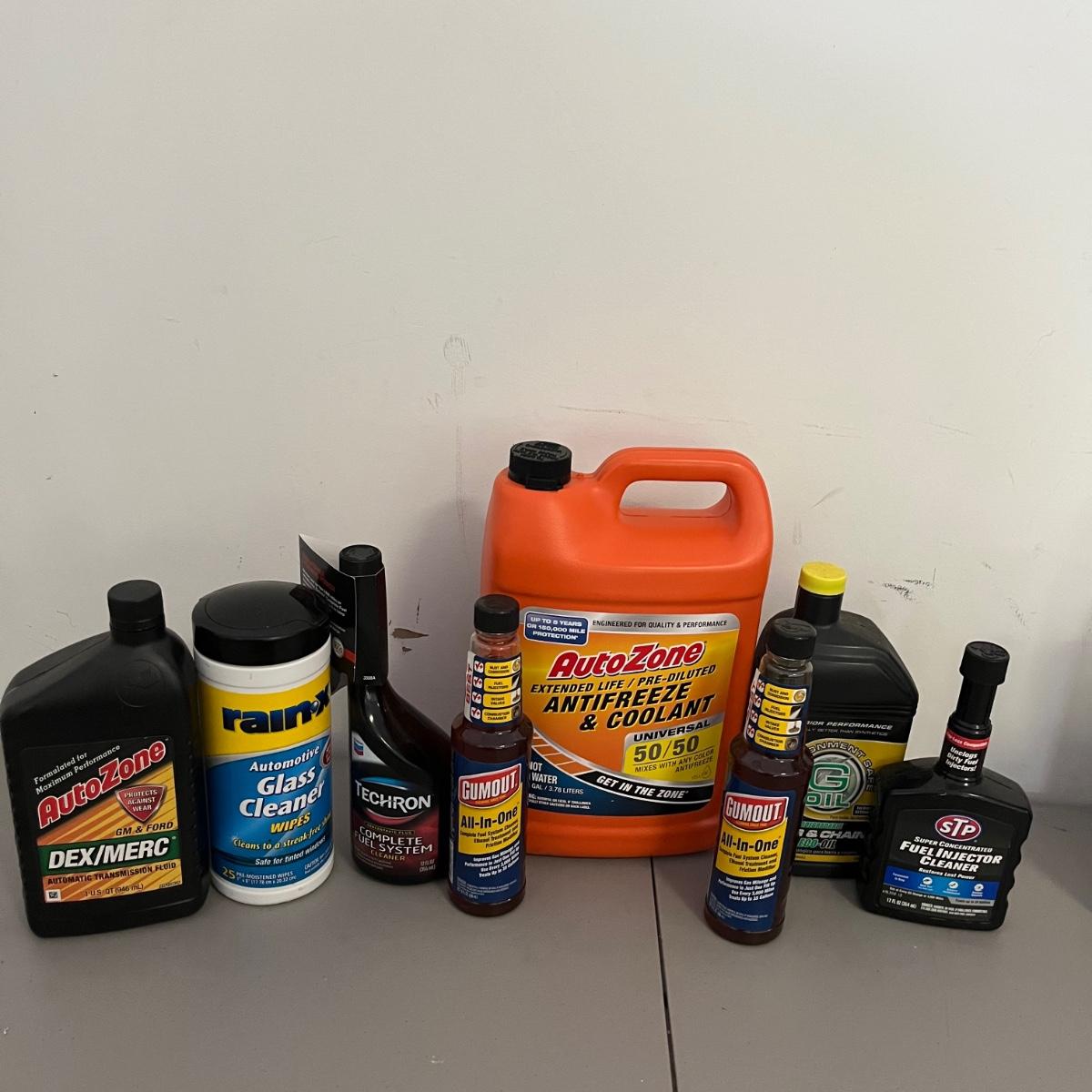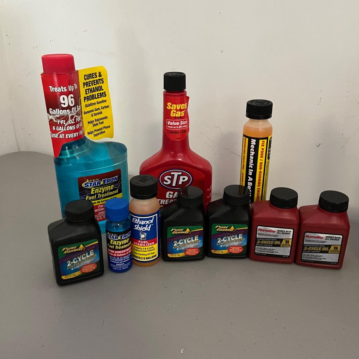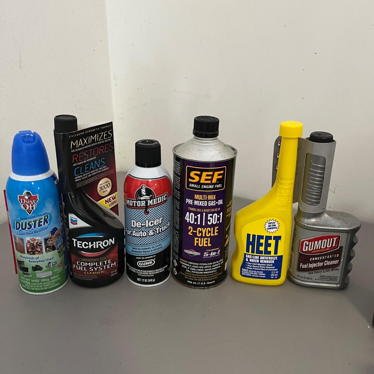 Lot includes eight cans of Flex Seal, two Flex Tapes, five bottles of two cycle oil, fuel cleaners, antifreeze and more. That are all new.