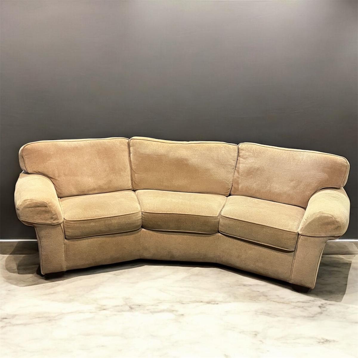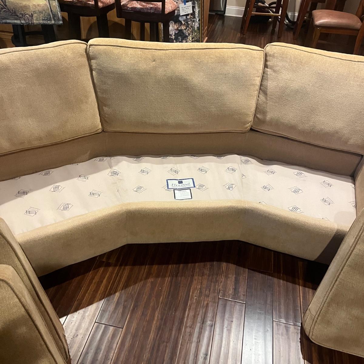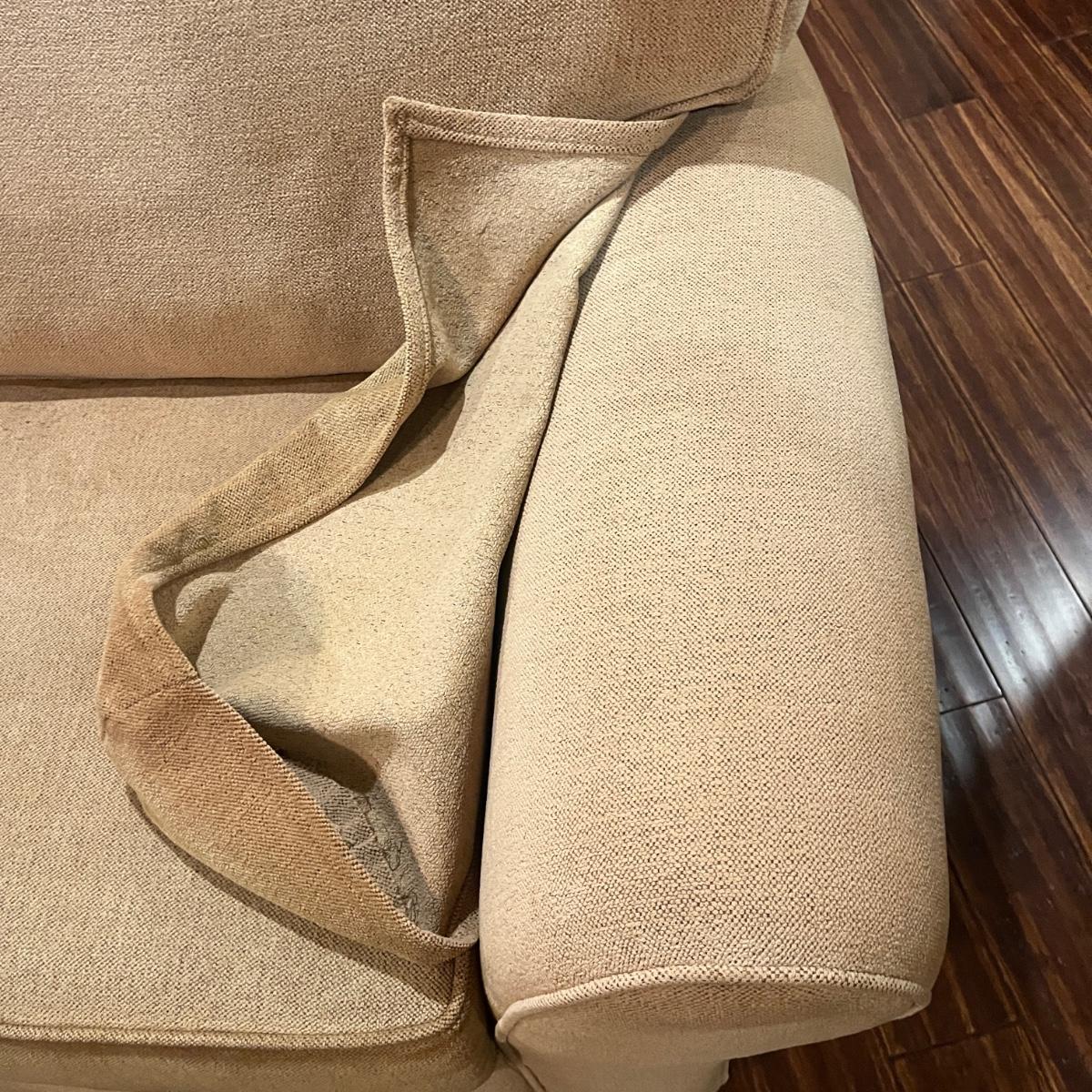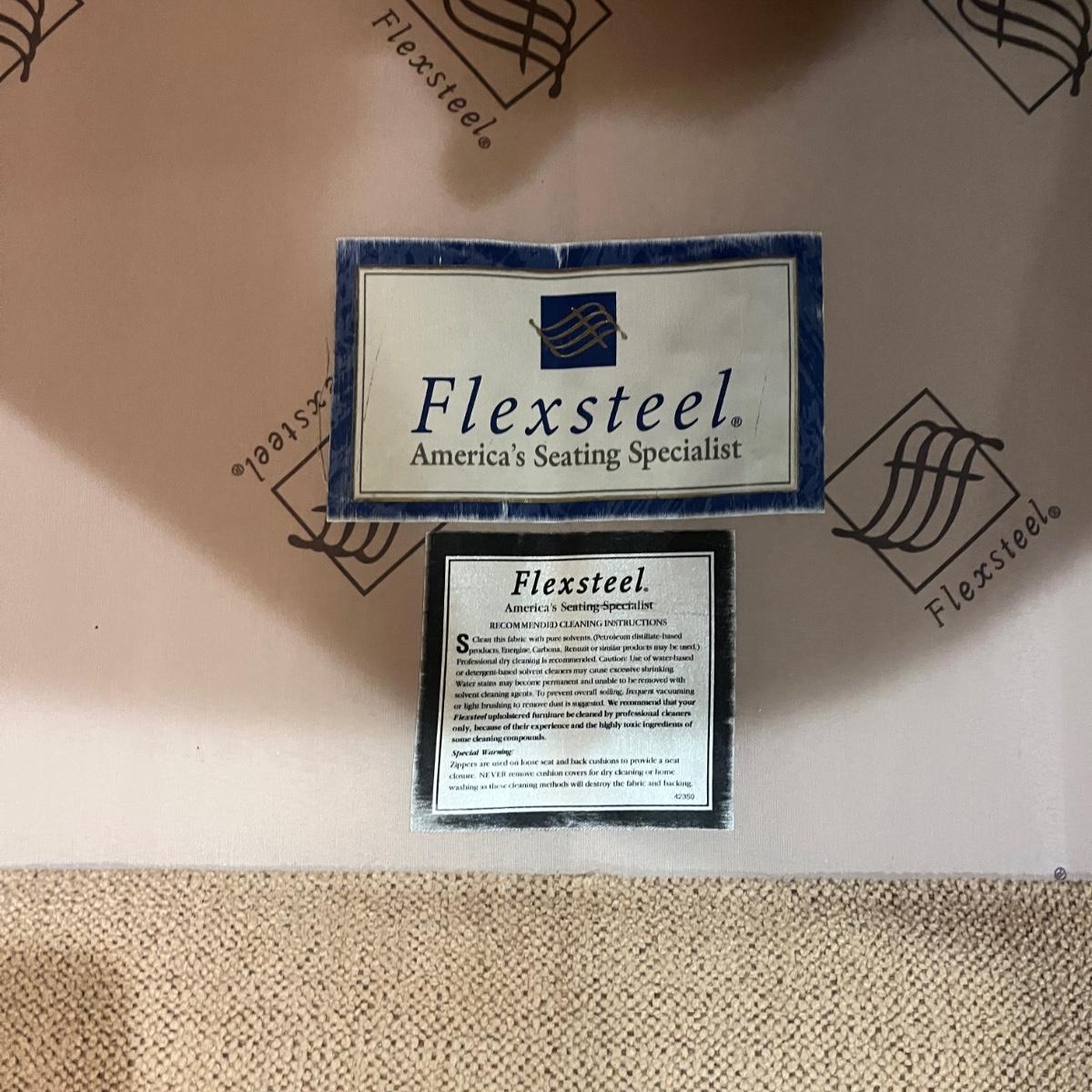Lot includes a fabric Flexsteel wedge sofa with two matching arm covers. Sofa measures 98” x 36” x 33”H with a 18”seat height.