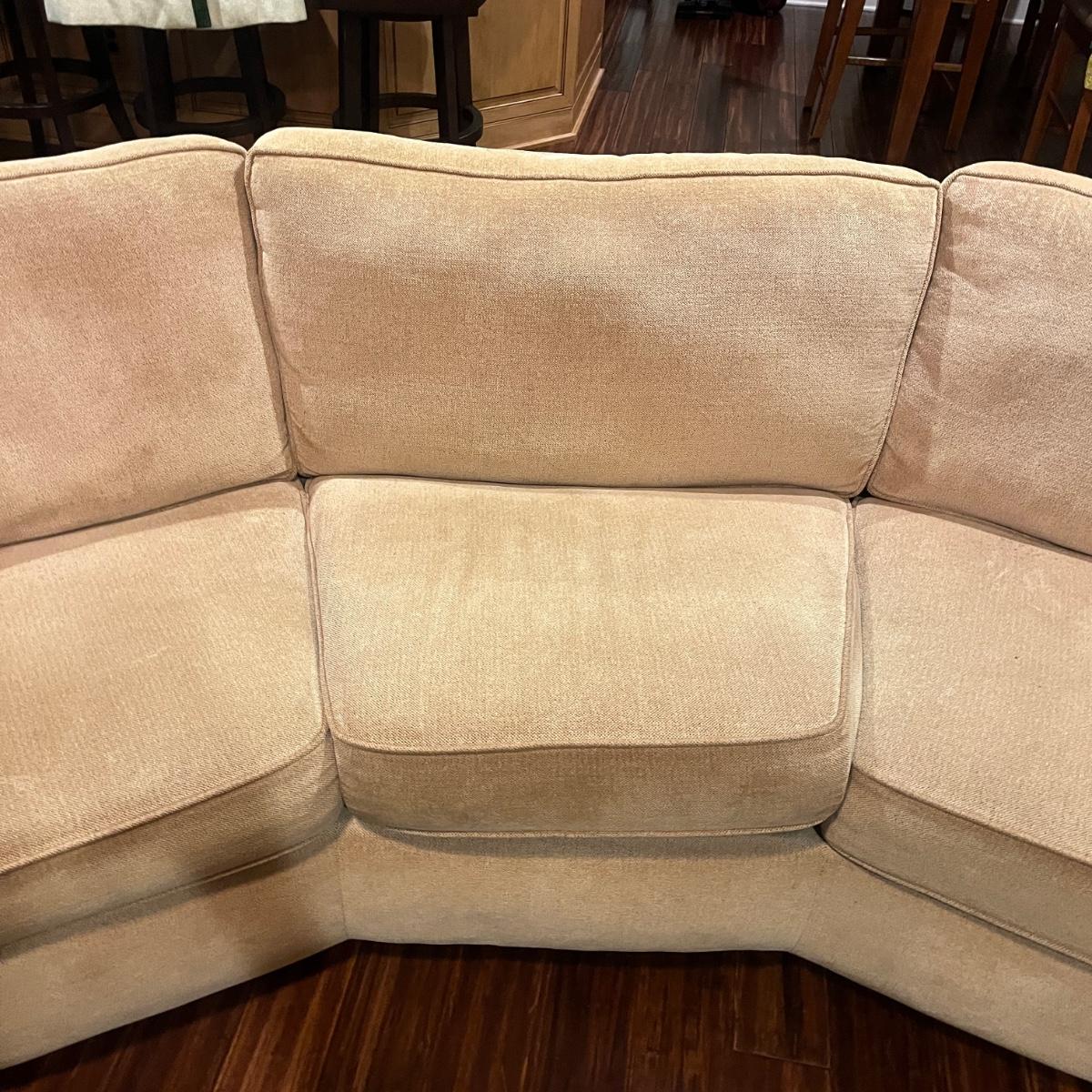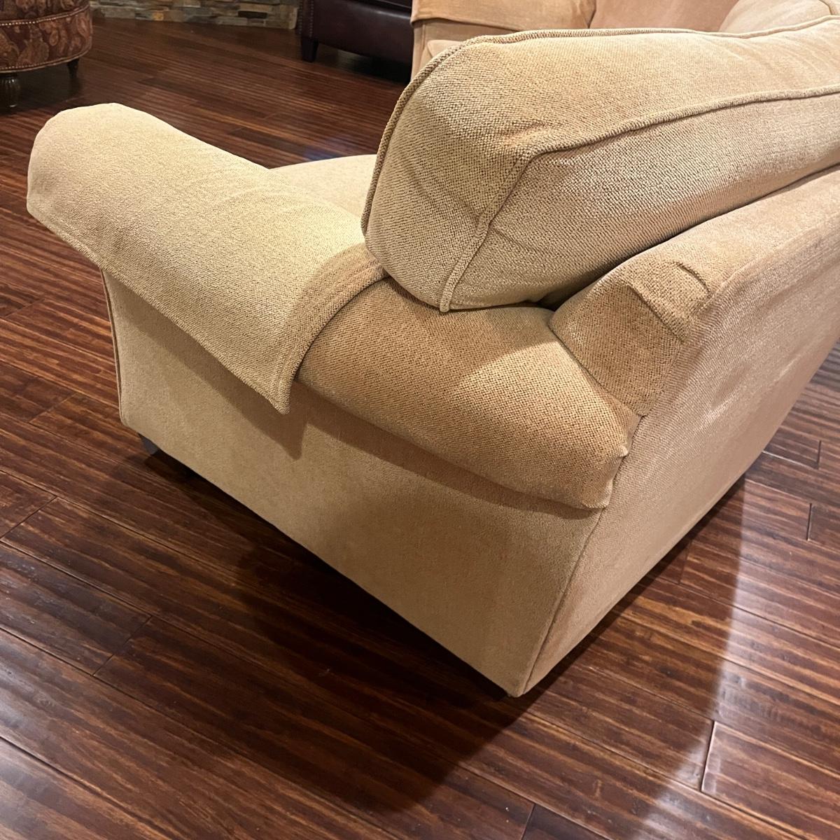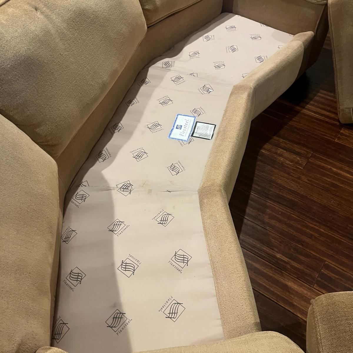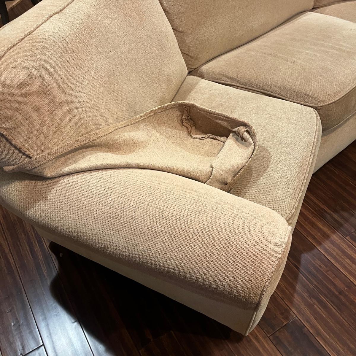 Lot includes a fabric Flexsteel wedge sofa with two matching arm covers. Sofa measures 98” x 36” x 33”H with a 18”seat height.