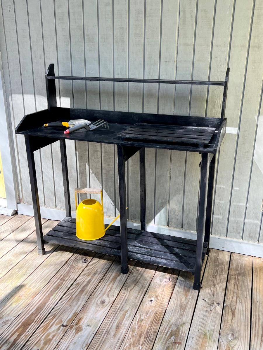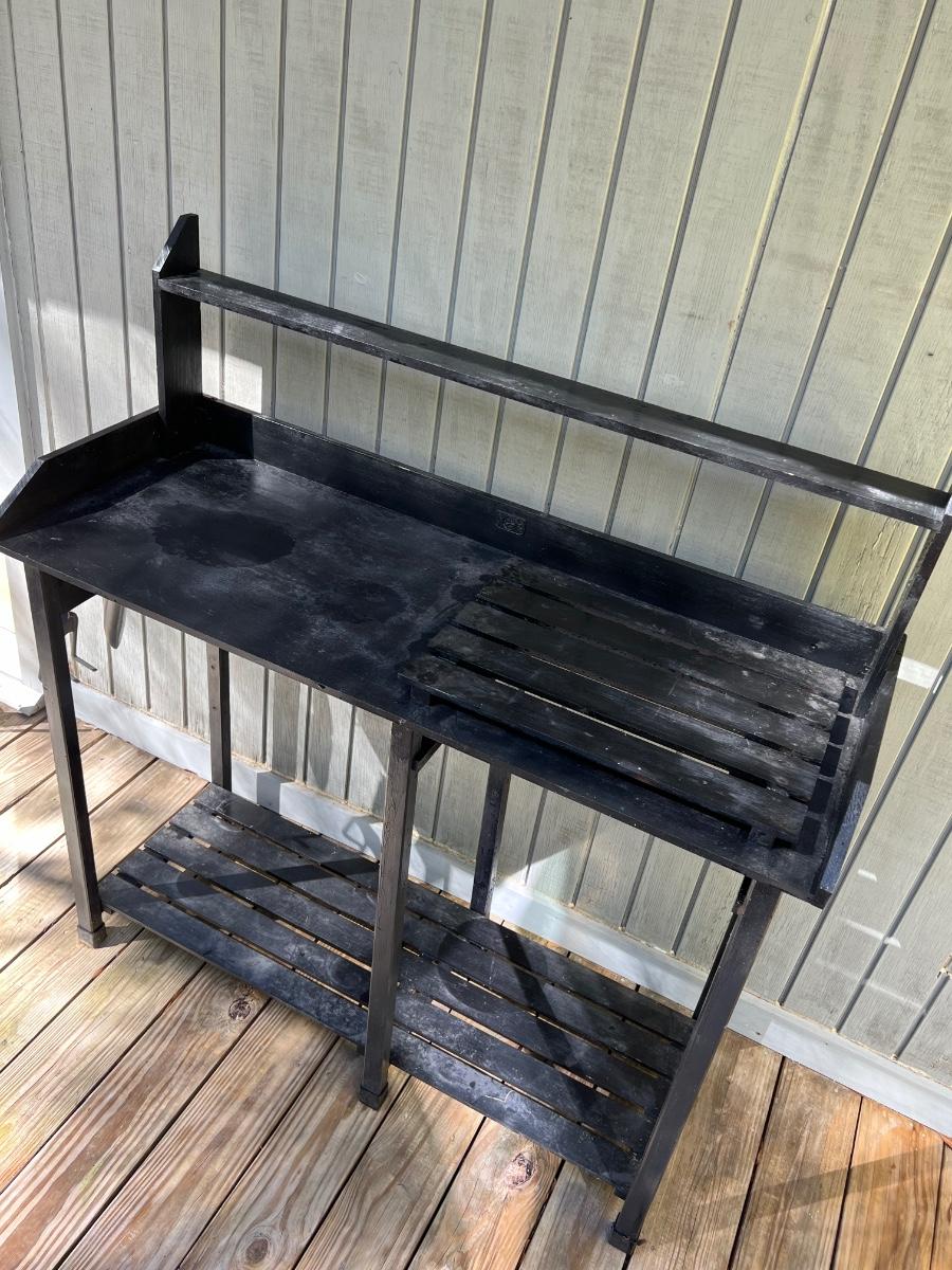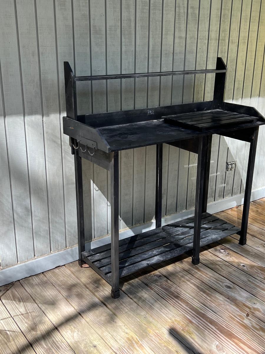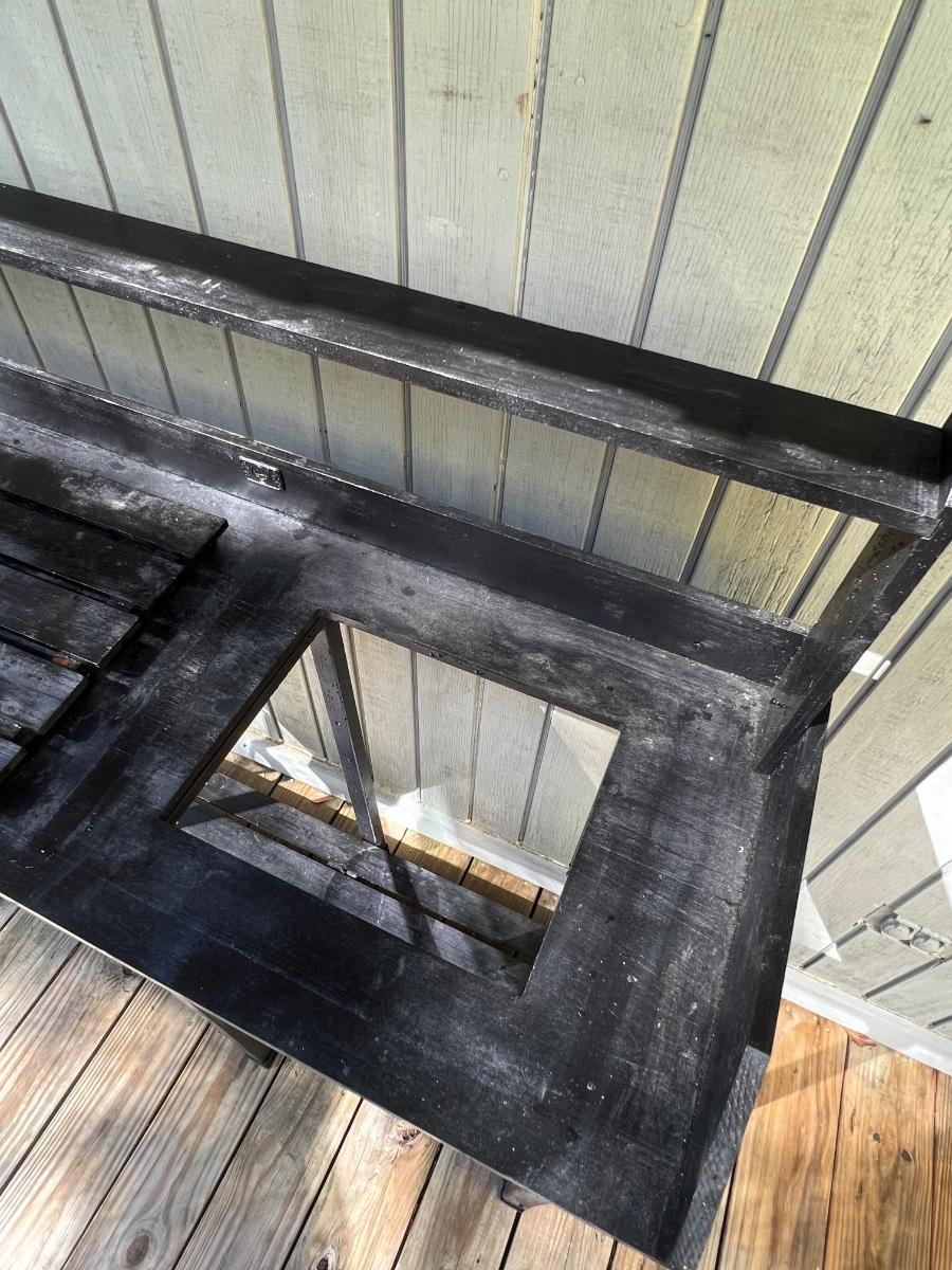 Porch kept, see photos for condition ~ accessories included ~ Table need to be tightened ~ Entire bench = 48” H x 46” W x 18” D ~ Table top = 46” W x 33” D ~ Top tier = 46” W x 3.5” D ~ The hole on table top = 12.25” W x 9.5” D