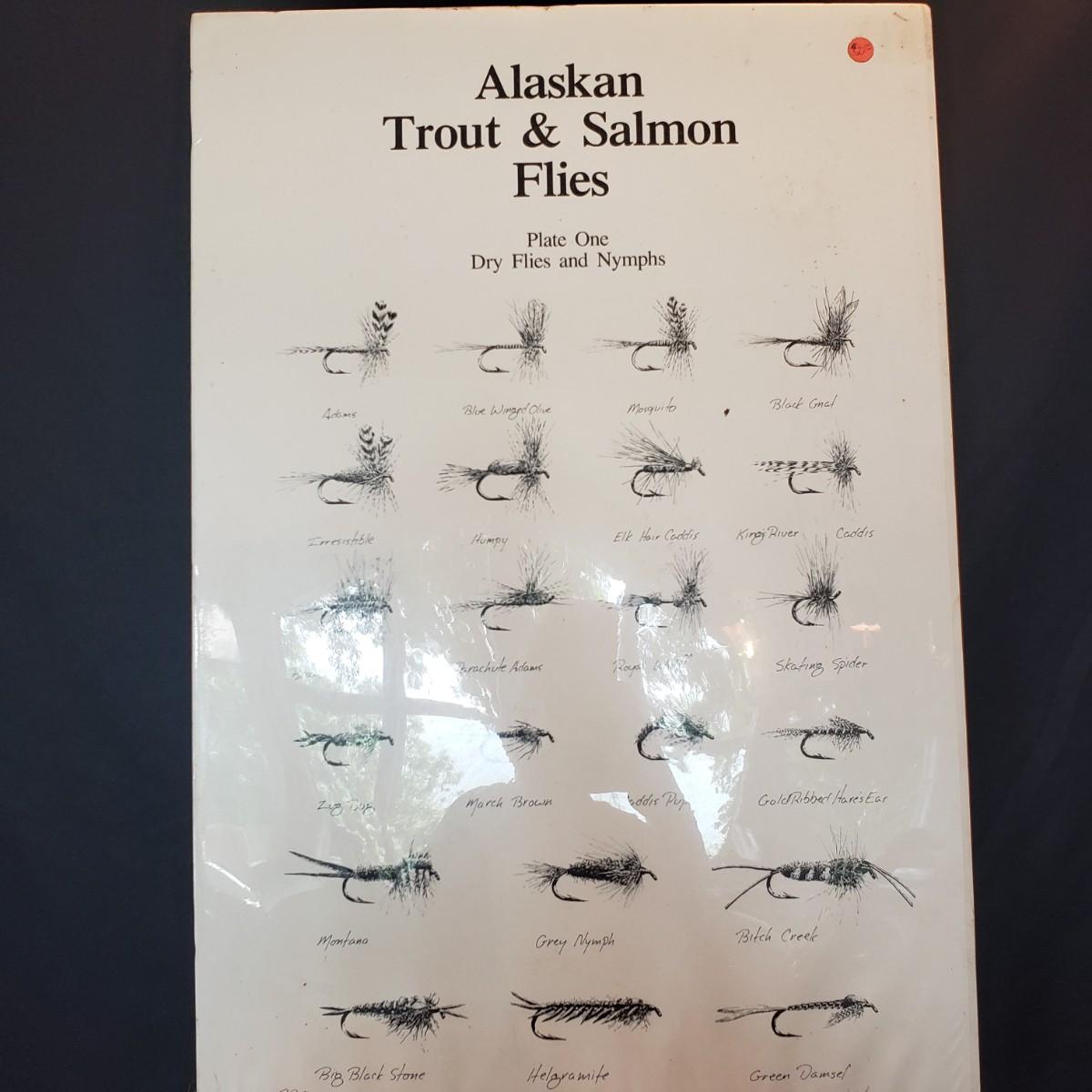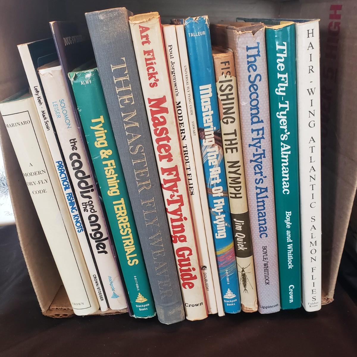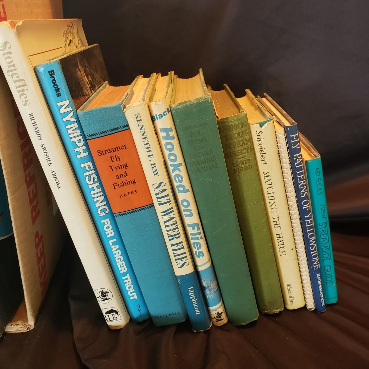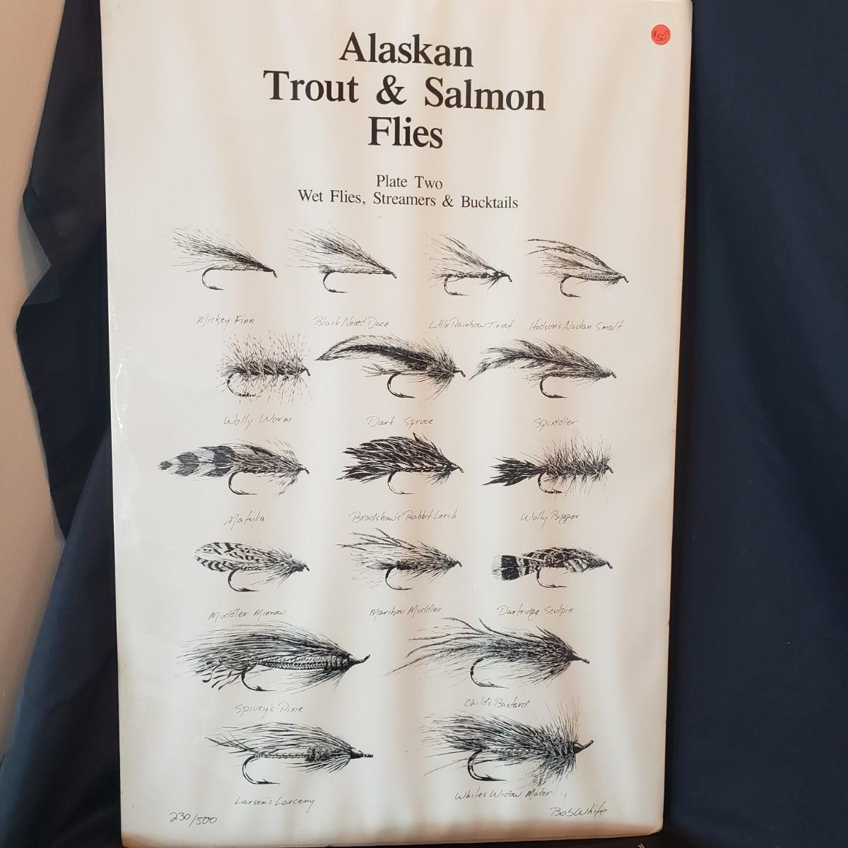 This lot has books about fly fishing and tying. See pictures for titles and examples of illustrations. Also included are two print posters by Bob White numbered 230/500, titled Alaskan Trout and Salmon Flies.