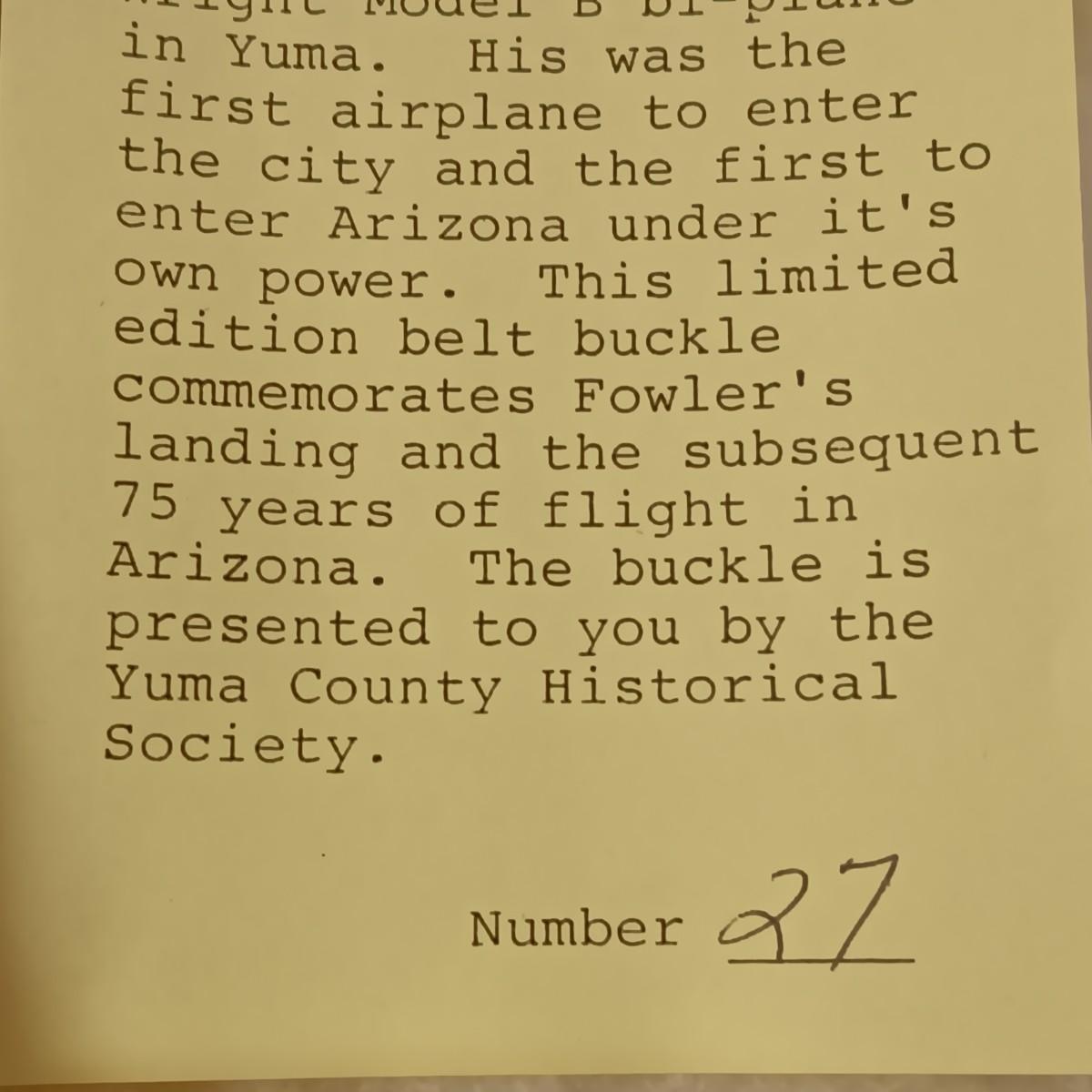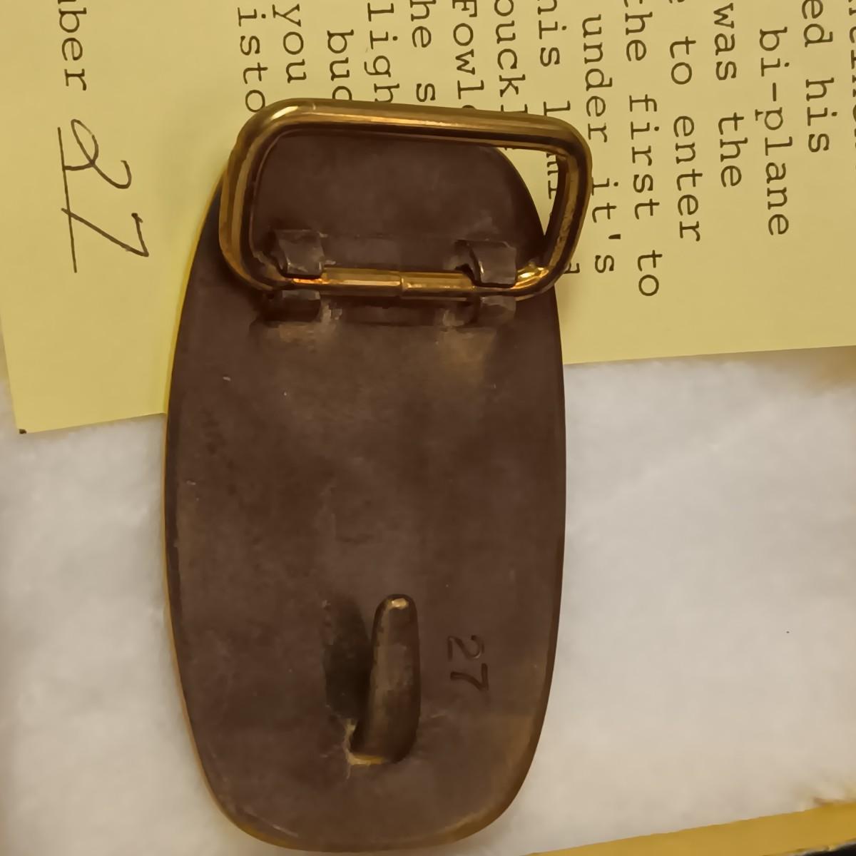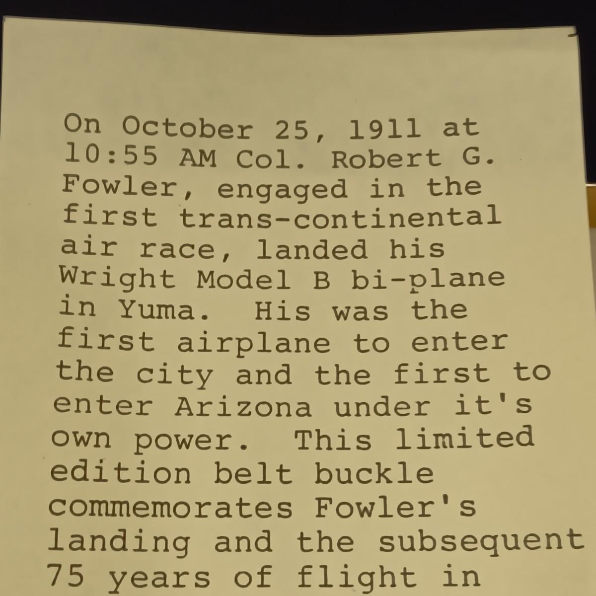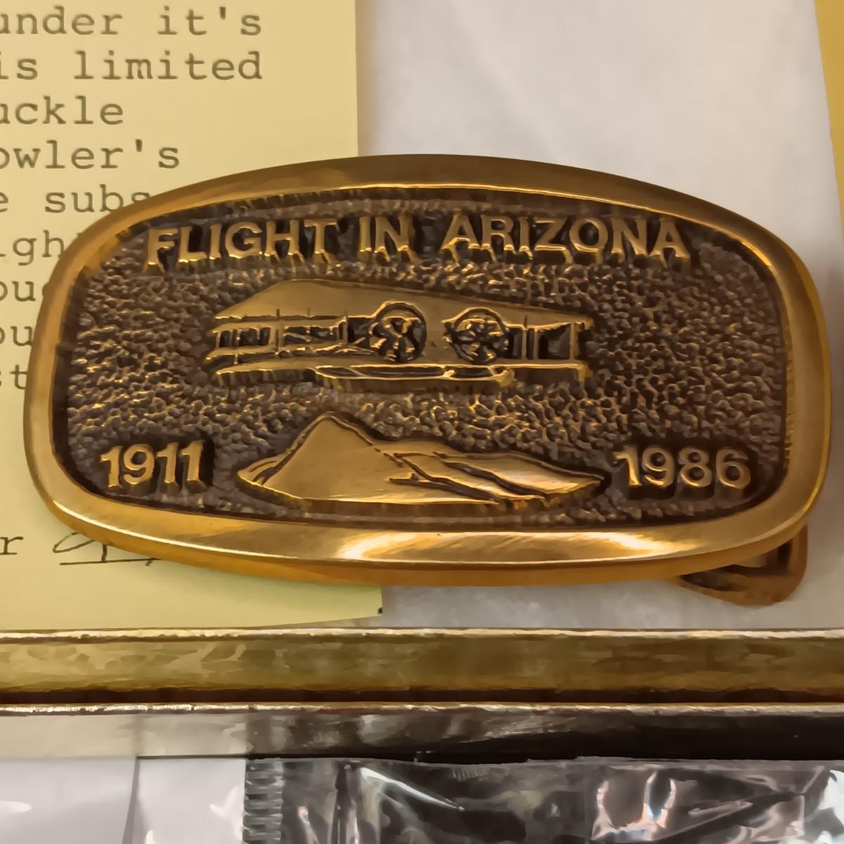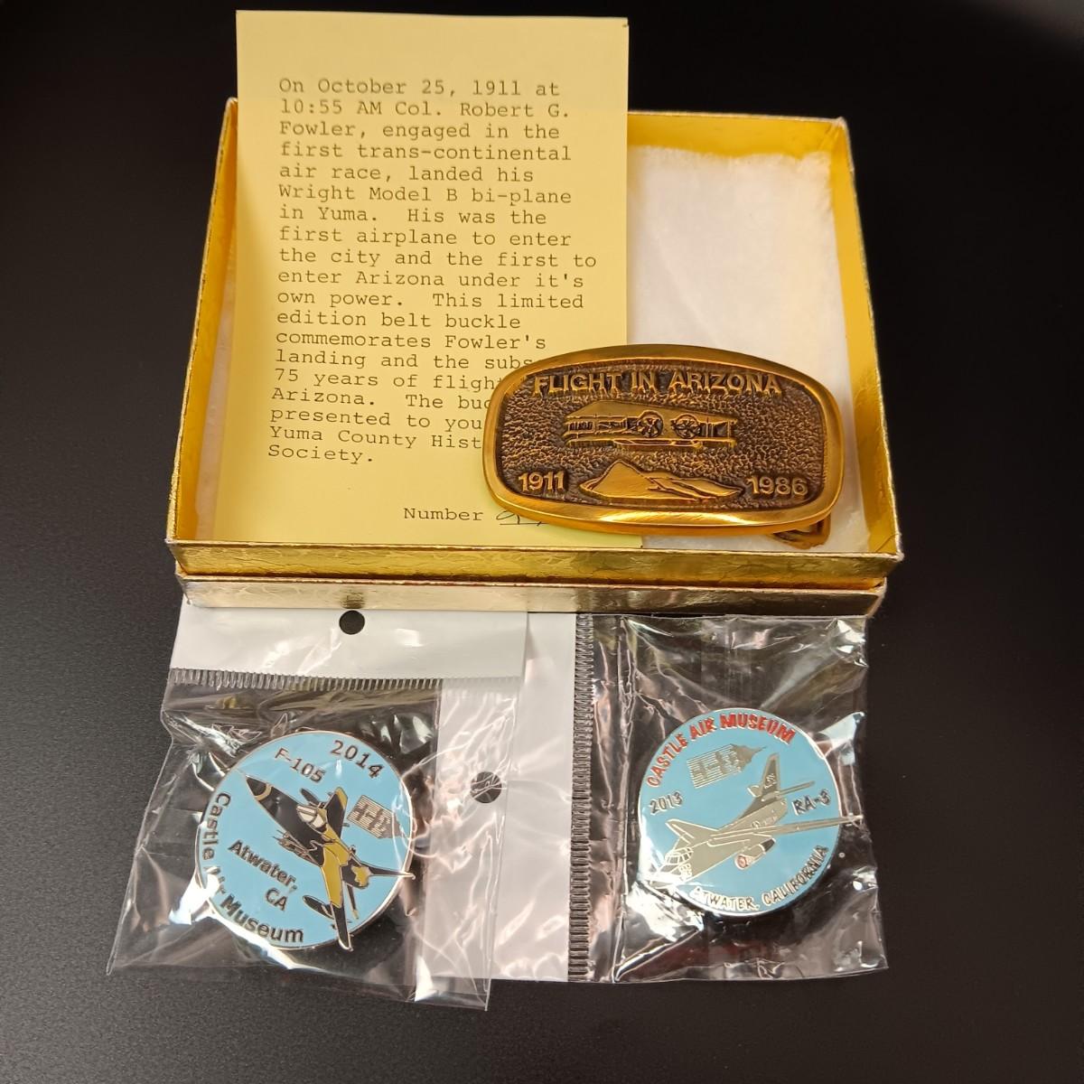 "FLIGHT IN ARIZONA" BRASS BELT BUCKLE AND 2 AVIATION PINS
