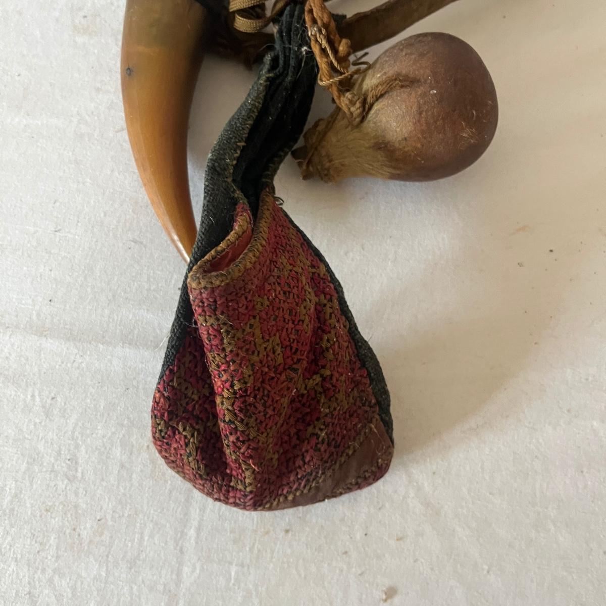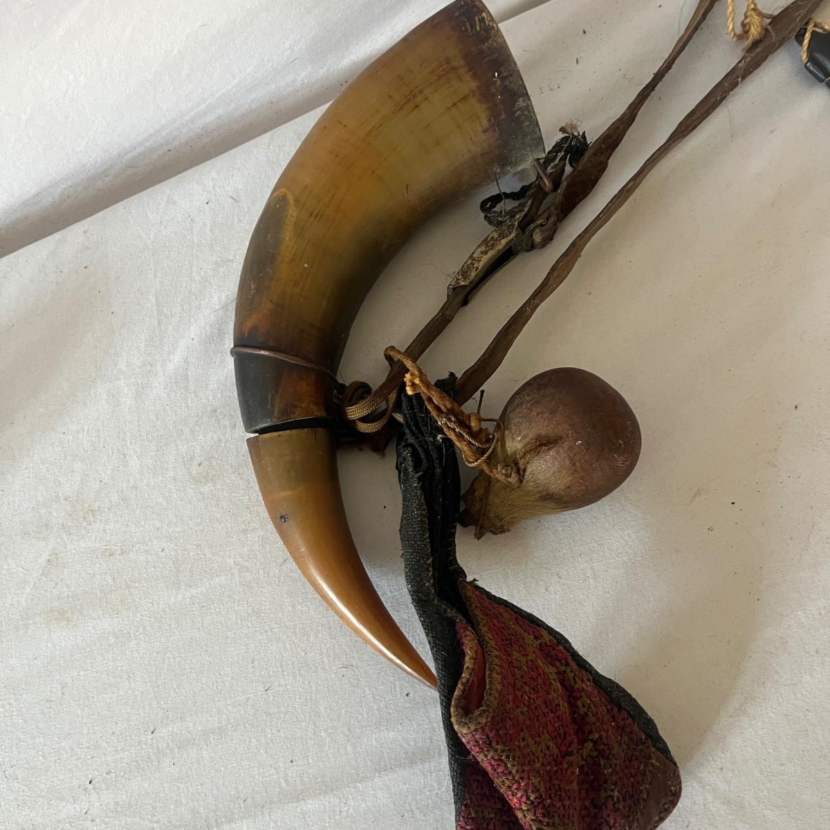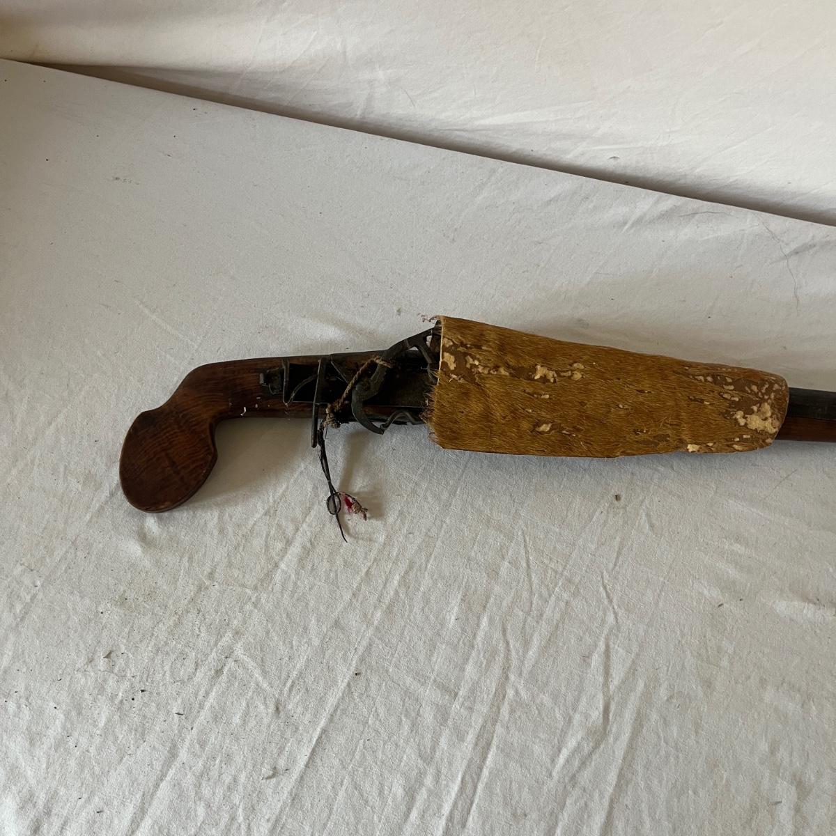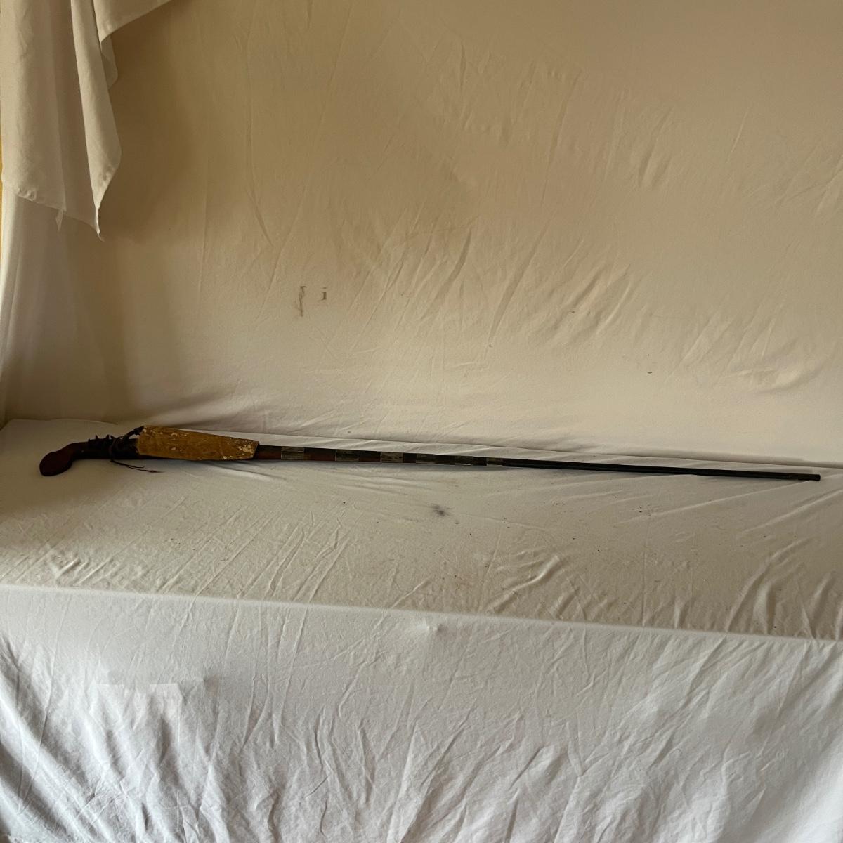 Lot includes a flintlock rifle, powder horns, cleaning tool and leather shot holders. Rifle measures 3” x 1.5” x 55” long. According to the seller, this is an authentic antique Hmong rifle and he purchased in 1966 in Laos. We cannot verify the authenticity.