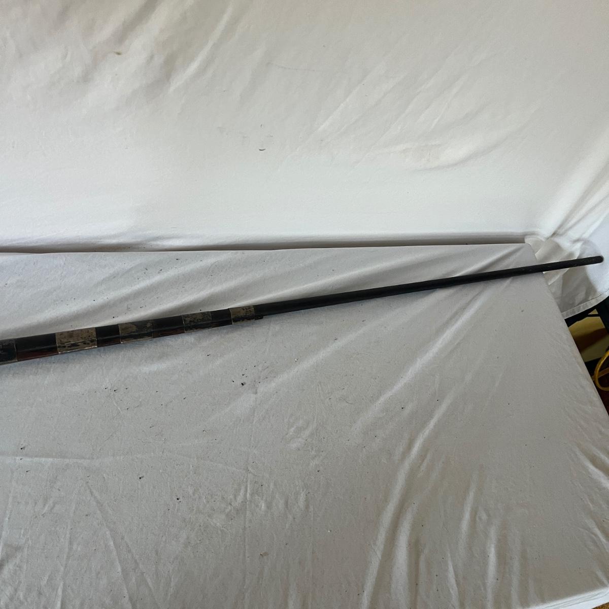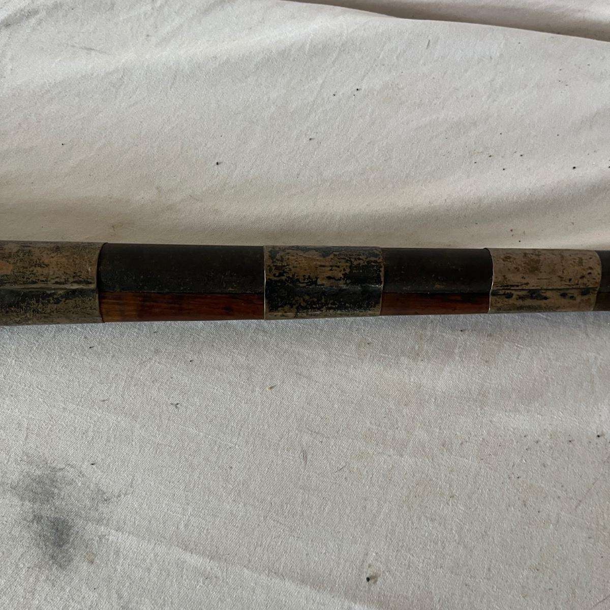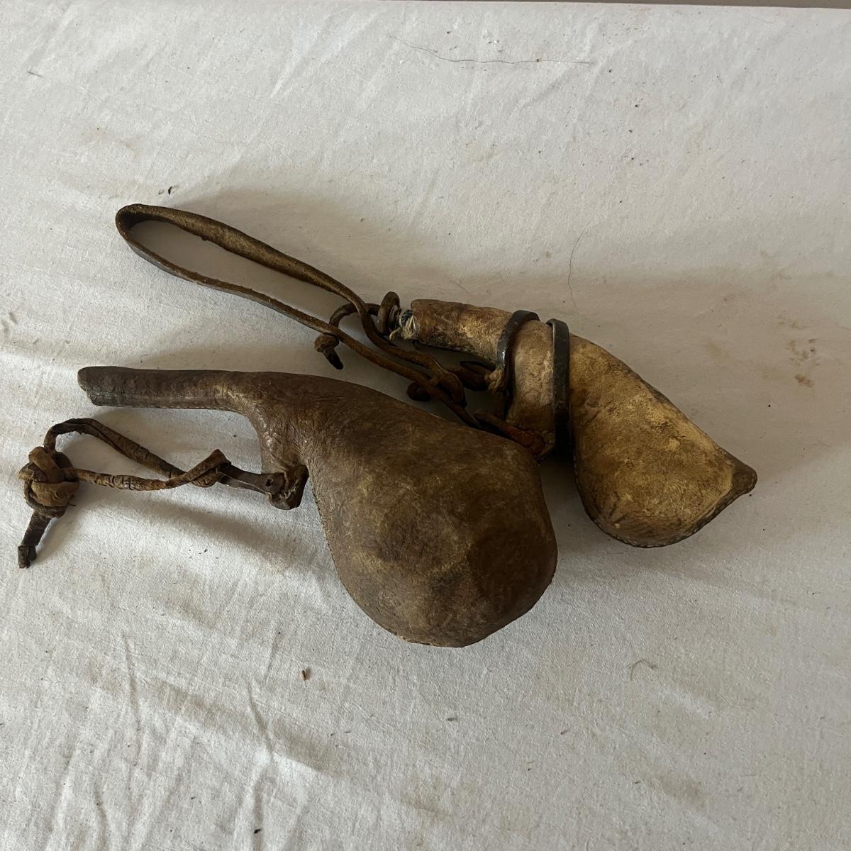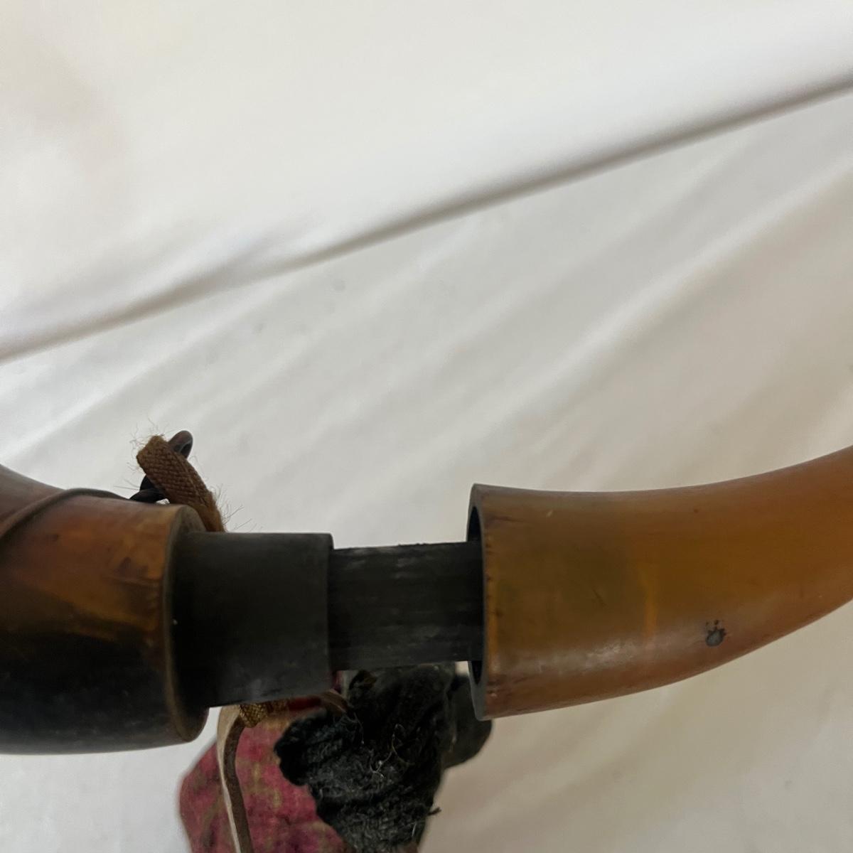 Lot includes a flintlock rifle, powder horns, cleaning tool and leather shot holders. Rifle measures 3” x 1.5” x 55” long. According to the seller, this is an authentic antique Hmong rifle and he purchased in 1966 in Laos. We cannot verify the authenticity.
