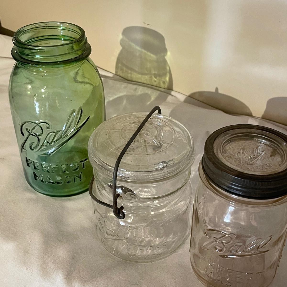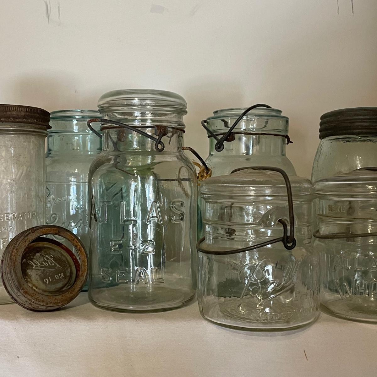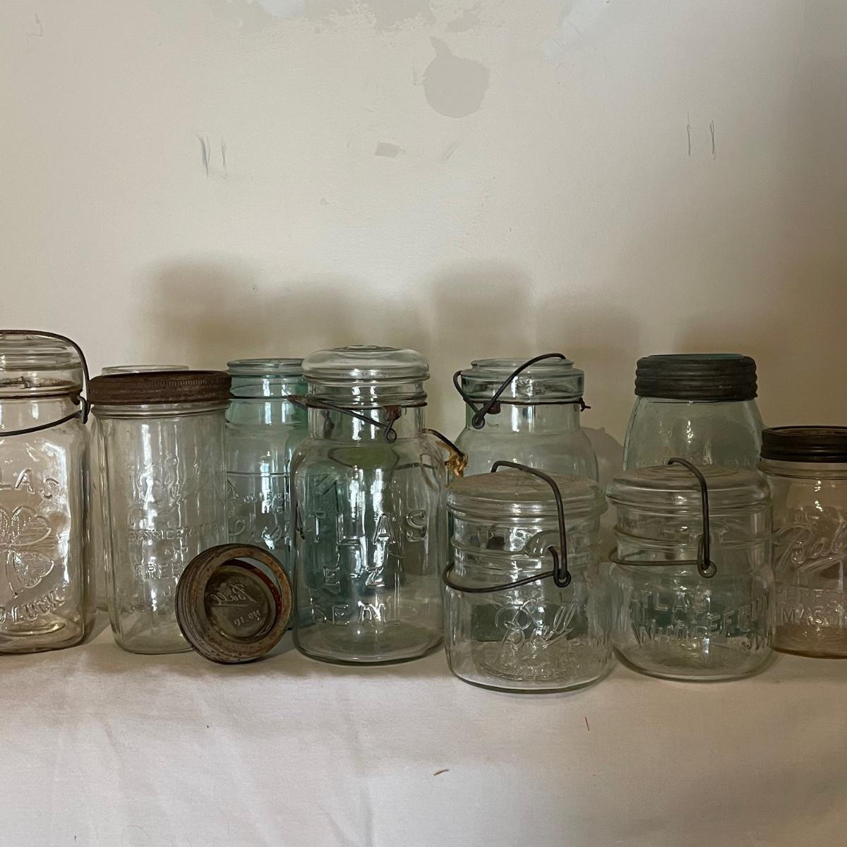 Eleven jars in this lot that includes Ball, Atlas and Masons. Many have glass tops and flip top lids, see images.