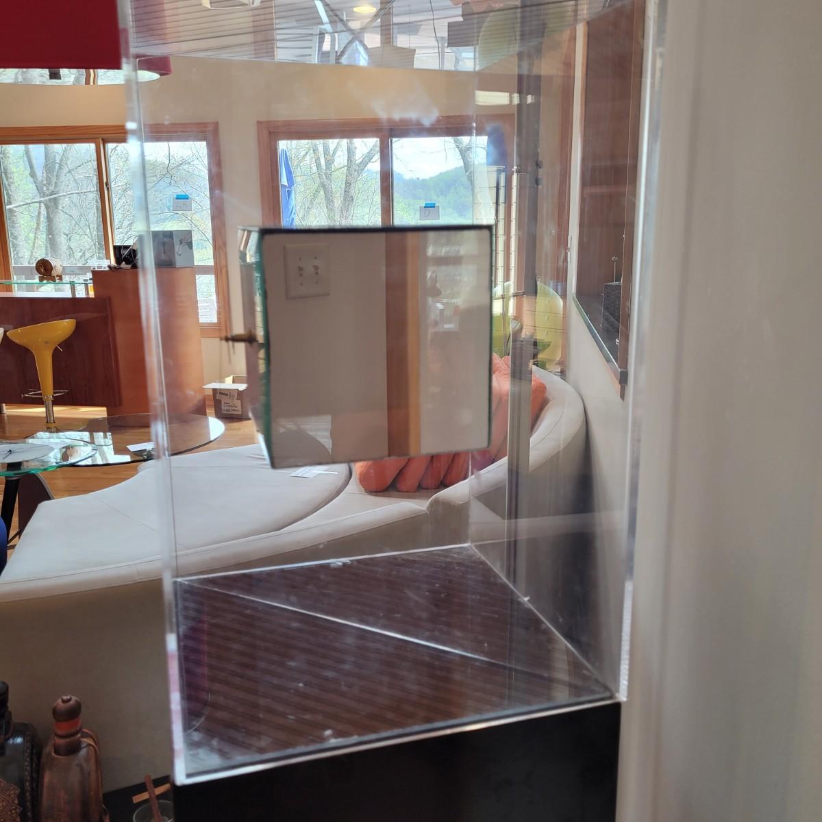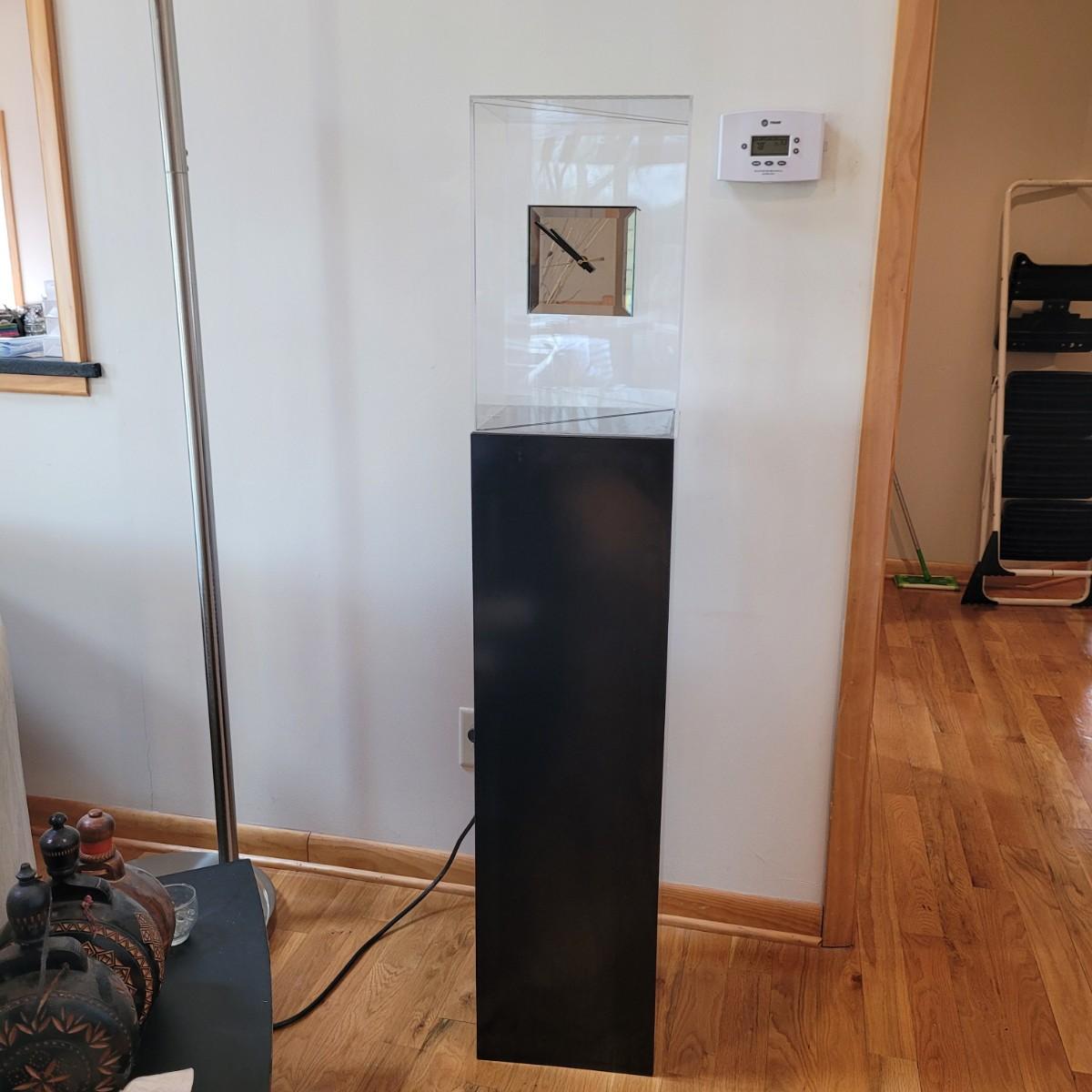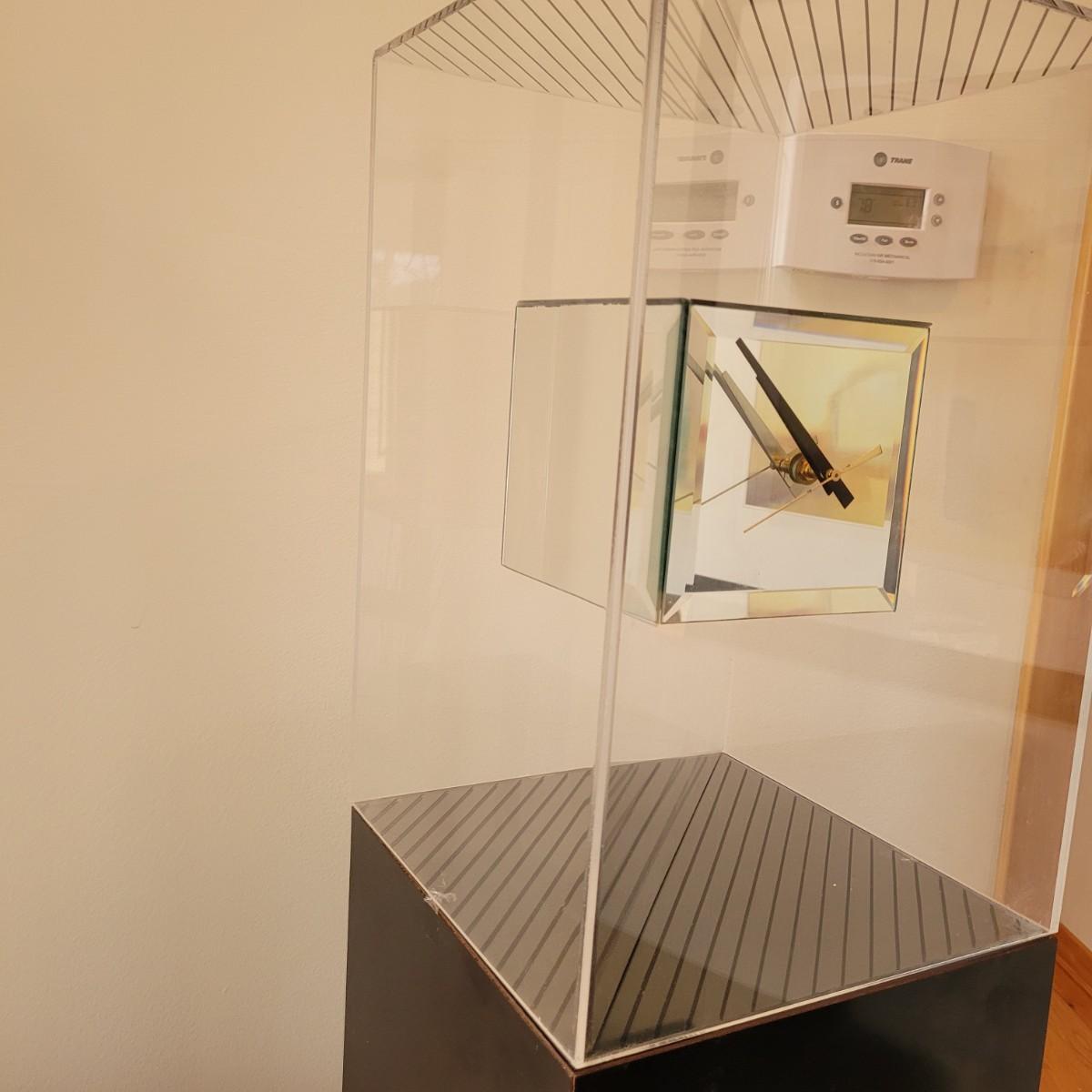Unique "floating" mirrored cube clock set inside a plexiglass case. Case lifts up to reveal a diagonally inset pane that clock is attached to. Large black stand appears to have a plastic coated veneer. Case measures approximately 12" x 12" x 18"H, stand 12" x 12" x 42"H, for a total approximate height of 60". Local pickup only. Winning bidder must bring assistance to help move and load this item due to its weight size.