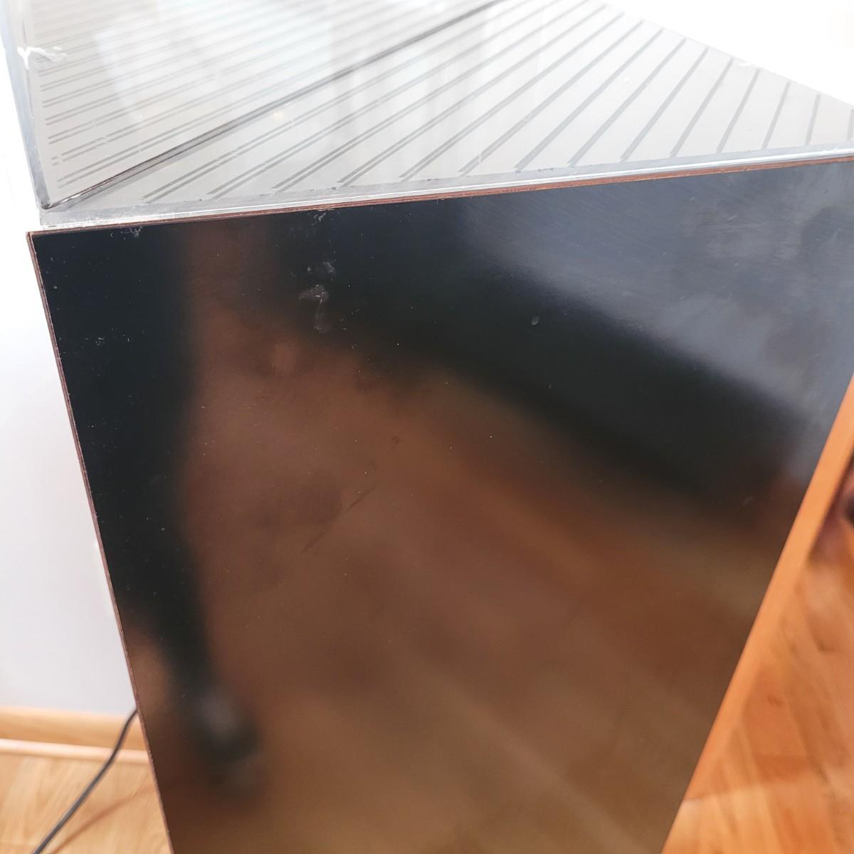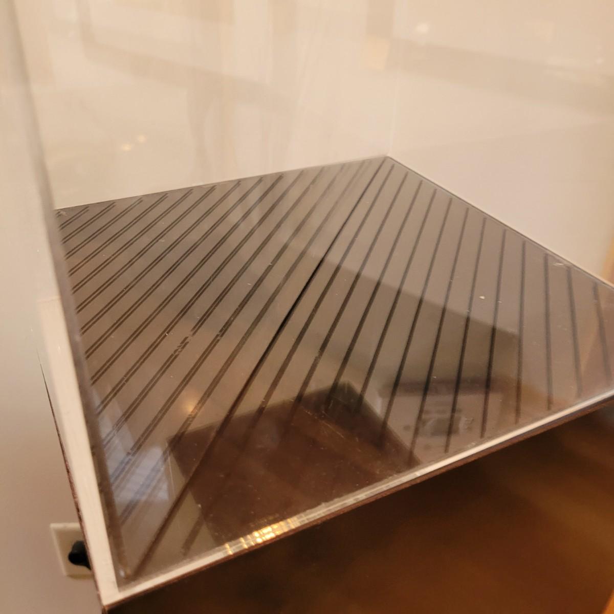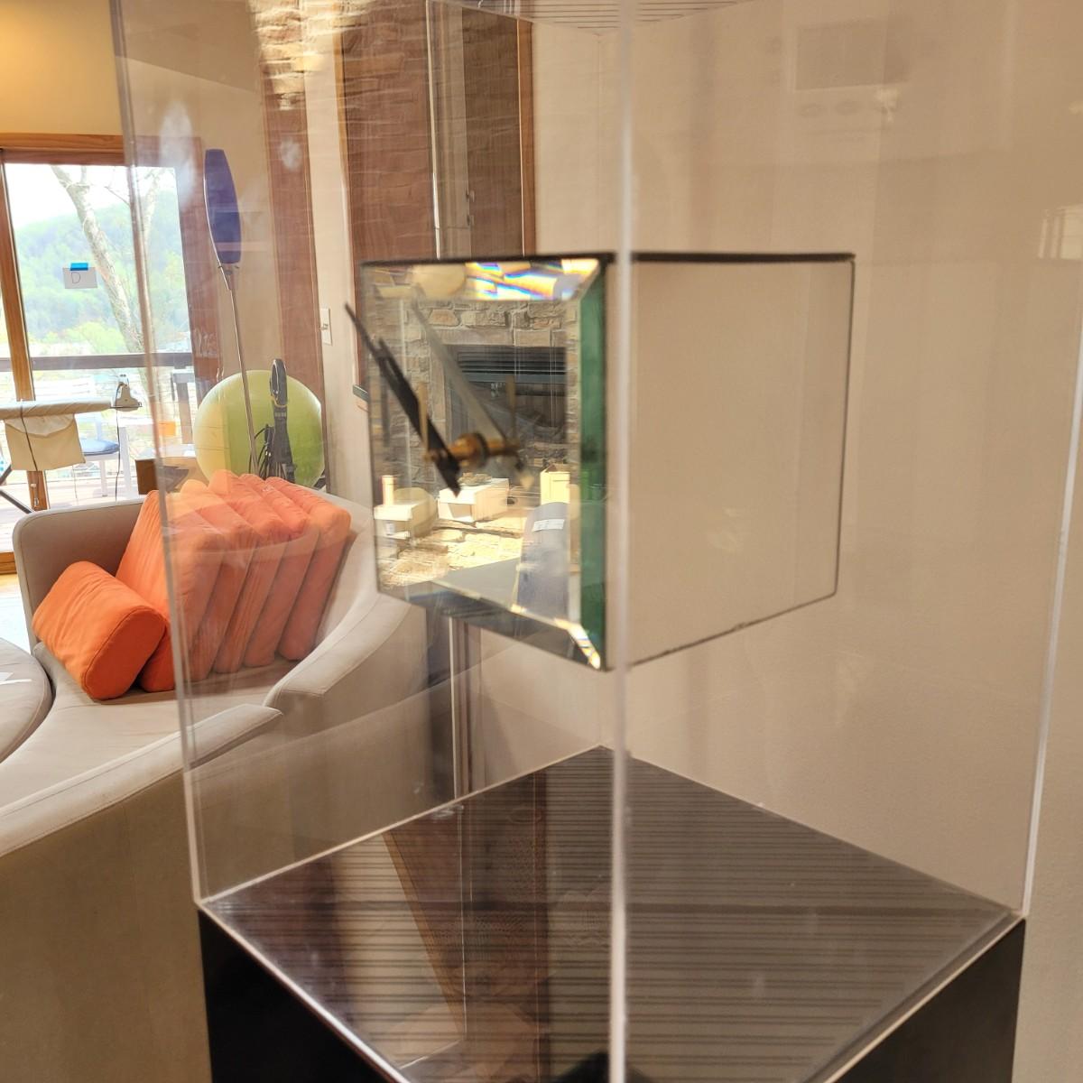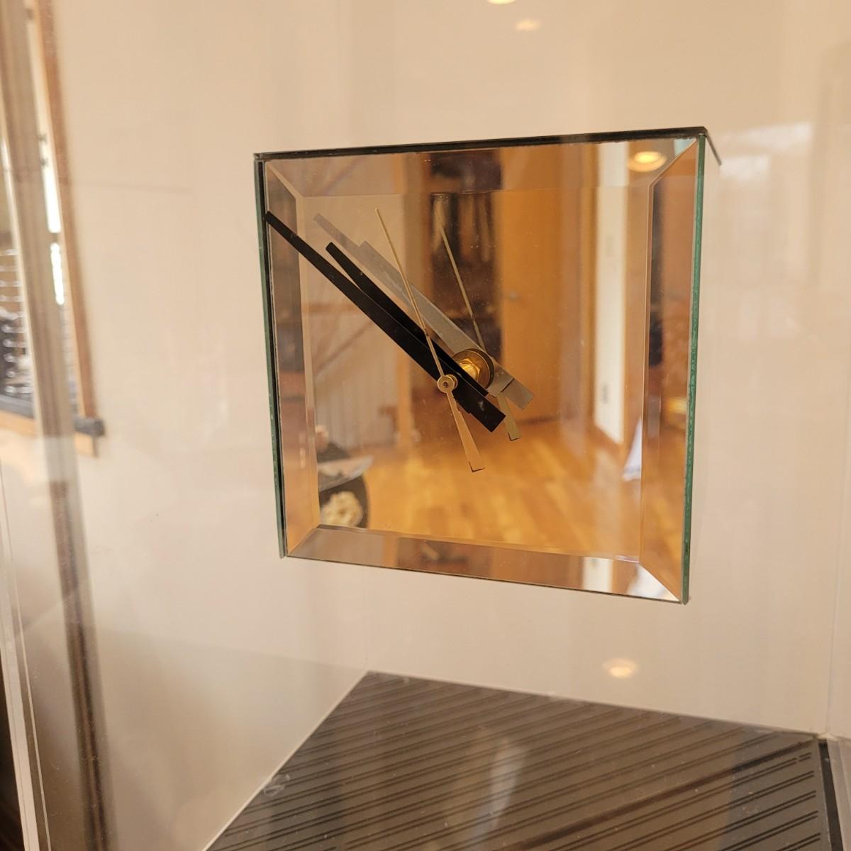 Unique "floating" mirrored cube clock set inside a plexiglass case. Case lifts up to reveal a diagonally inset pane that clock is attached to. Large black stand appears to have a plastic coated veneer. Case measures approximately 12" x 12" x 18"H, stand 12" x 12" x 42"H, for a total approximate height of 60". Local pickup only. Winning bidder must bring assistance to help move and load this item due to its weight size.