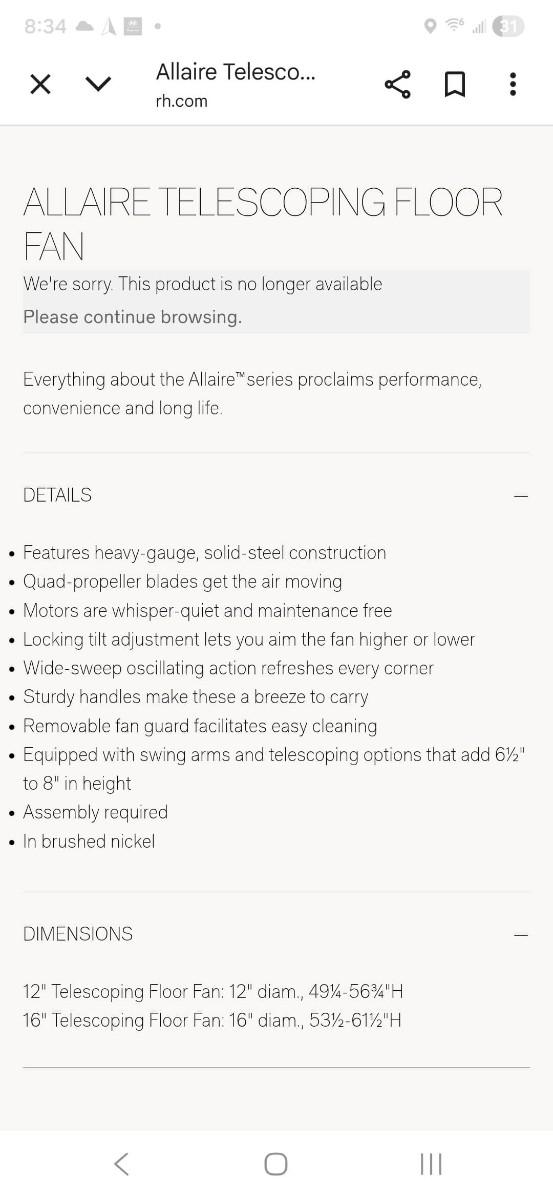 Allaire Telescoping Floor Fan by Restoration Hardware. Very clean, barely used. Please see advertisement photo for specifications. Retails for $300+