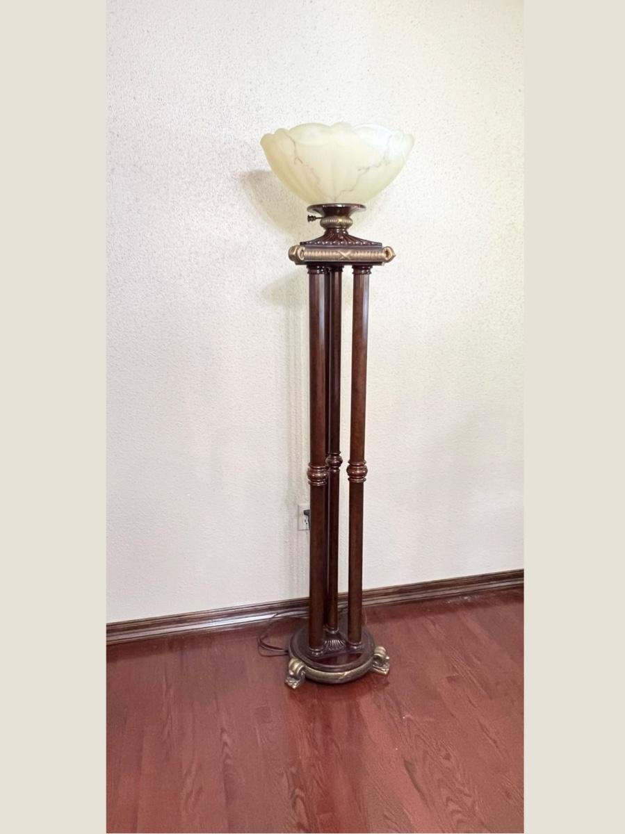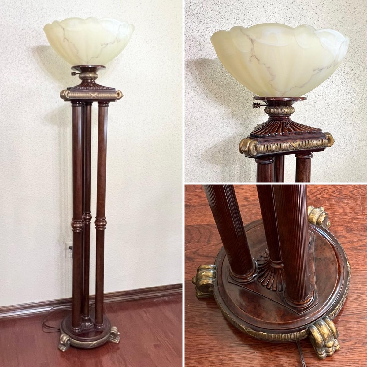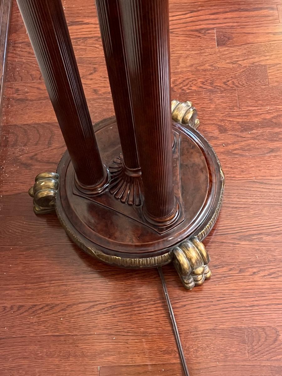 HEAVY! Bring help! Base is made of a resin based type material & middle posts are metal ~ Has glass top ~ 70” H x 18” Round