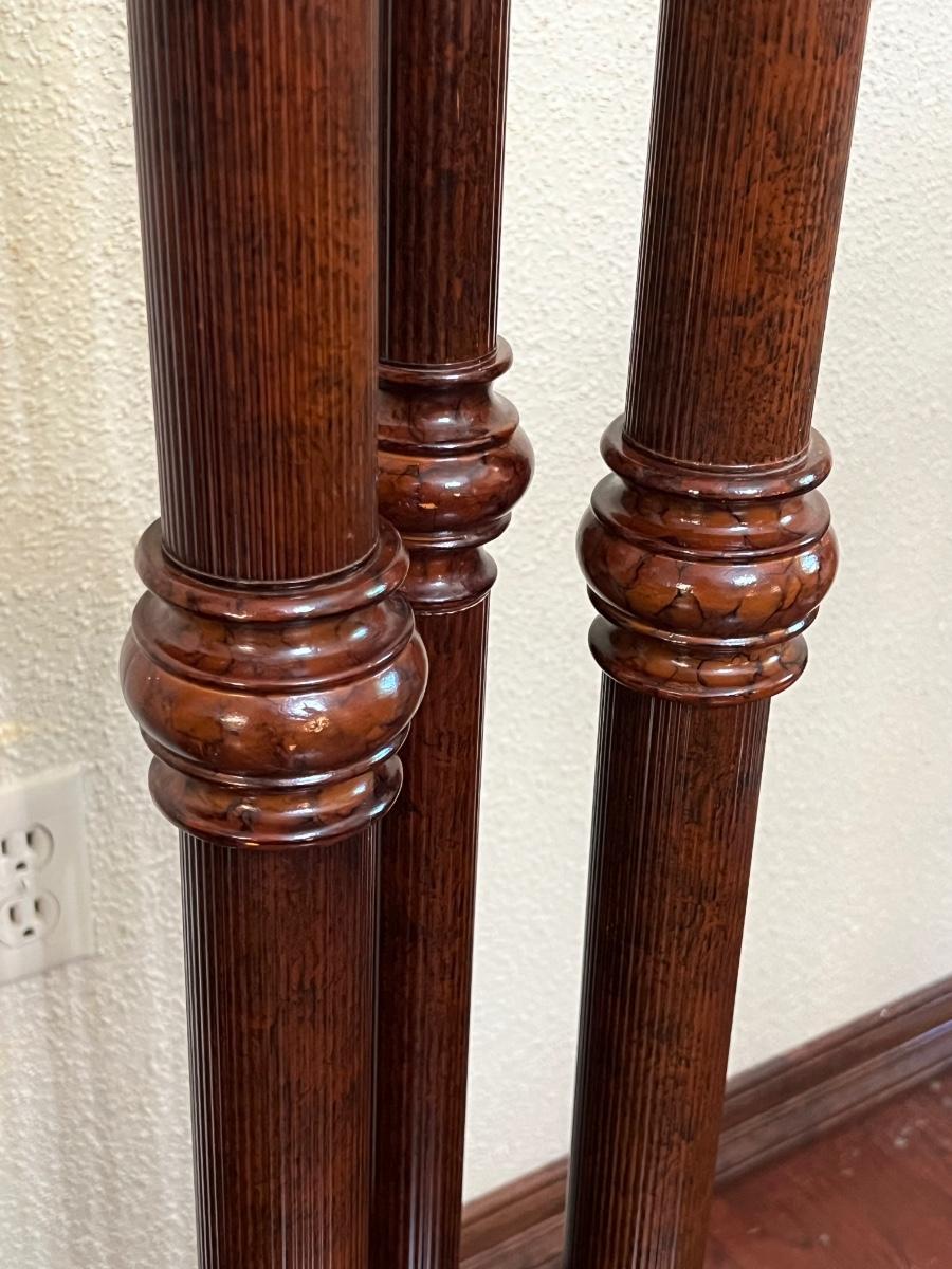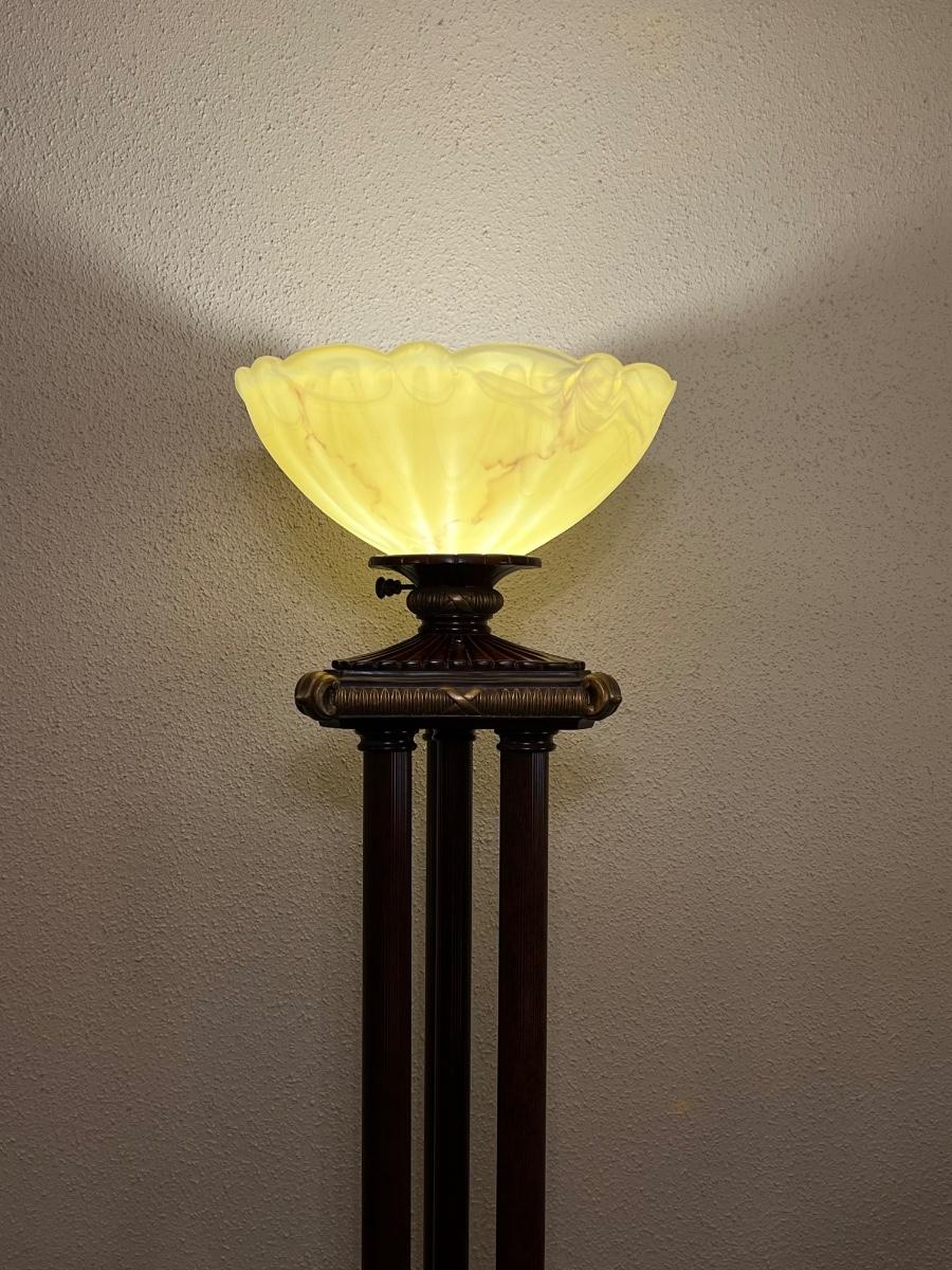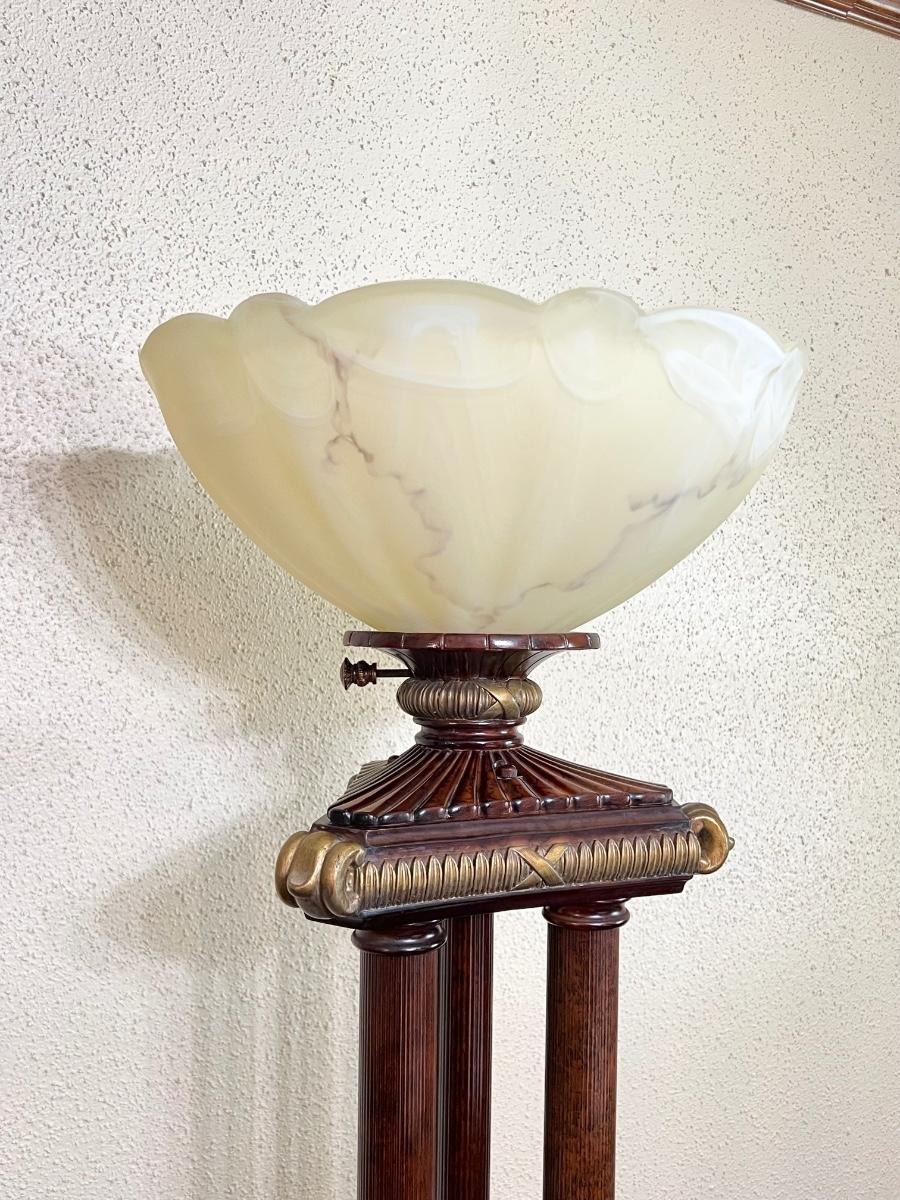 HEAVY! Bring help! Base is made of a resin based type material & middle posts are metal ~ Has glass top ~ 70” H x 18” Round