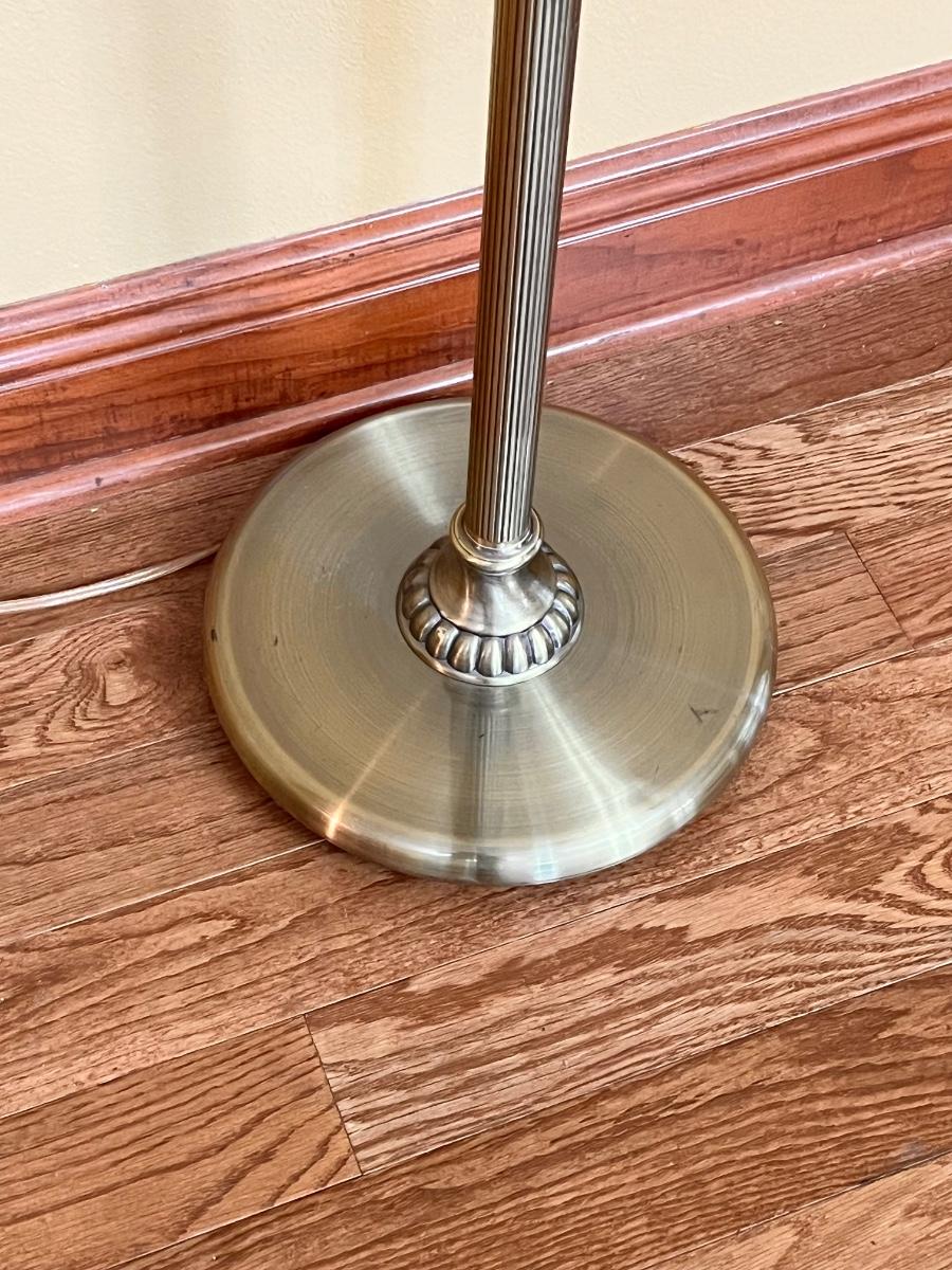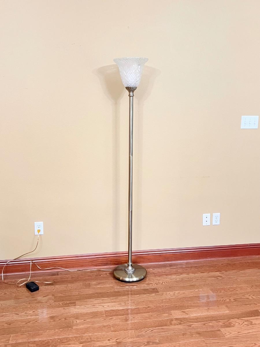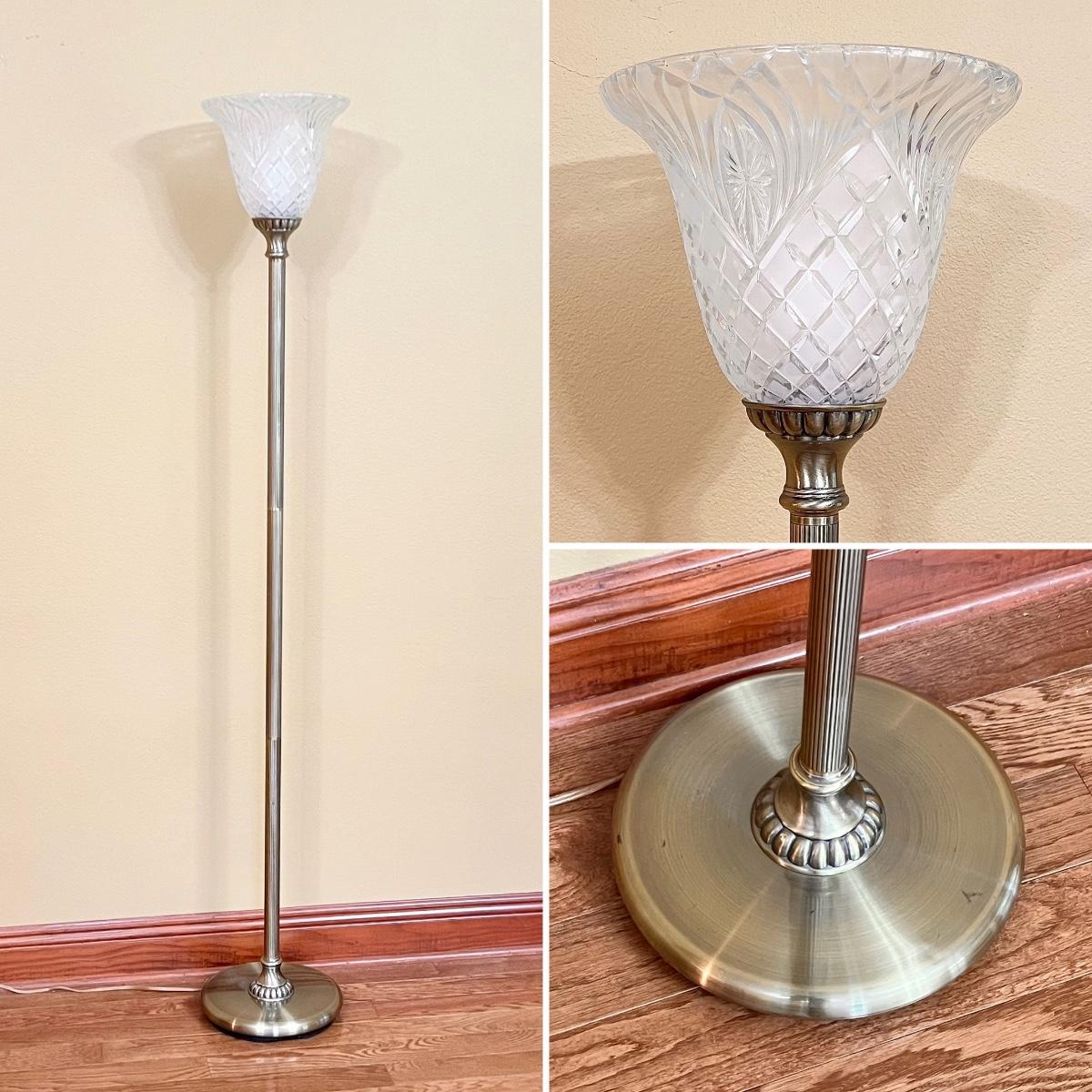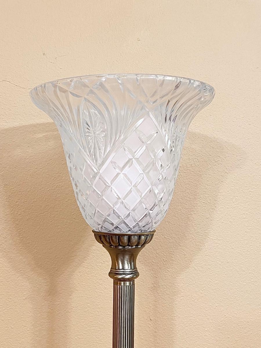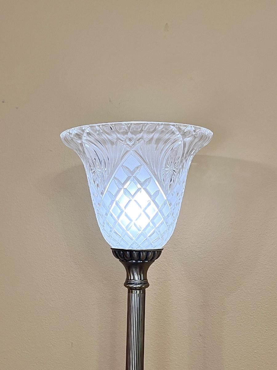 *Sounds like Crystal, but could be cut glass ~ Has a floor switch for off/on & to dim the light ~ Base has minor wear, see photos ~ 70” H x 12” Round