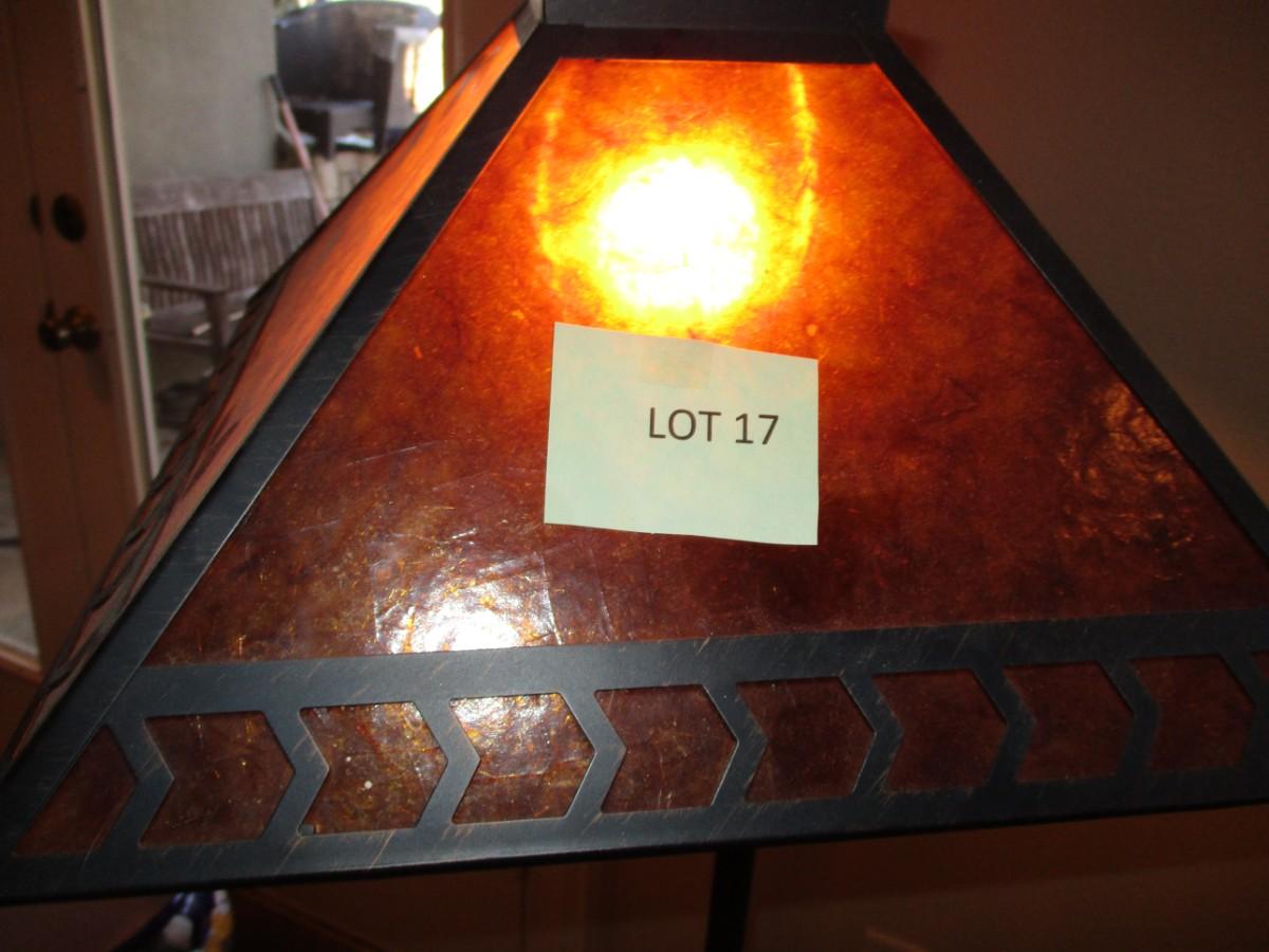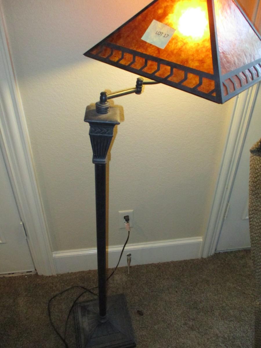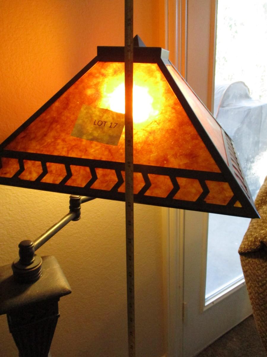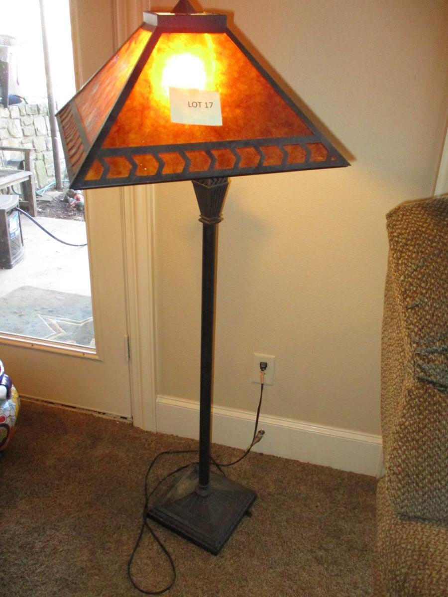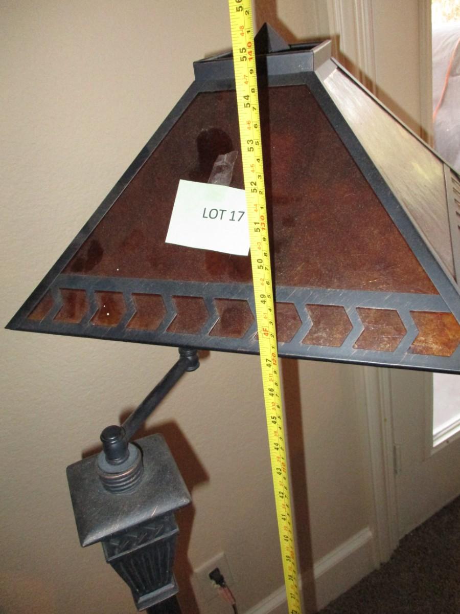Bronze floor lamp with plastic brown lamp shade. Good condition.