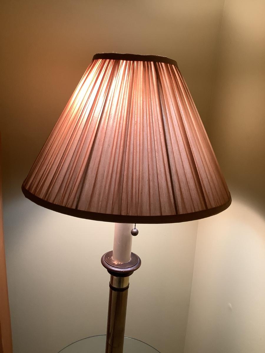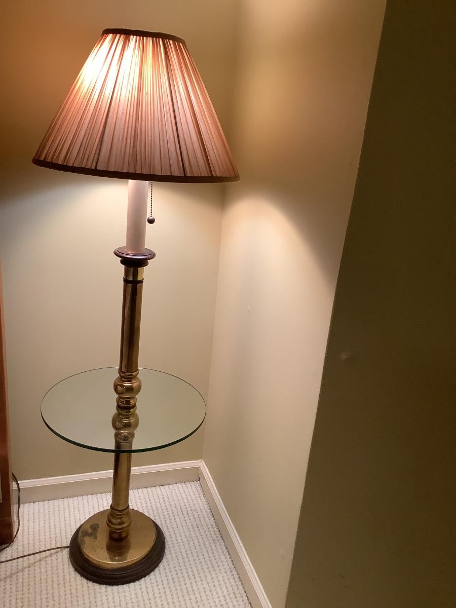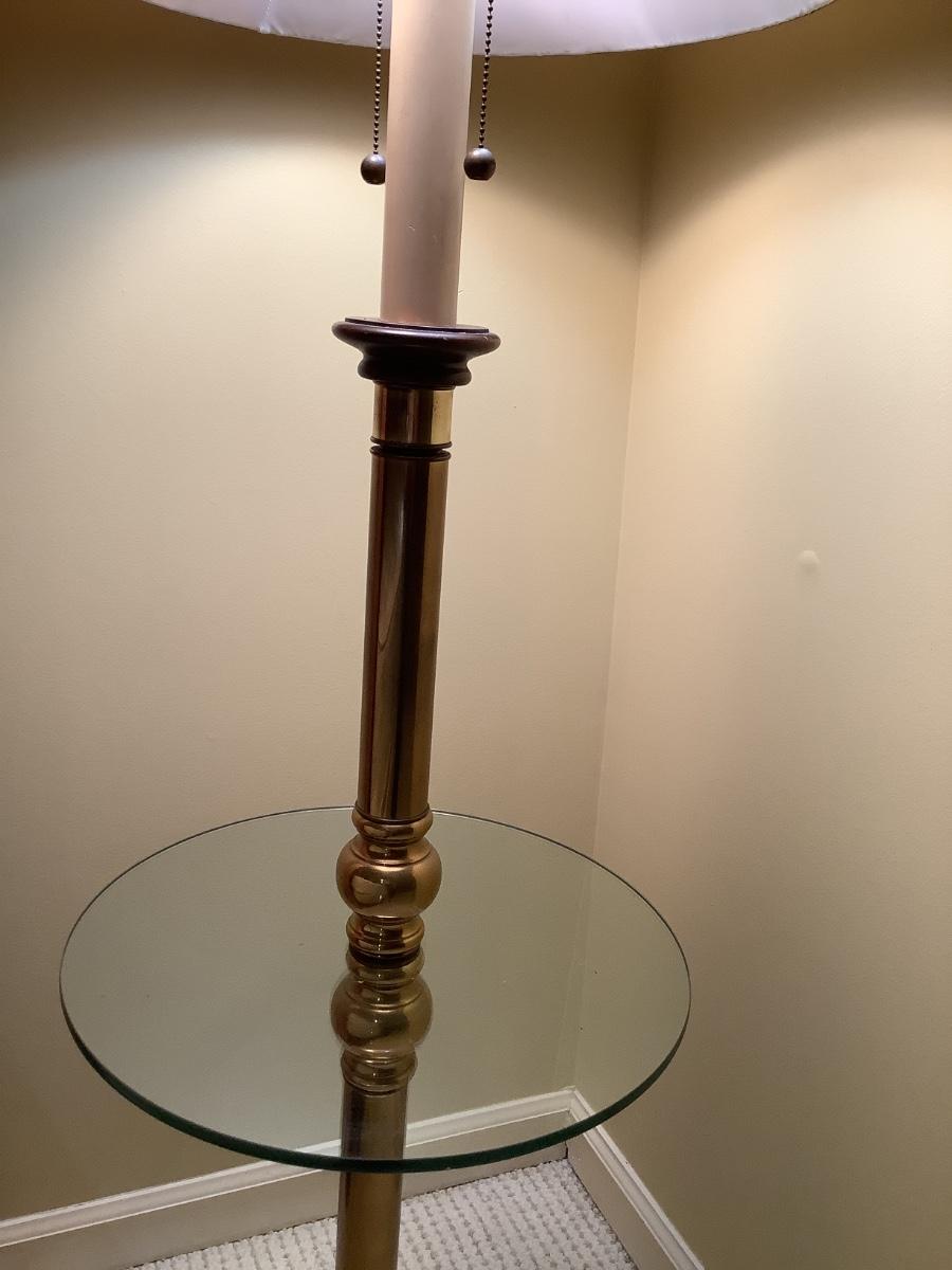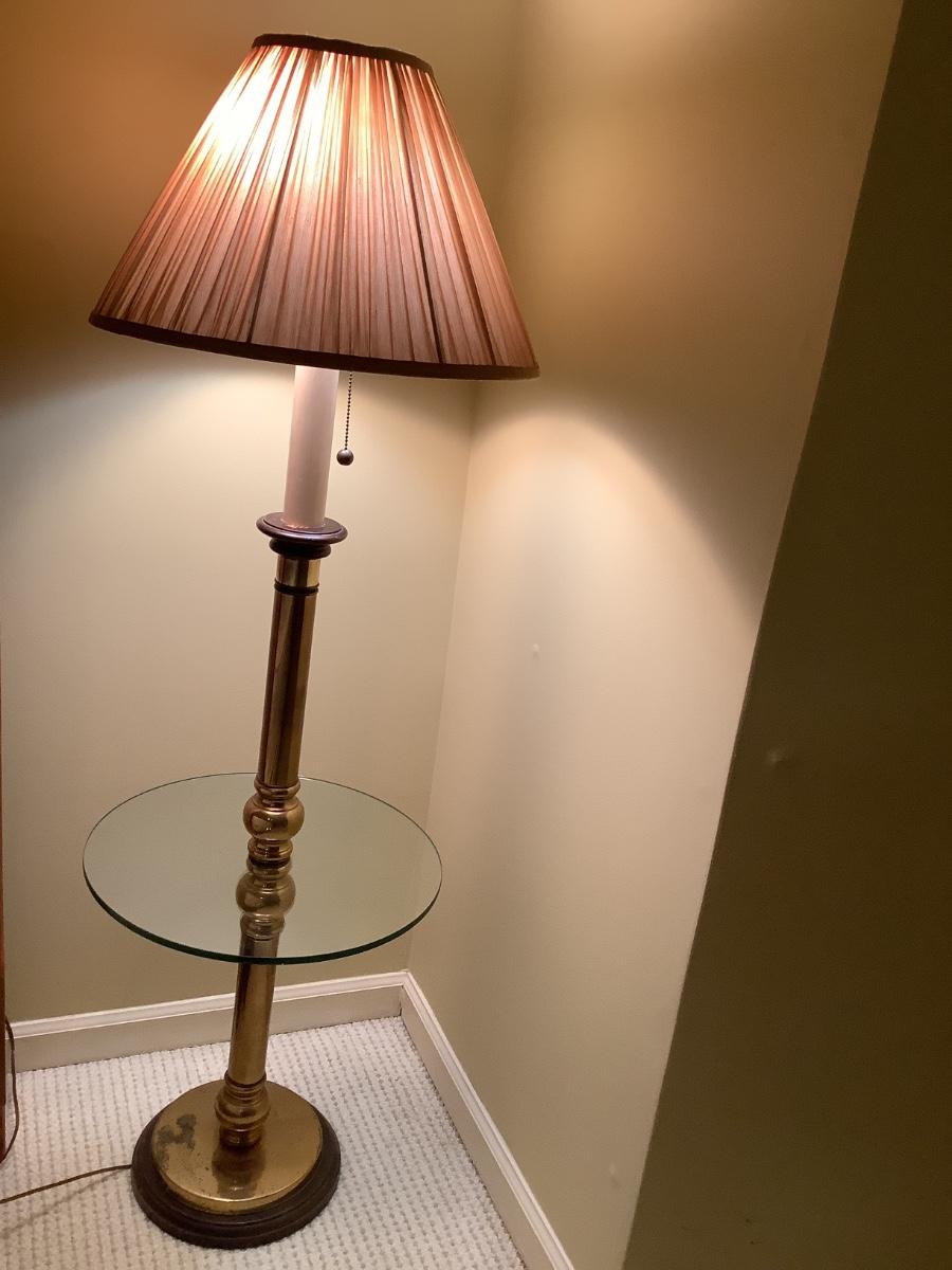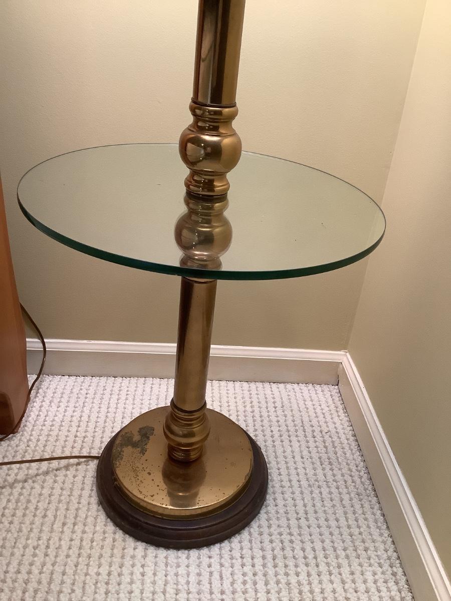 Floor lamp and table with brass and glass- there are 2 in the auction if you would like to bid on both