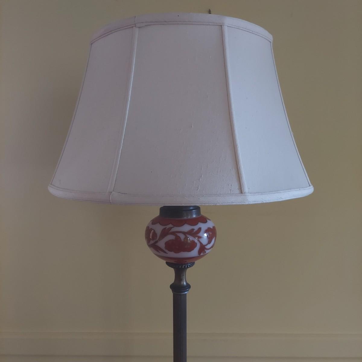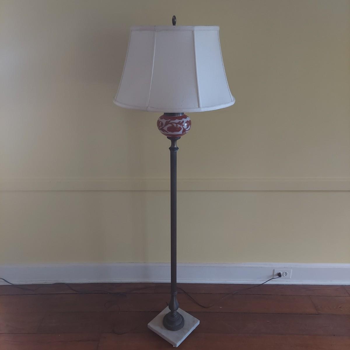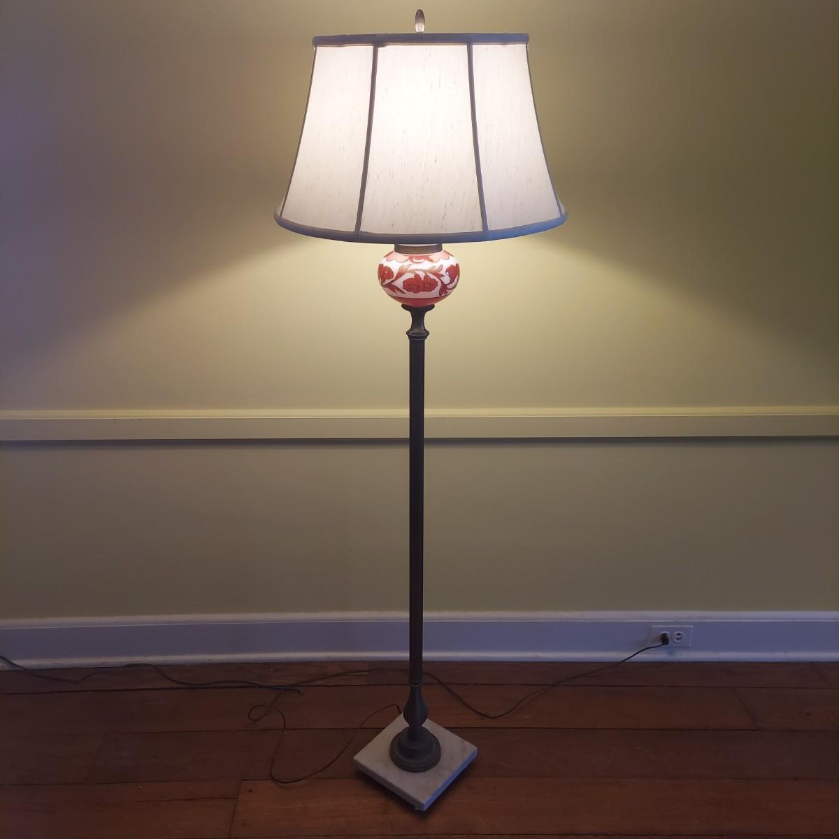 Tall floor lamp with brass shaft and marble base. Has beautiful glass globe detail. Lamp measures 8" x 8" x 61"H. The shade has a 20" diameter. Lamp was plugged in and powered on. Local Pickup Only.