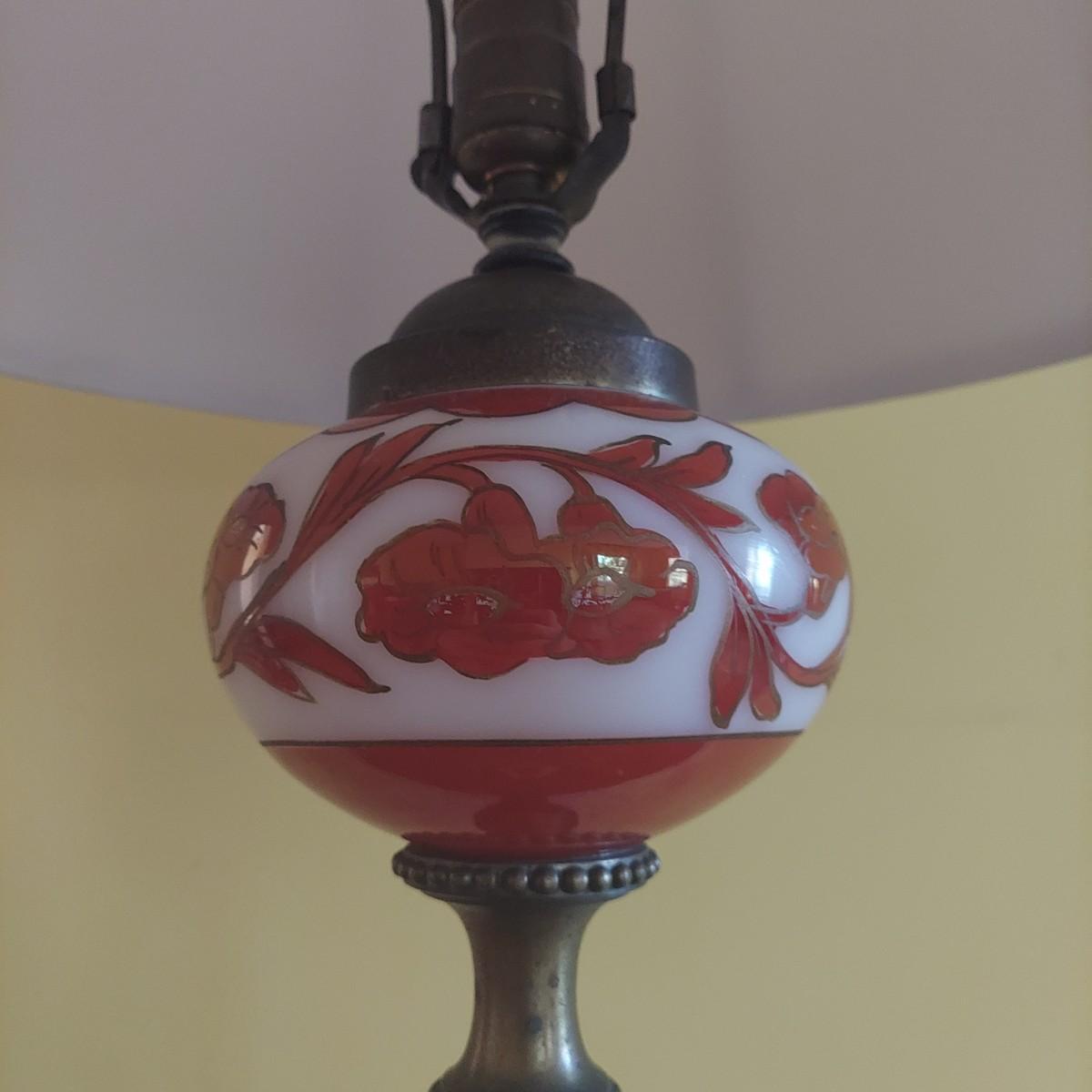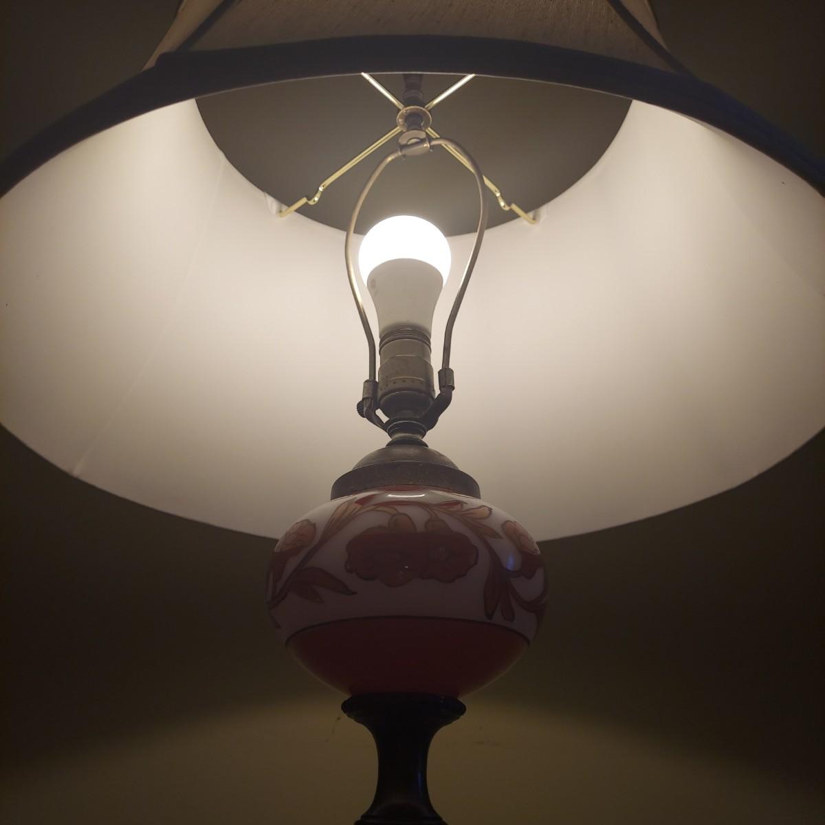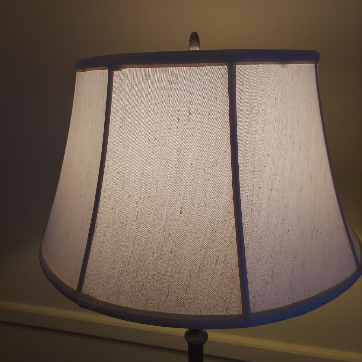 Tall floor lamp with brass shaft and marble base. Has beautiful glass globe detail. Lamp measures 8" x 8" x 61"H. The shade has a 20" diameter. Lamp was plugged in and powered on. Local Pickup Only.