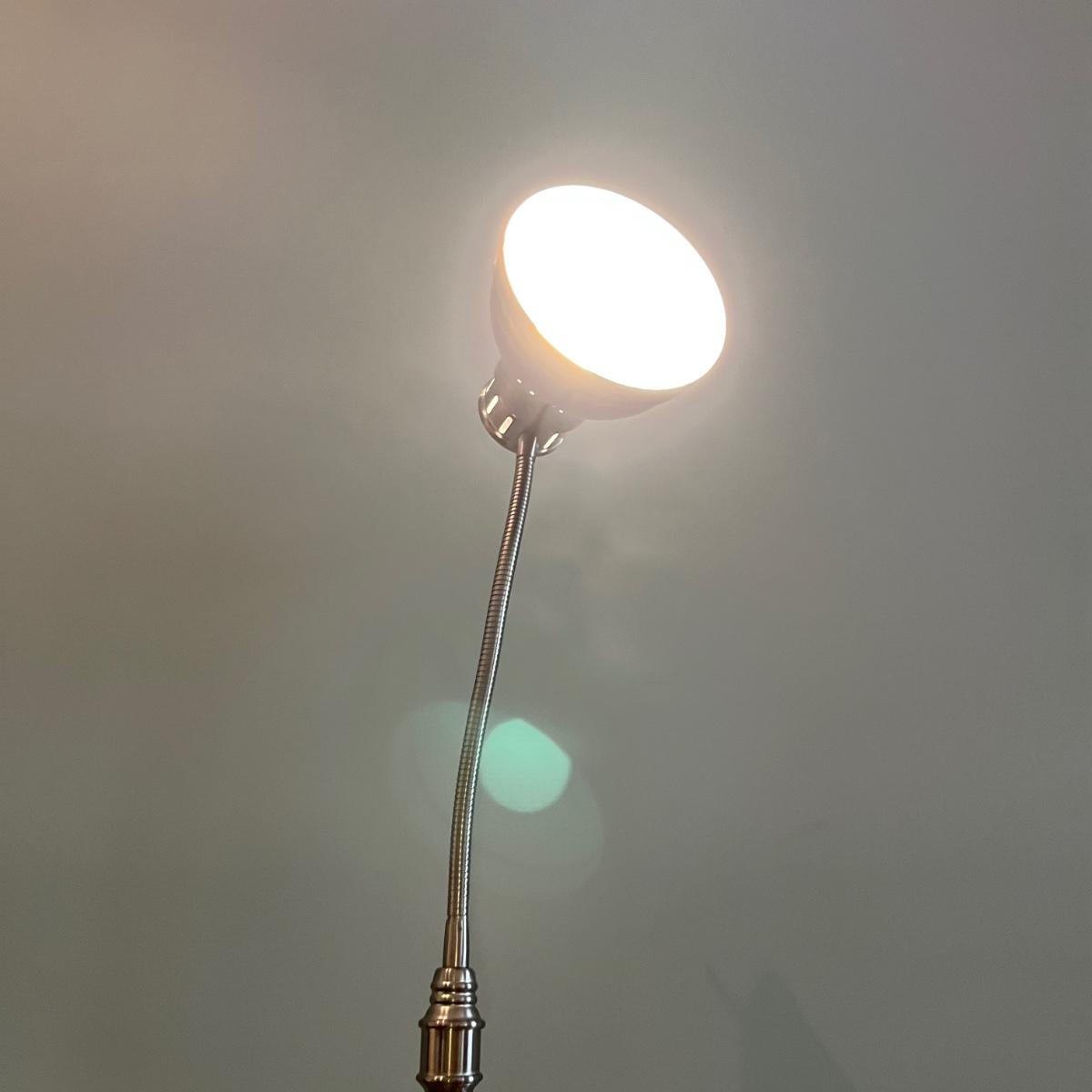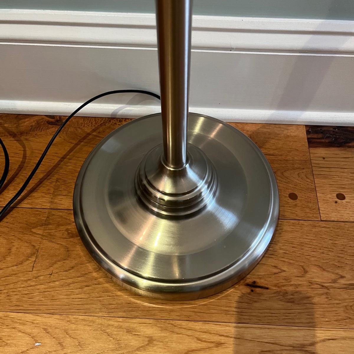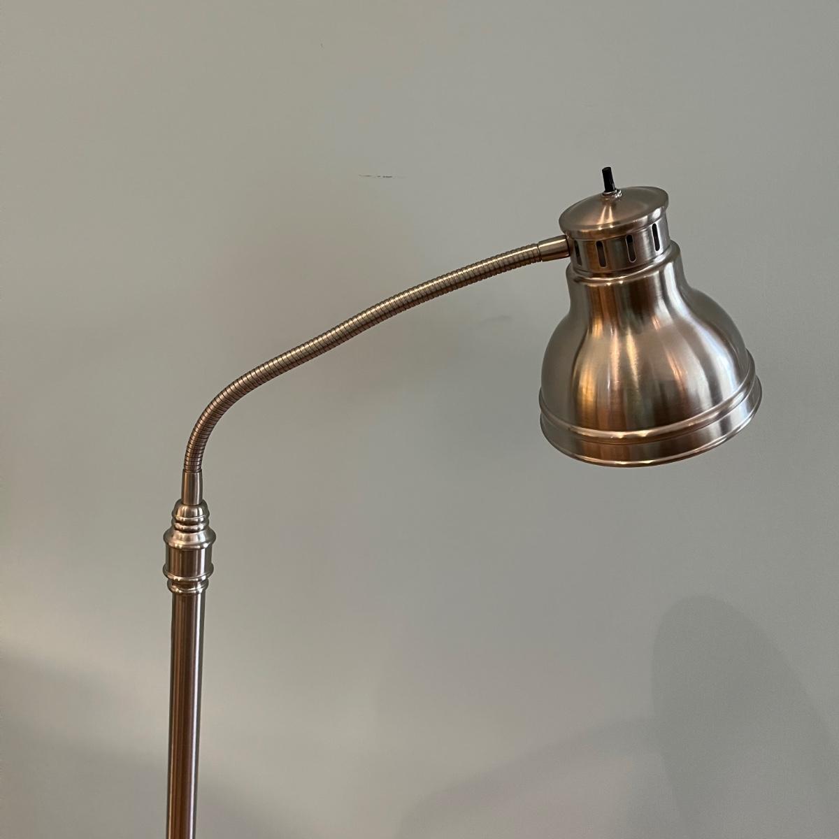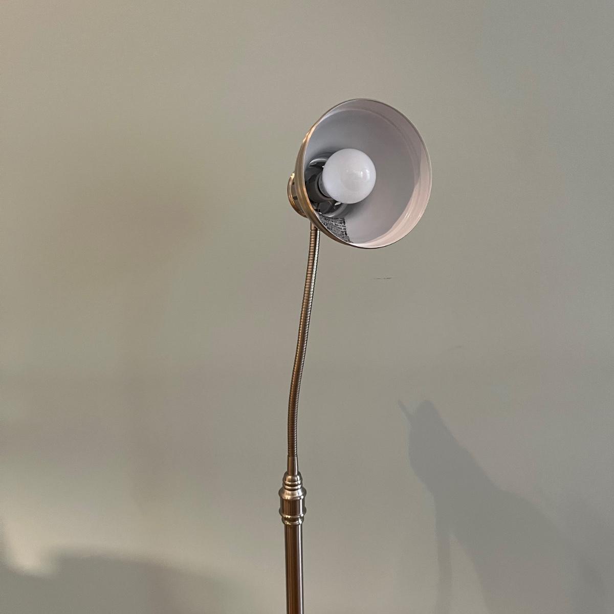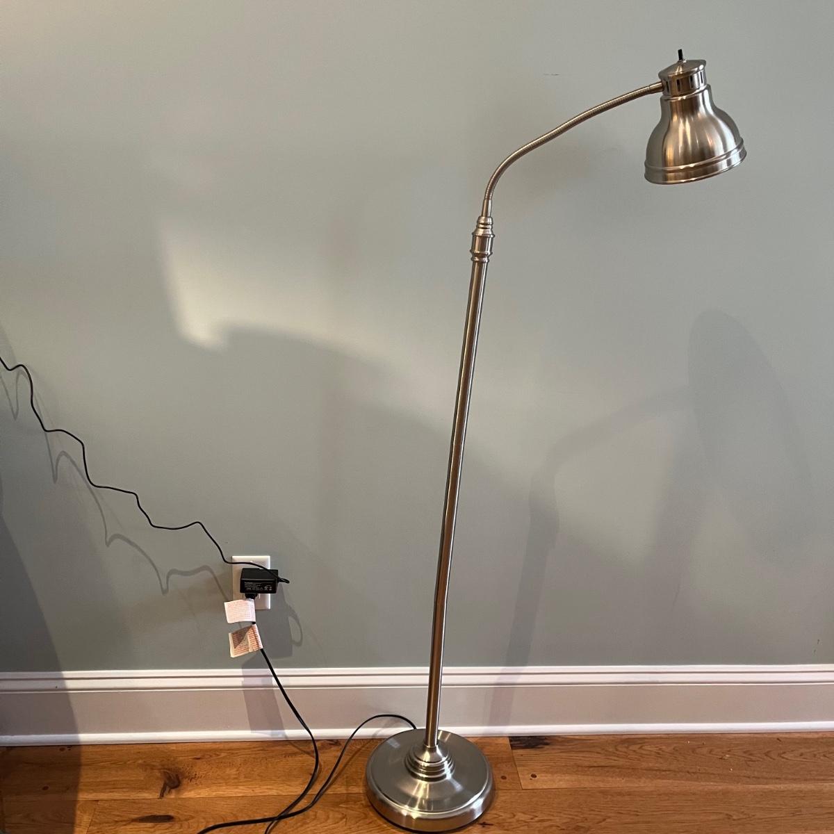 Lot includes a brushed silver color metal floor lamp with adjustable gooseneck. Lamp worked when tested. Lamp measures 10”D base x 62”H.