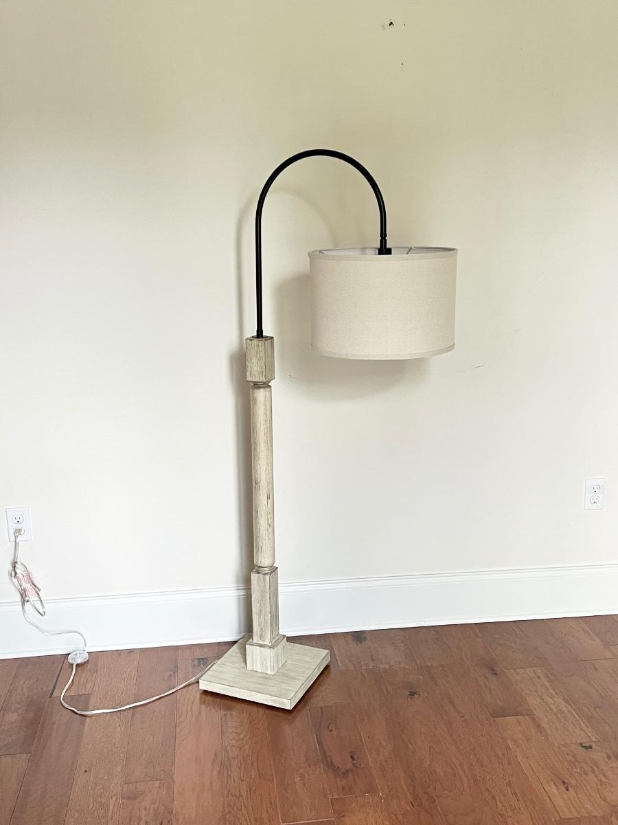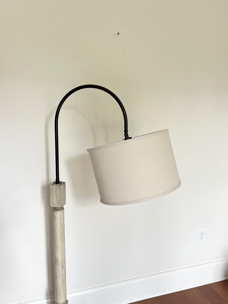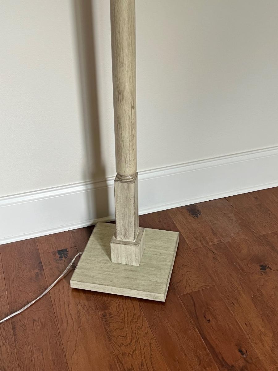 Has step on/off switch ~ Has linen shade ~ Bottom is painted metal, has wooden middle post with metal curved top ~ 61.5” H x 15” W x 24” D