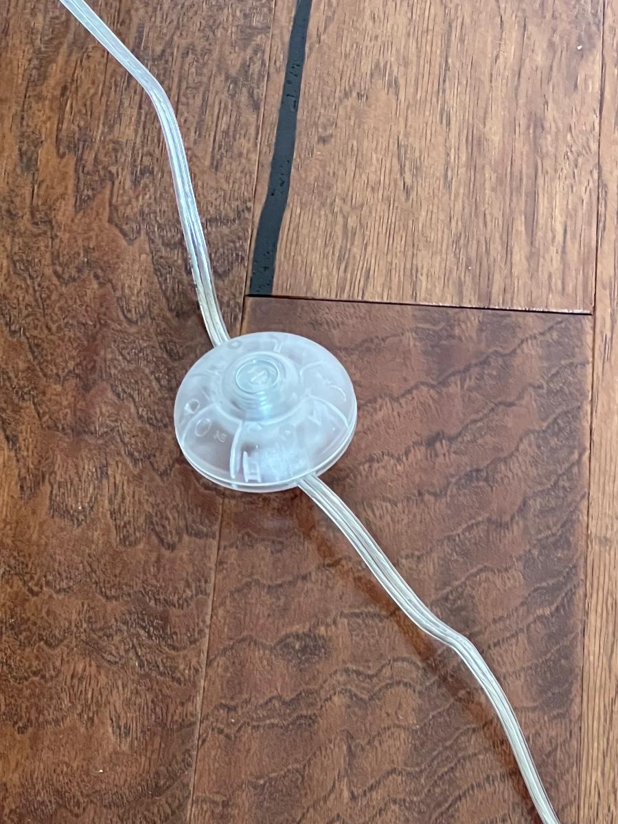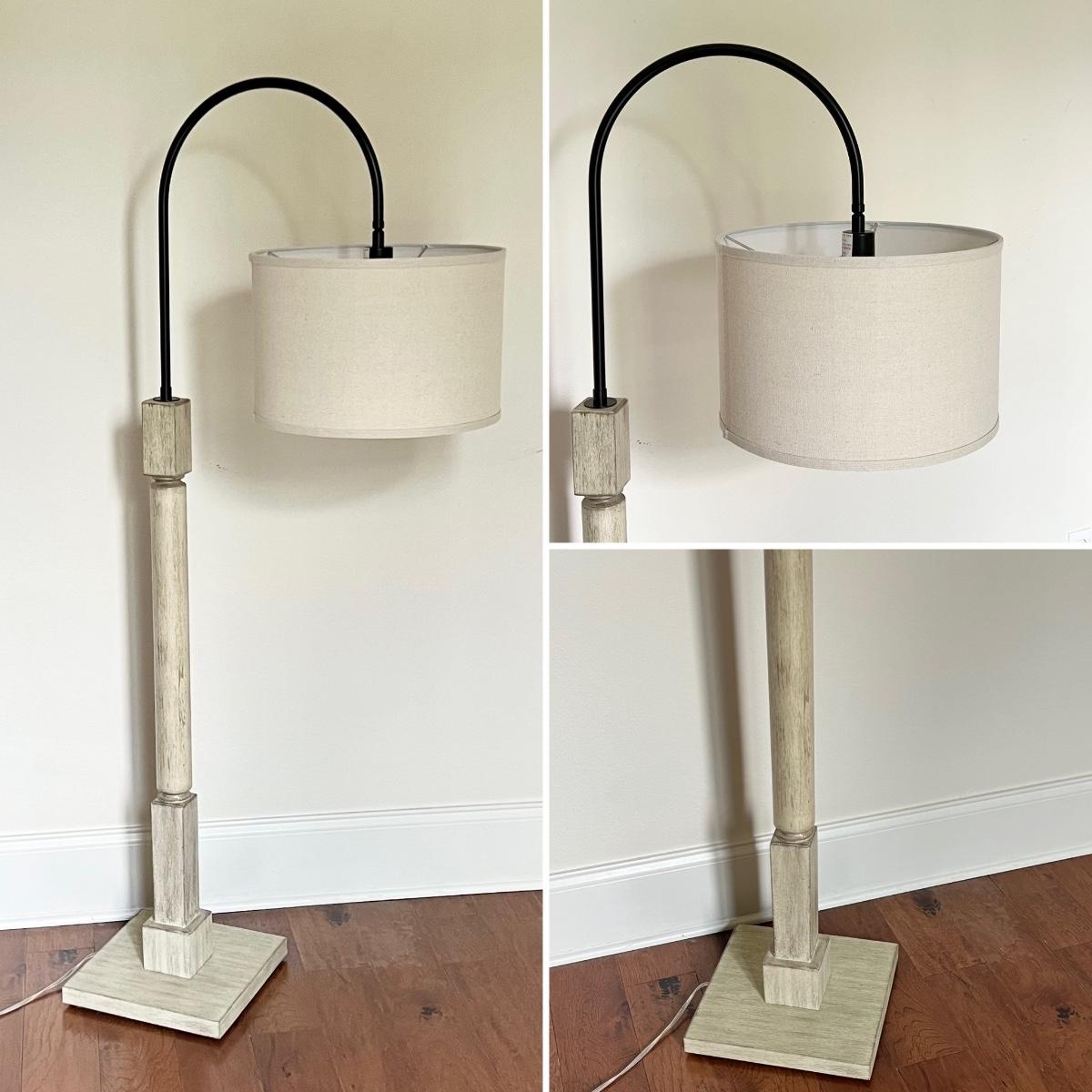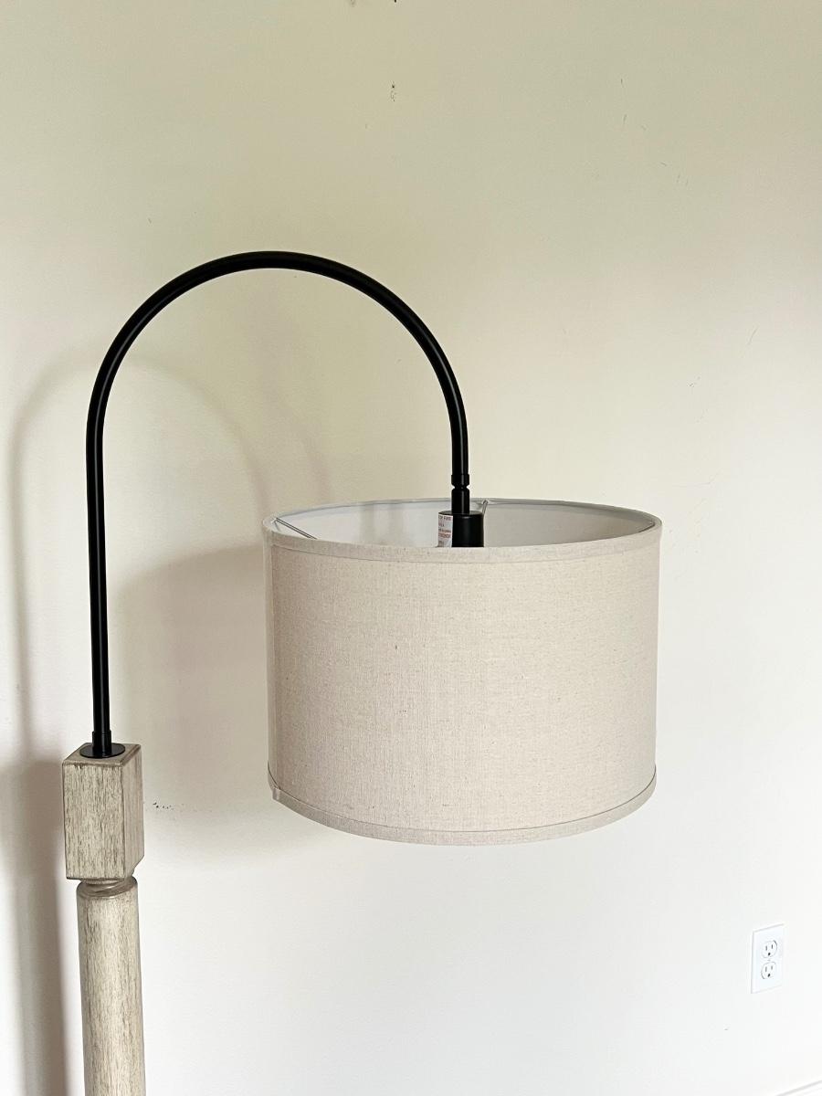 Has step on/off switch ~ Has linen shade ~ Bottom is painted metal, has wooden middle post with metal curved top ~ 61.5” H x 15” W x 24” D