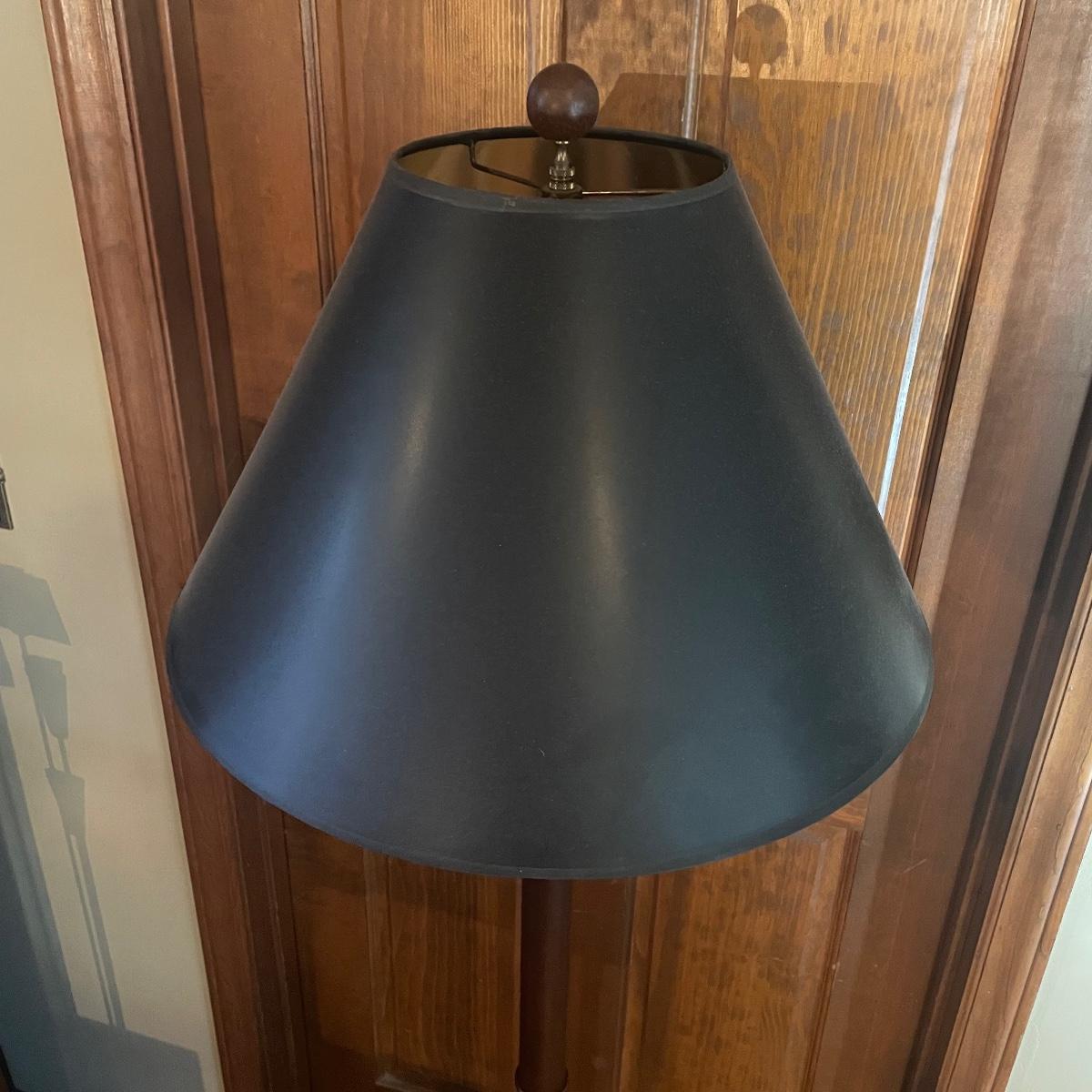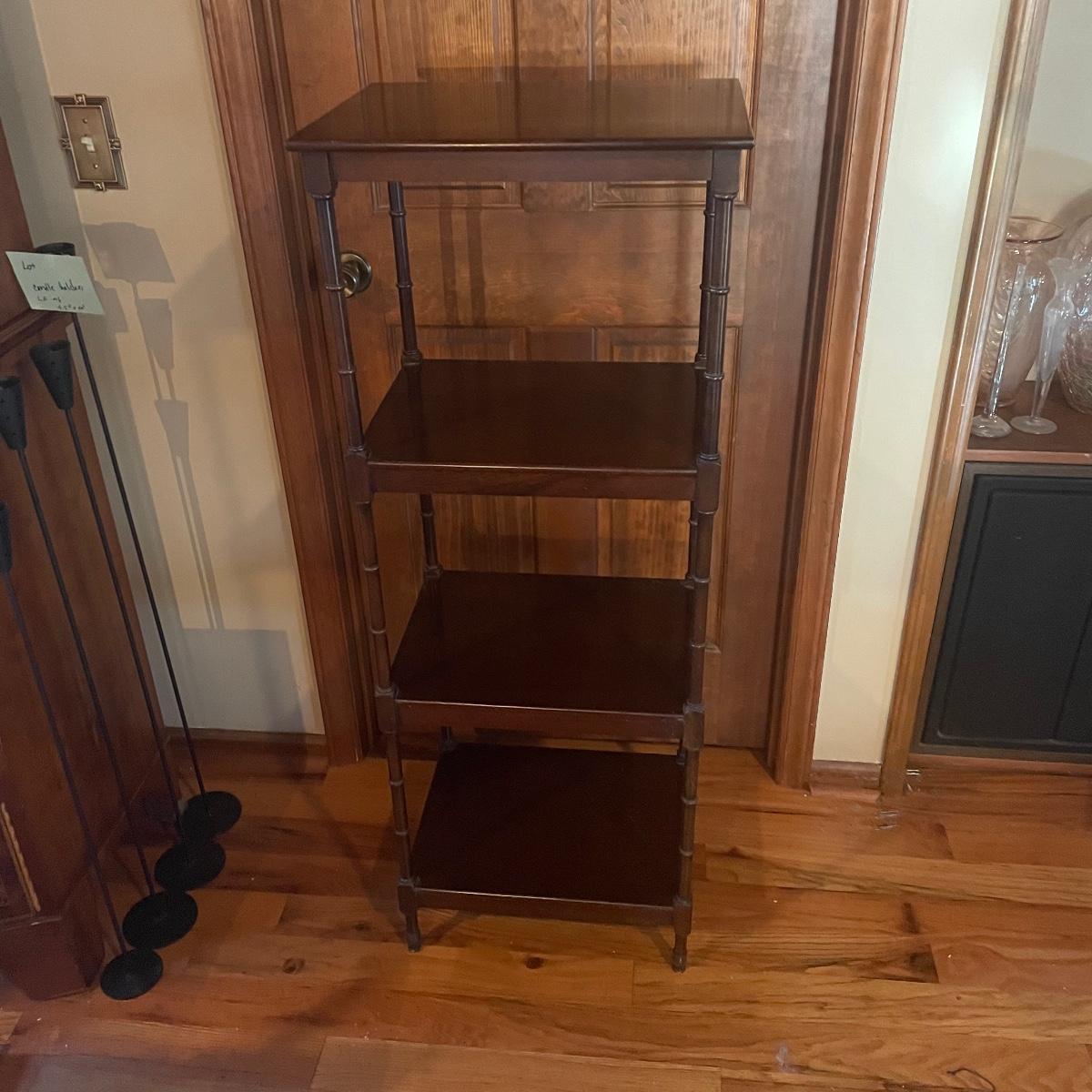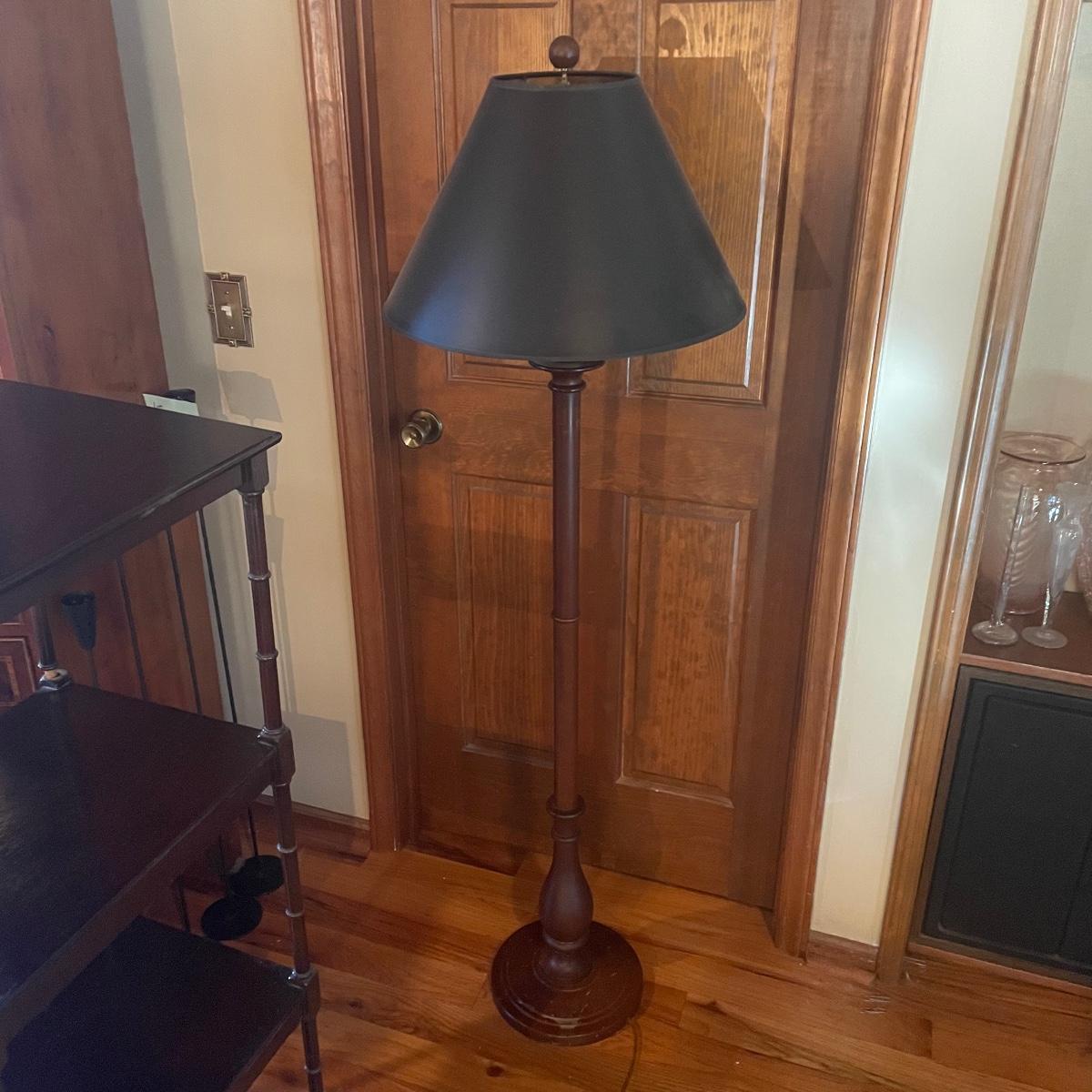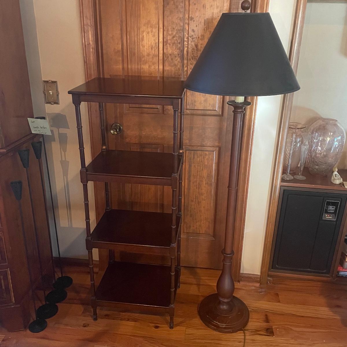 Four open shelves in this elegant dark wood etagere that is in excellent condition. We have paired it with a faux wood (possibly resin) floor lamp with black shade (inside of shade is good colored to reflect the light), it does have some minor scuffs marks and stands 62” tall.