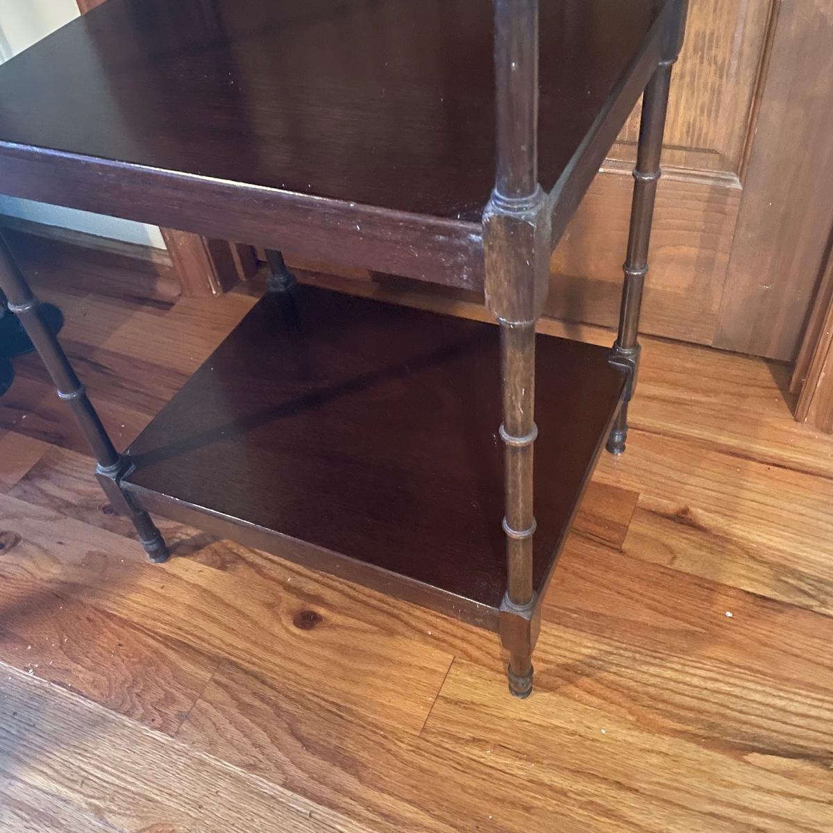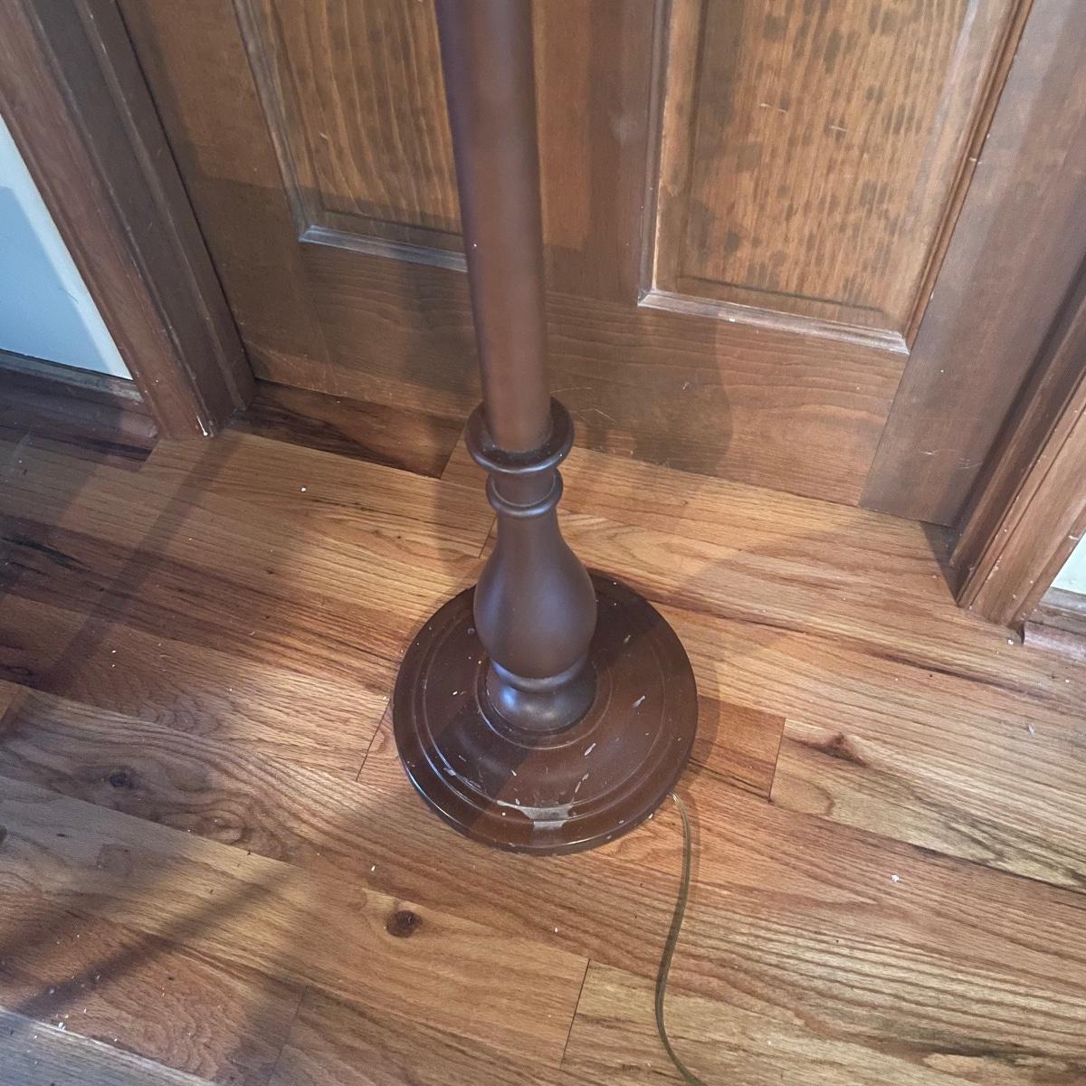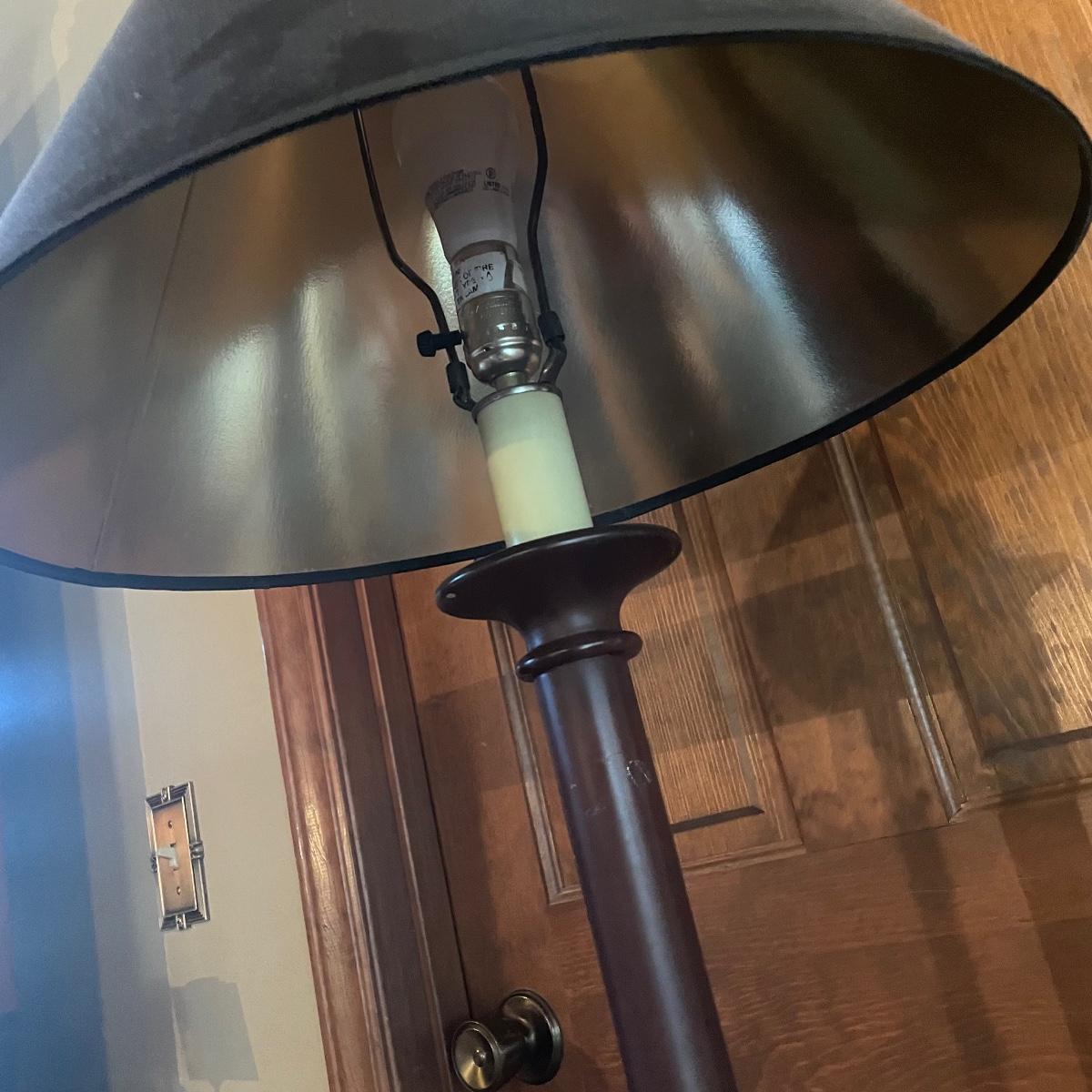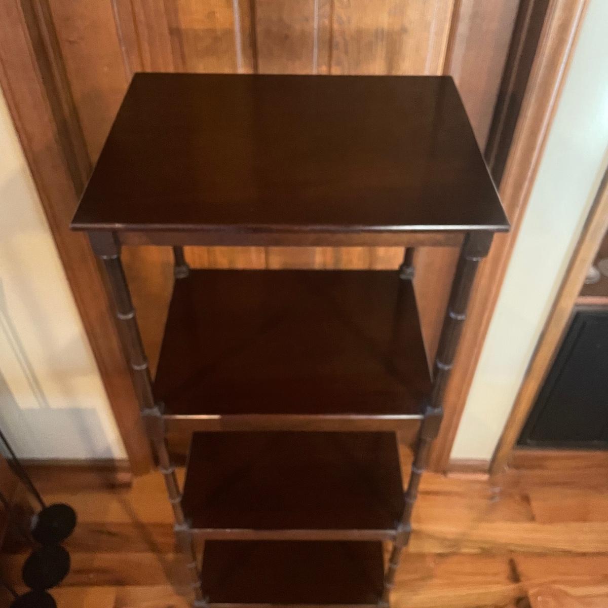 Four open shelves in this elegant dark wood etagere that is in excellent condition. We have paired it with a faux wood (possibly resin) floor lamp with black shade (inside of shade is good colored to reflect the light), it does have some minor scuffs marks and stands 62” tall.