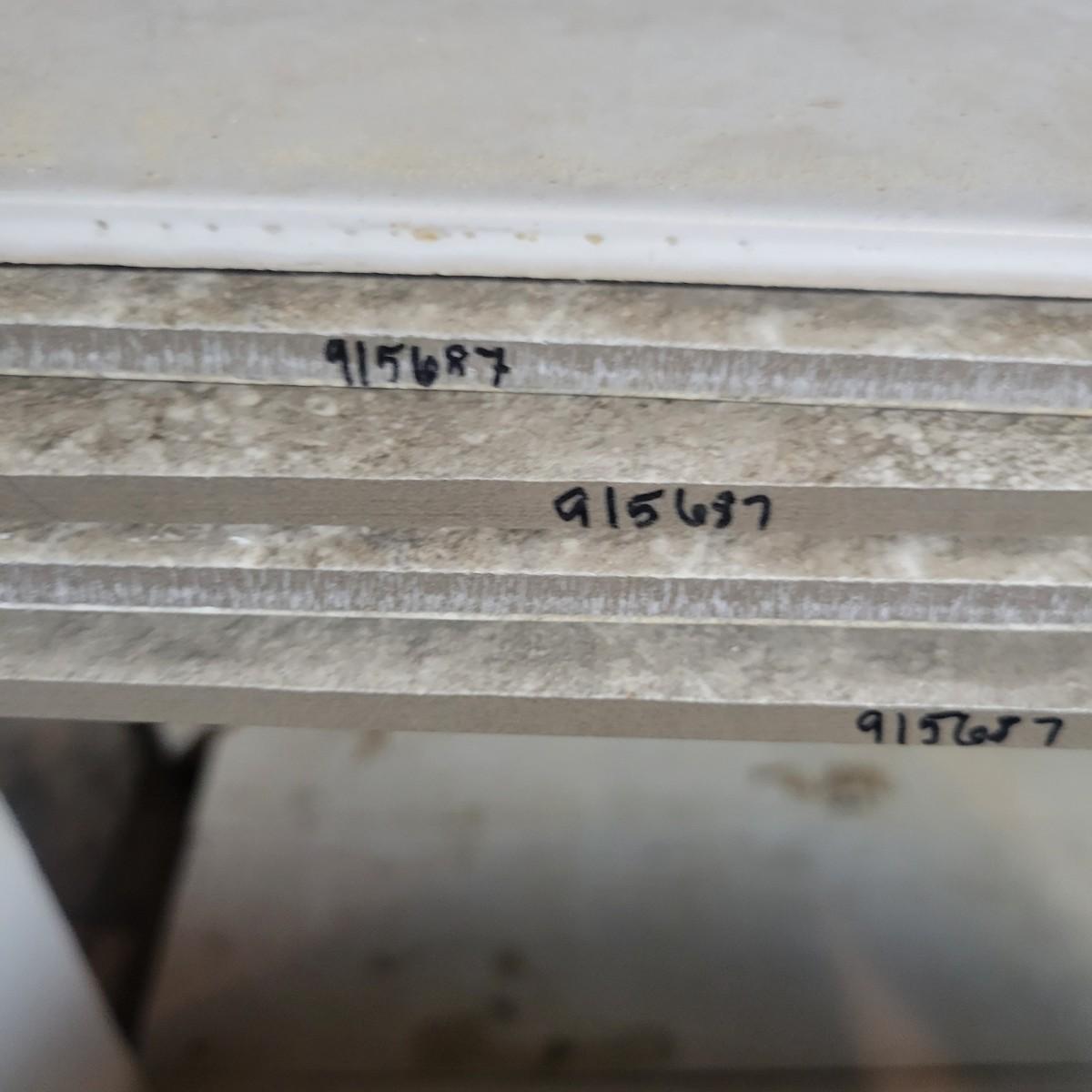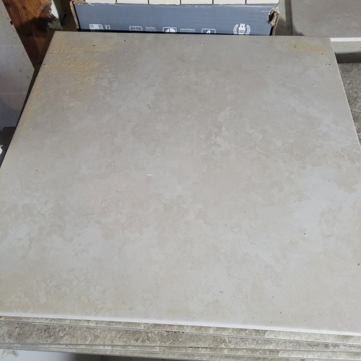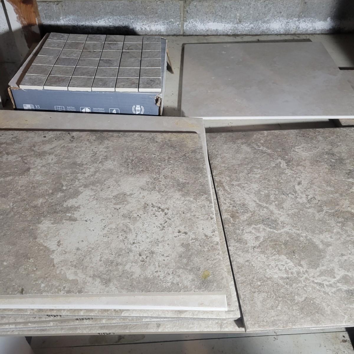 A variety of three different flooring tiles in good condition. The larger tiles measure approximately 17.5" x 17.5". There five full pieces of the darker tile and one cut piece. The lighter pattern has two full sized pieces. Also includes four complete pieces of the grid tile. Measures approximately 12" x 12". Lot also includes a random tile piece that measures 6" x 29.5" Local pickup only