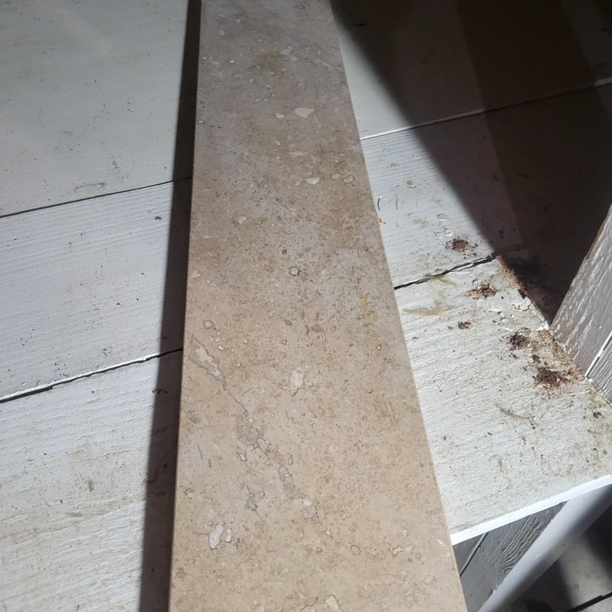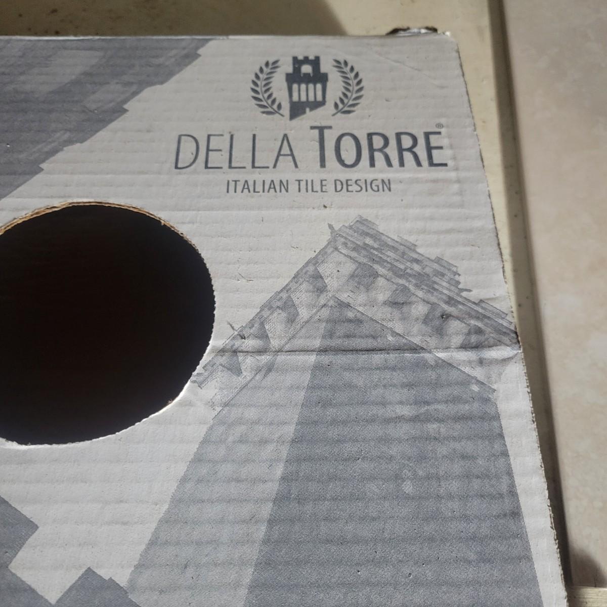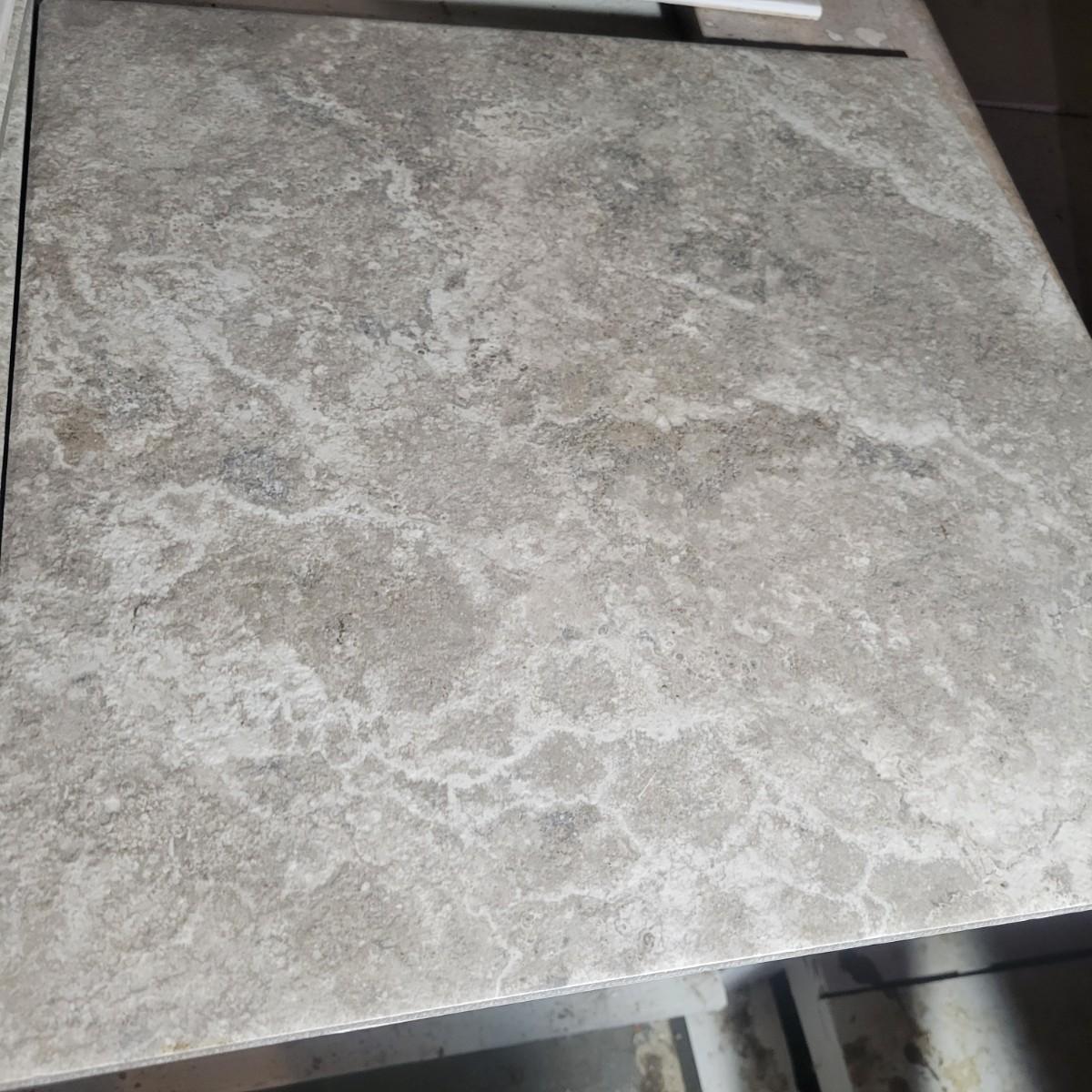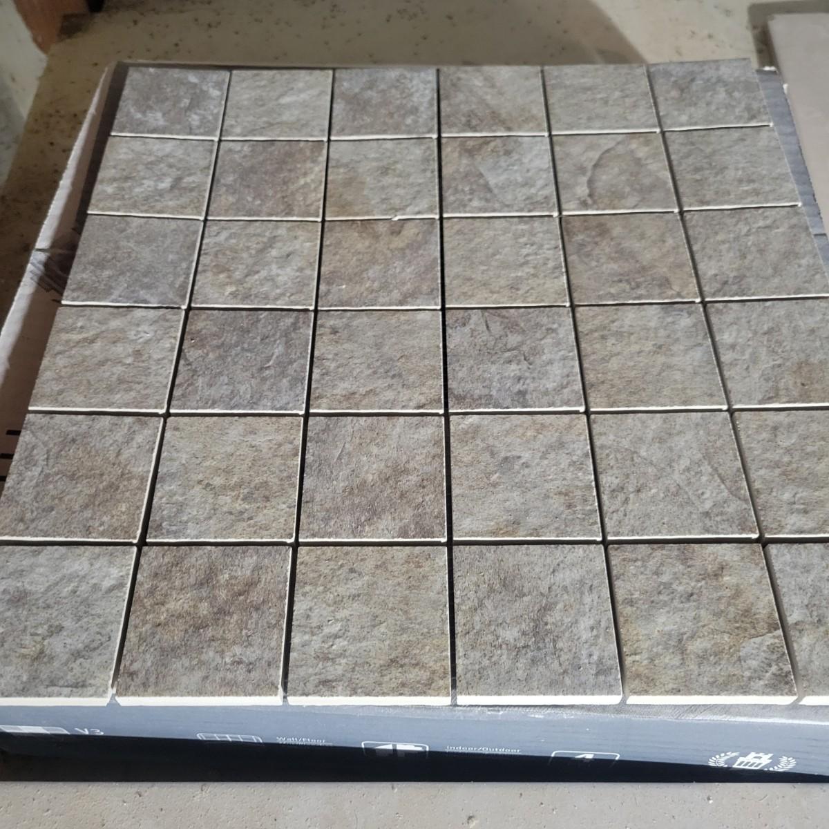 A variety of three different flooring tiles in good condition. The larger tiles measure approximately 17.5" x 17.5". There five full pieces of the darker tile and one cut piece. The lighter pattern has two full sized pieces. Also includes four complete pieces of the grid tile. Measures approximately 12" x 12". Lot also includes a random tile piece that measures 6" x 29.5" Local pickup only