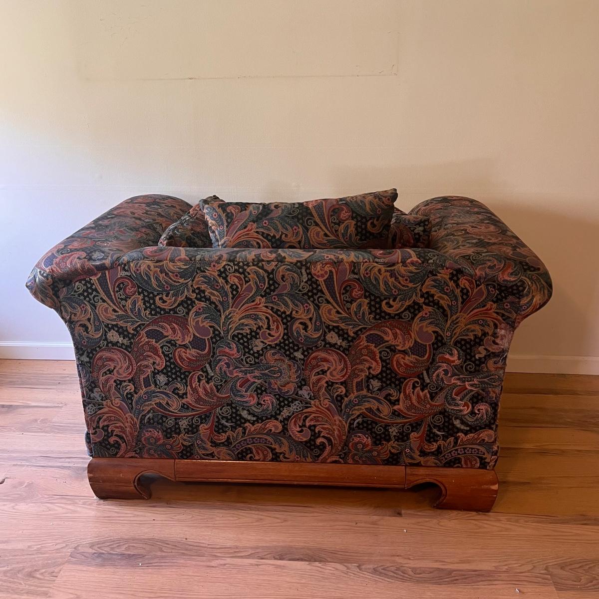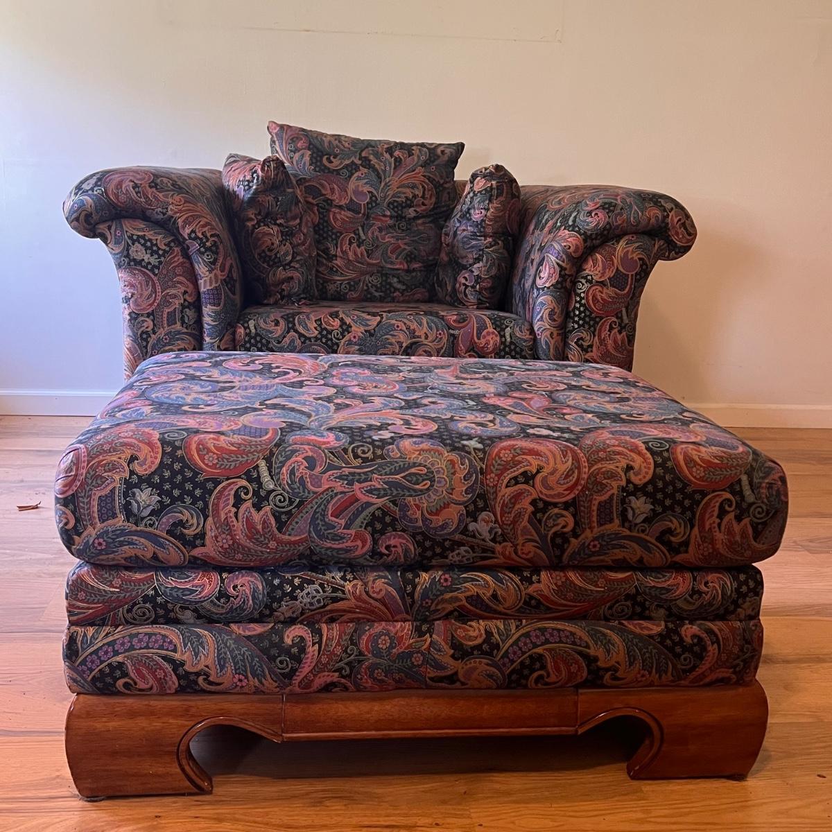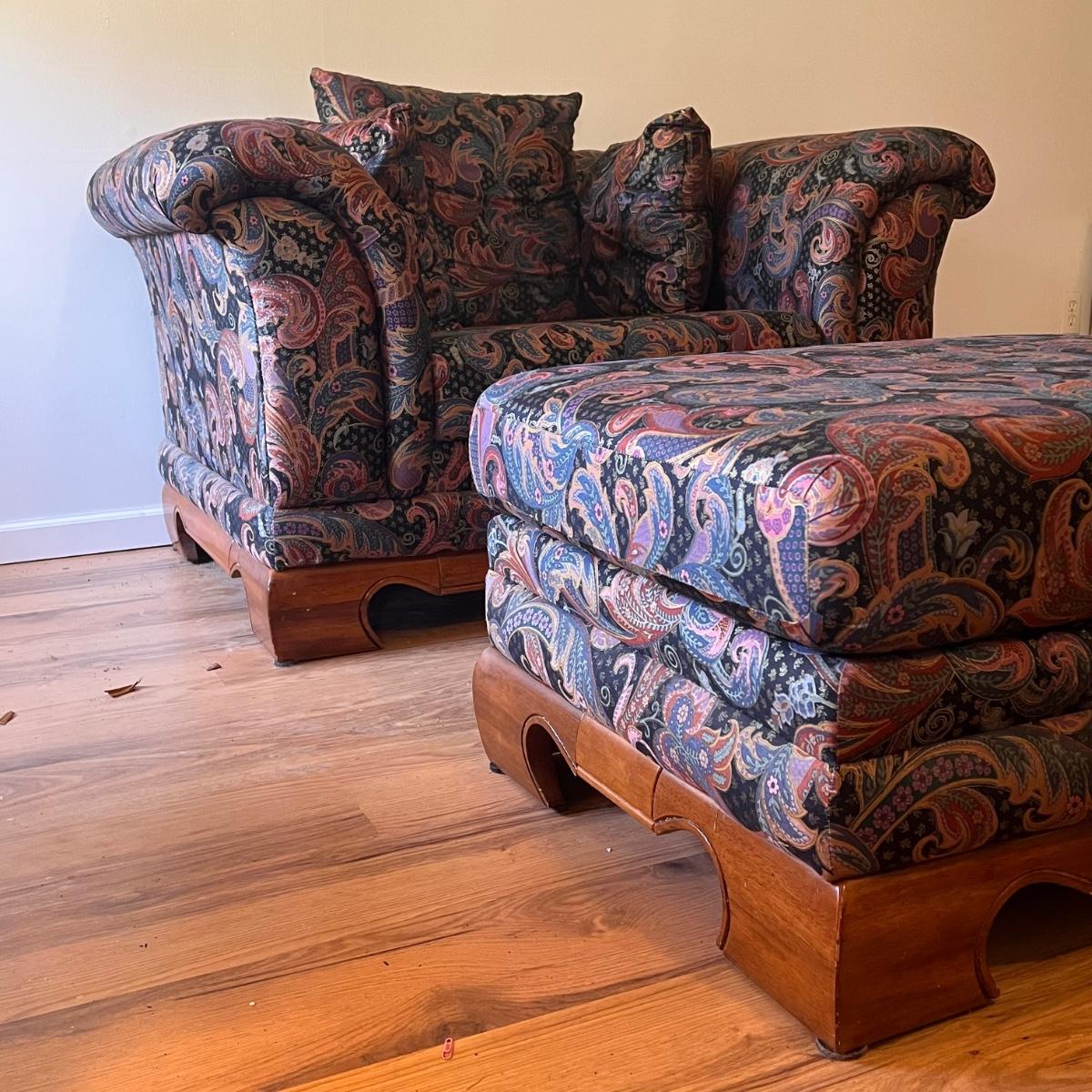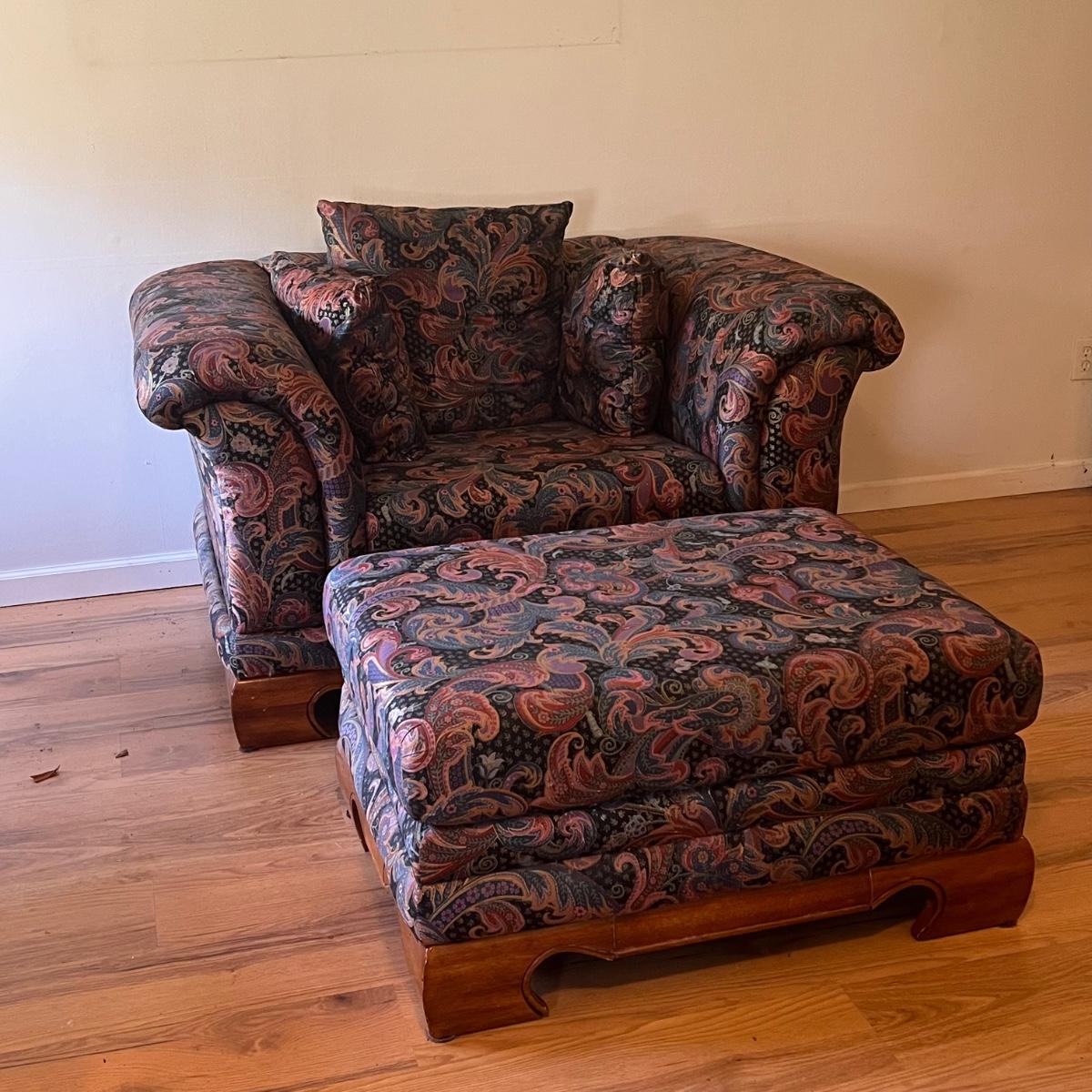 Matching chair and ottoman with a swirly floral pattern. Each piece has a solid wood foundation and feet with a very comfortable cushion. The chair measures 54” x 36” x 31”H and comes with three pillows. The ottoman measures 36” x 26” x 17”H. The chair has a scuff mark on one of the legs and a few scratch marks from cats - see pictures included. Local pickup only. Winning bidder must bring assistance to help move and load this item due to its weight and/or size.