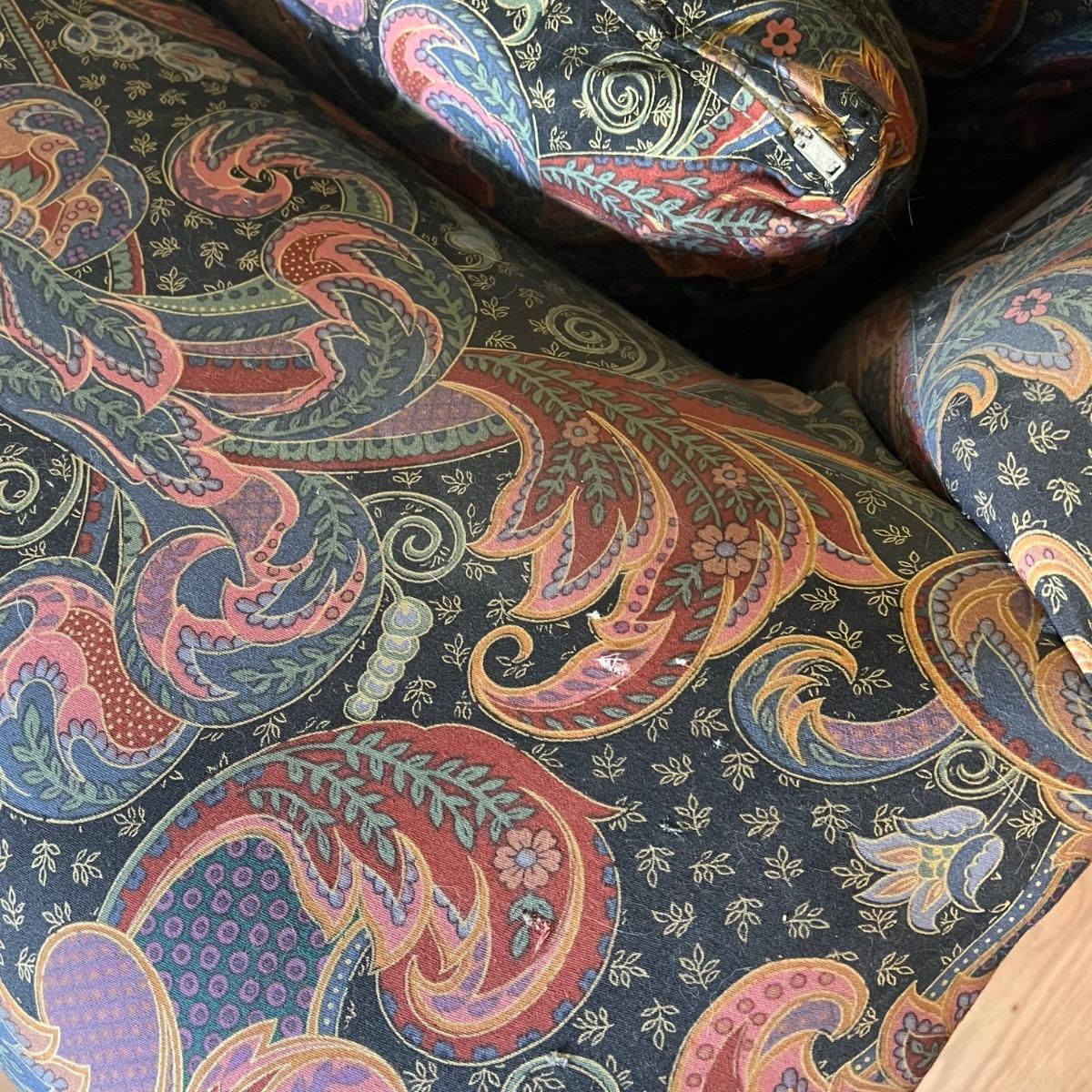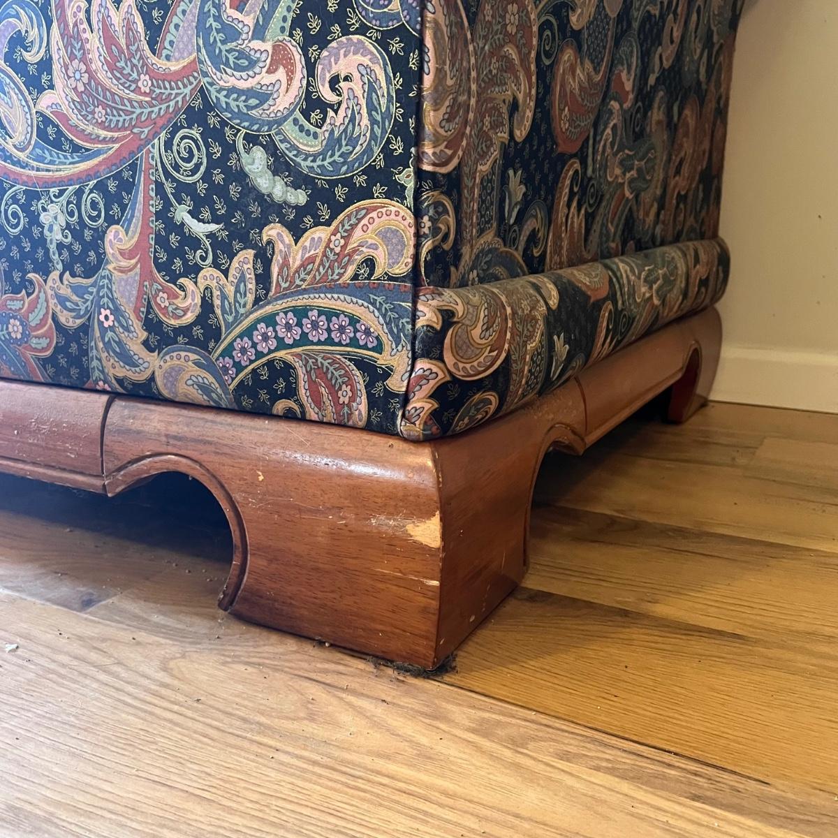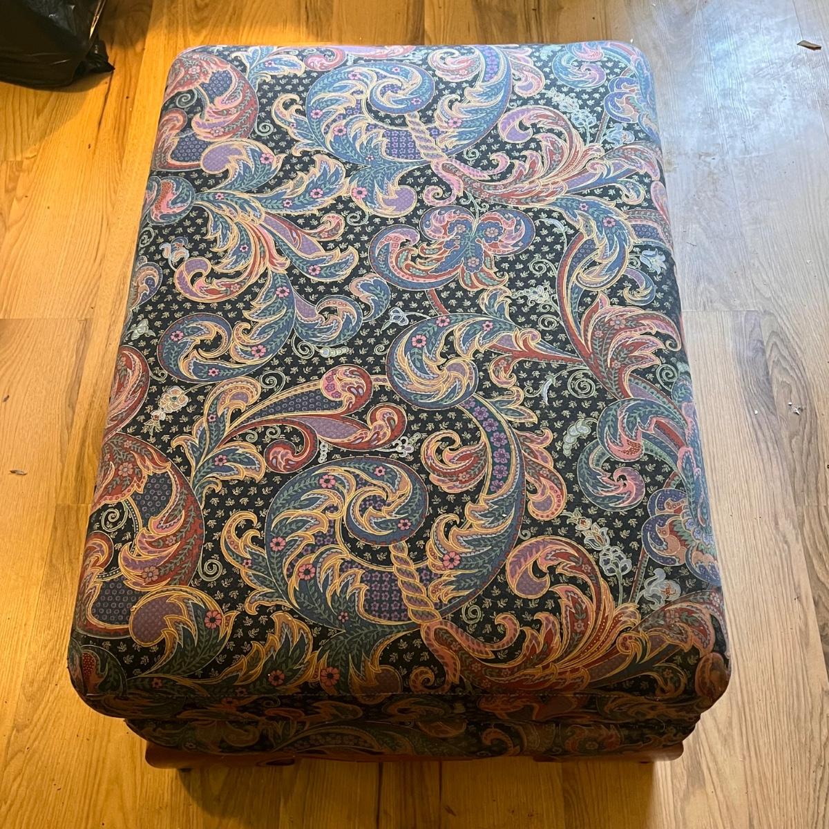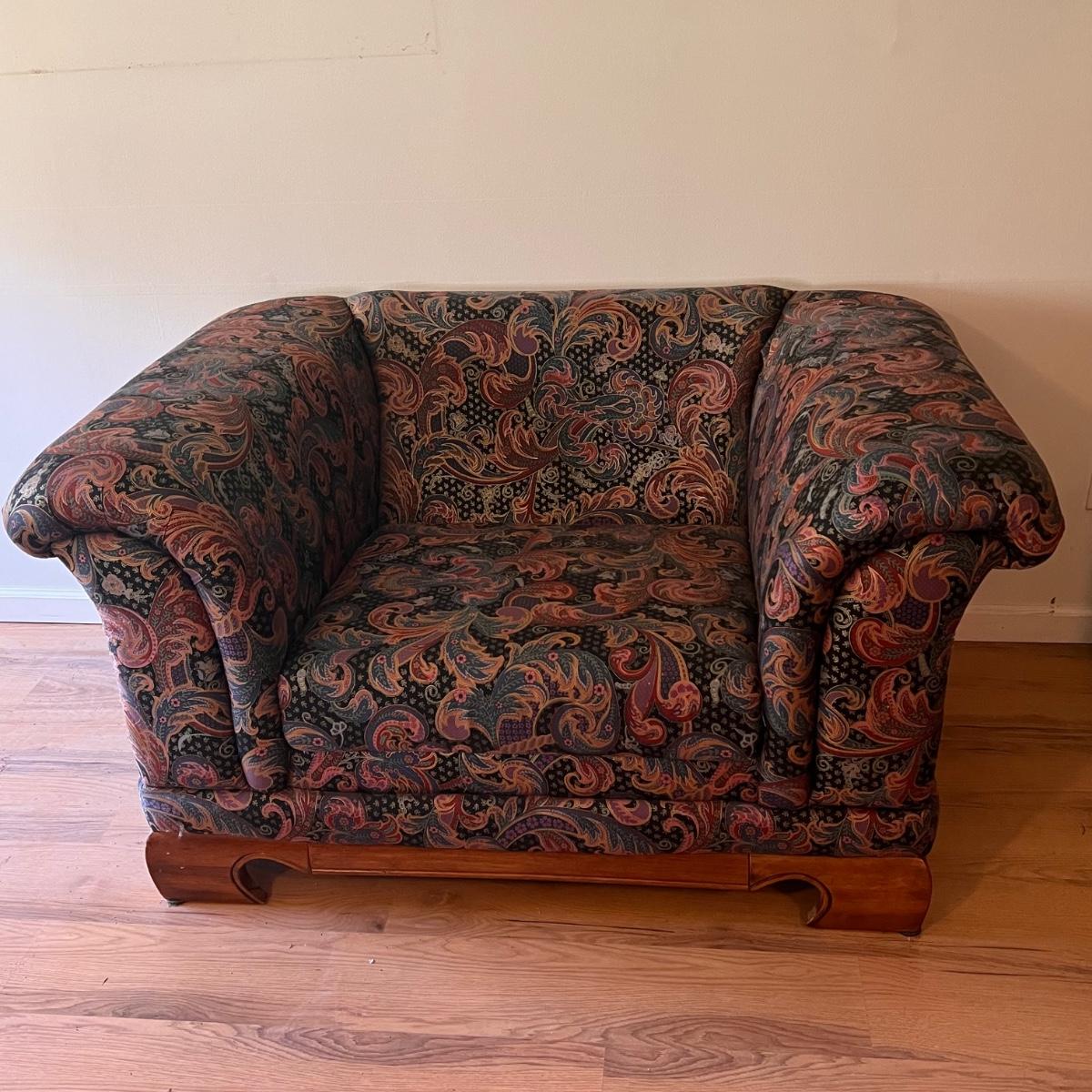 Matching chair and ottoman with a swirly floral pattern. Each piece has a solid wood foundation and feet with a very comfortable cushion. The chair measures 54” x 36” x 31”H and comes with three pillows. The ottoman measures 36” x 26” x 17”H. The chair has a scuff mark on one of the legs and a few scratch marks from cats - see pictures included. Local pickup only. Winning bidder must bring assistance to help move and load this item due to its weight and/or size.