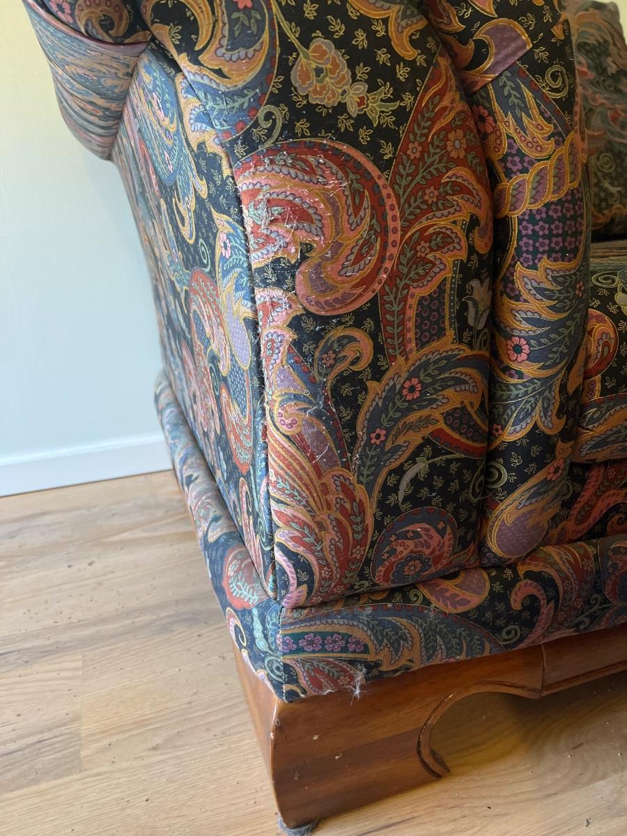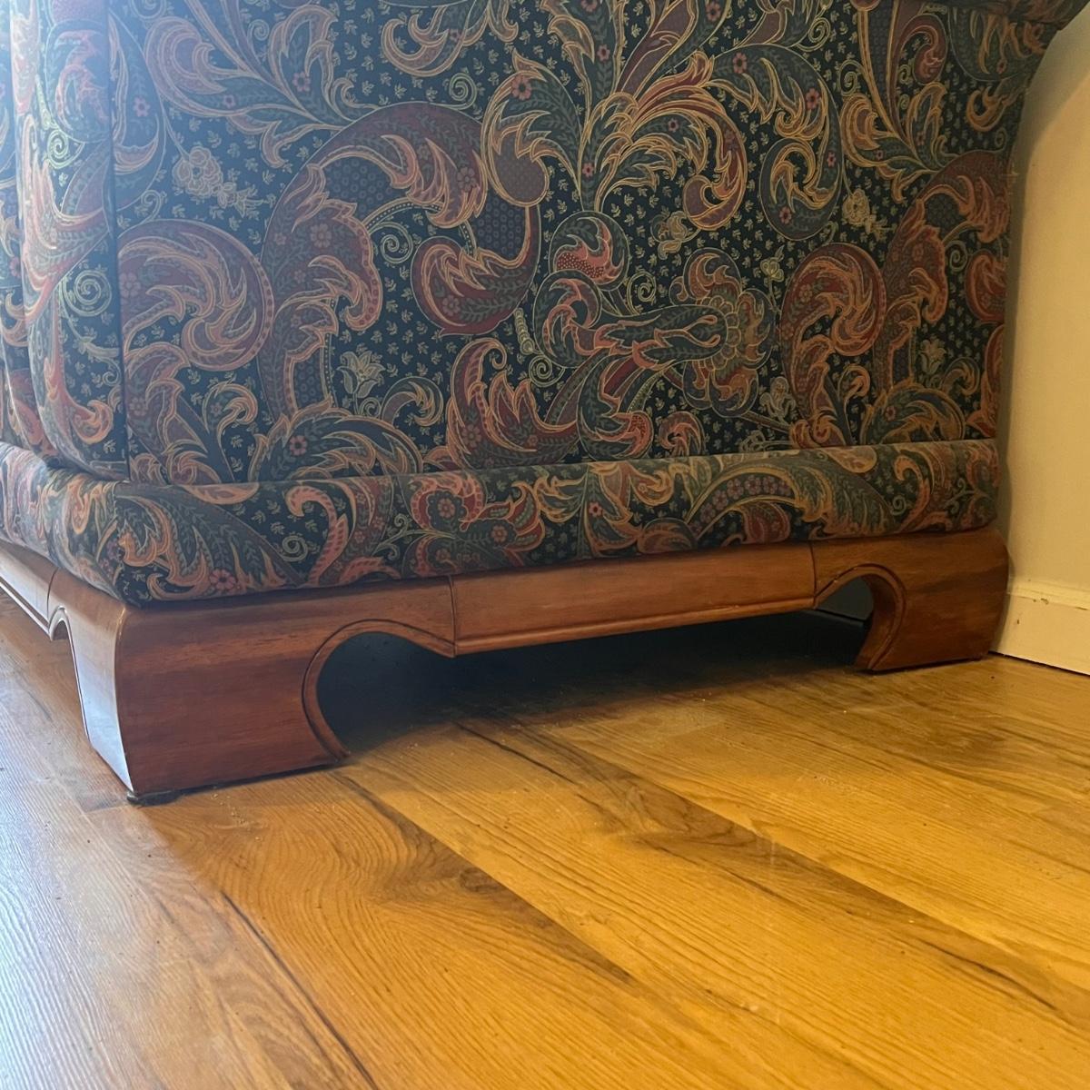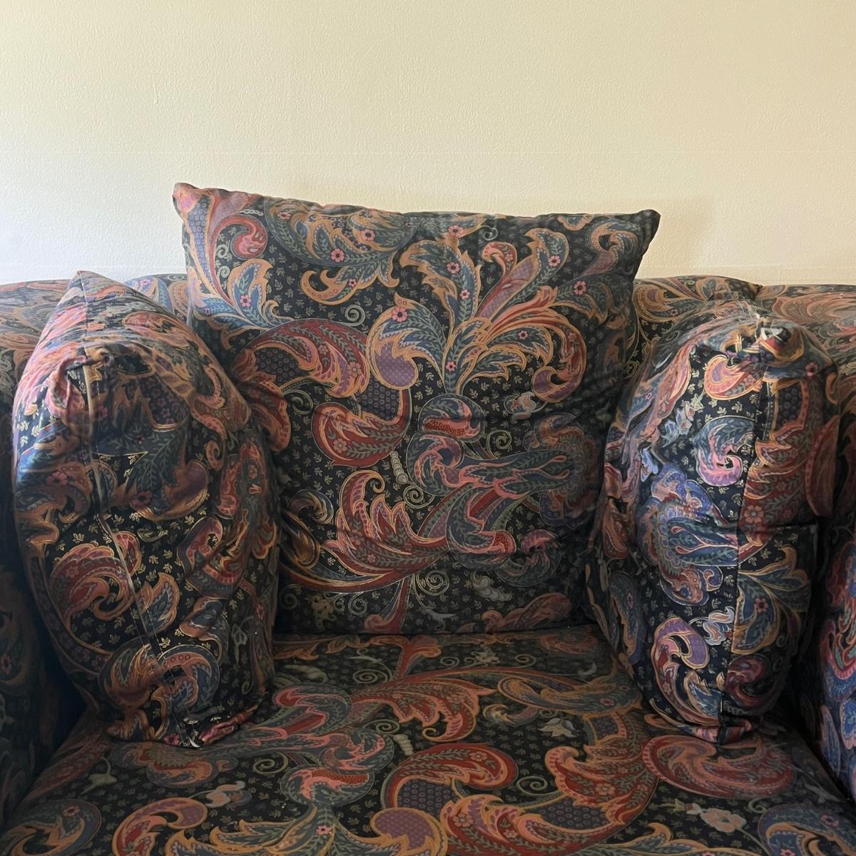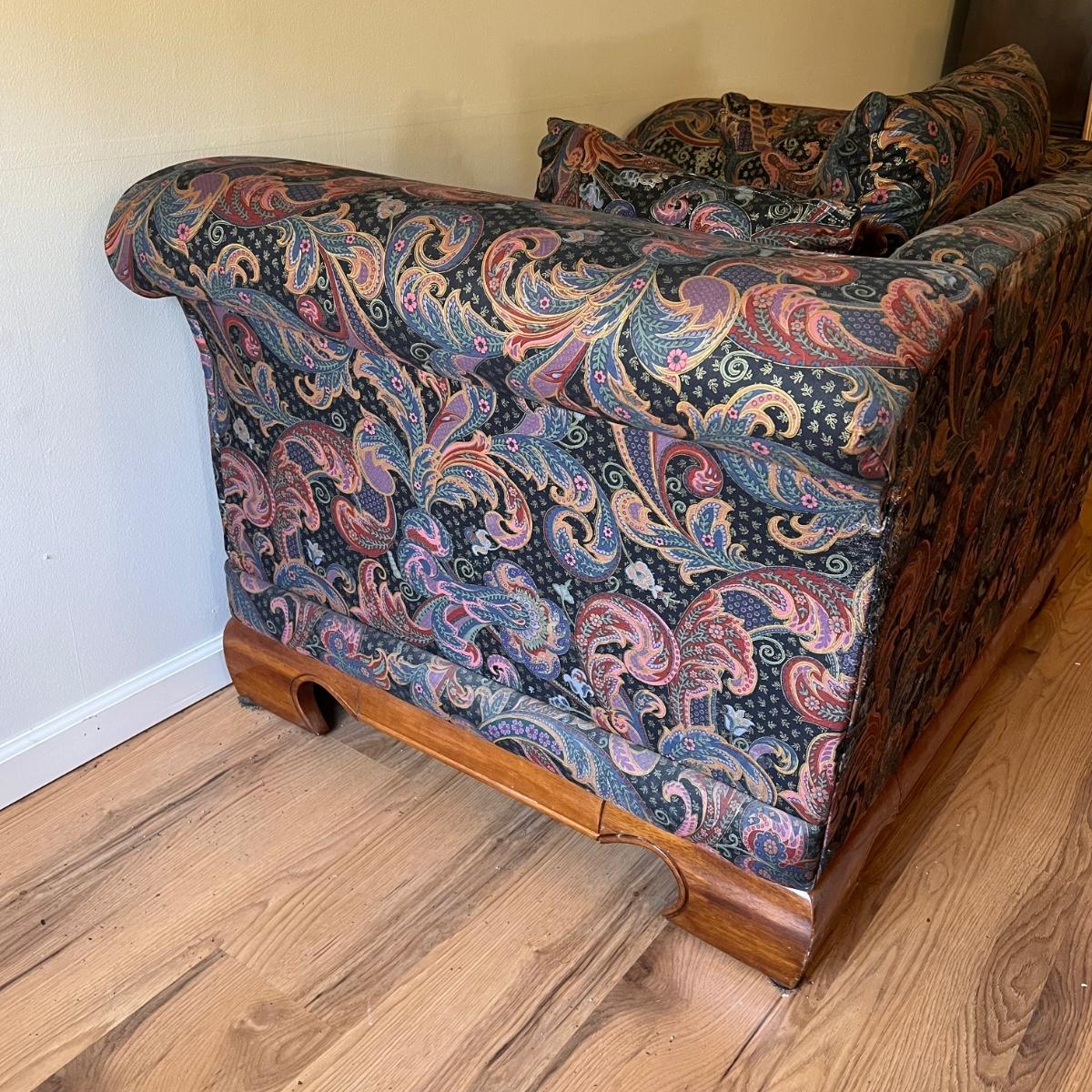 Matching chair and ottoman with a swirly floral pattern. Each piece has a solid wood foundation and feet with a very comfortable cushion. The chair measures 54” x 36” x 31”H and comes with three pillows. The ottoman measures 36” x 26” x 17”H. The chair has a scuff mark on one of the legs and a few scratch marks from cats - see pictures included. Local pickup only. Winning bidder must bring assistance to help move and load this item due to its weight and/or size.