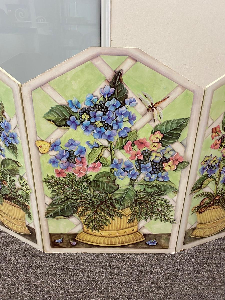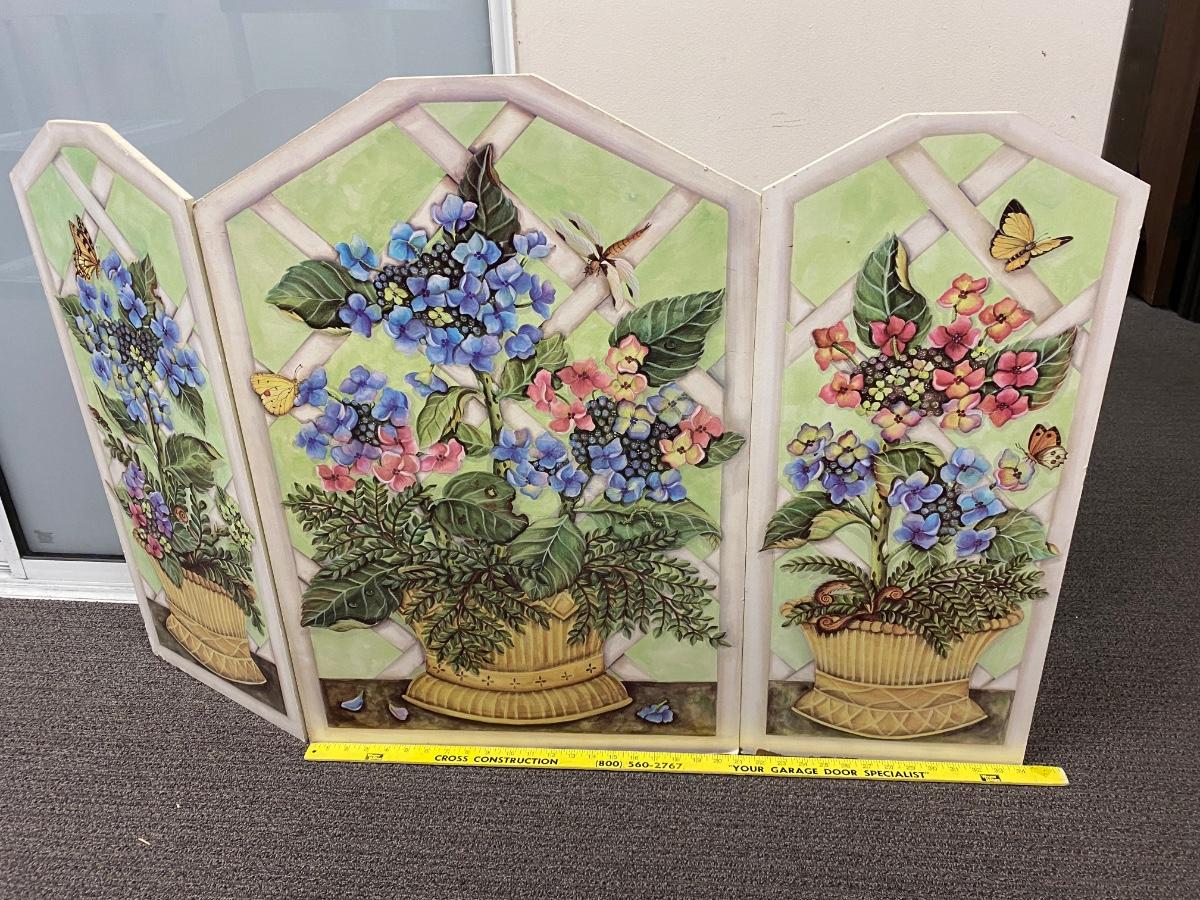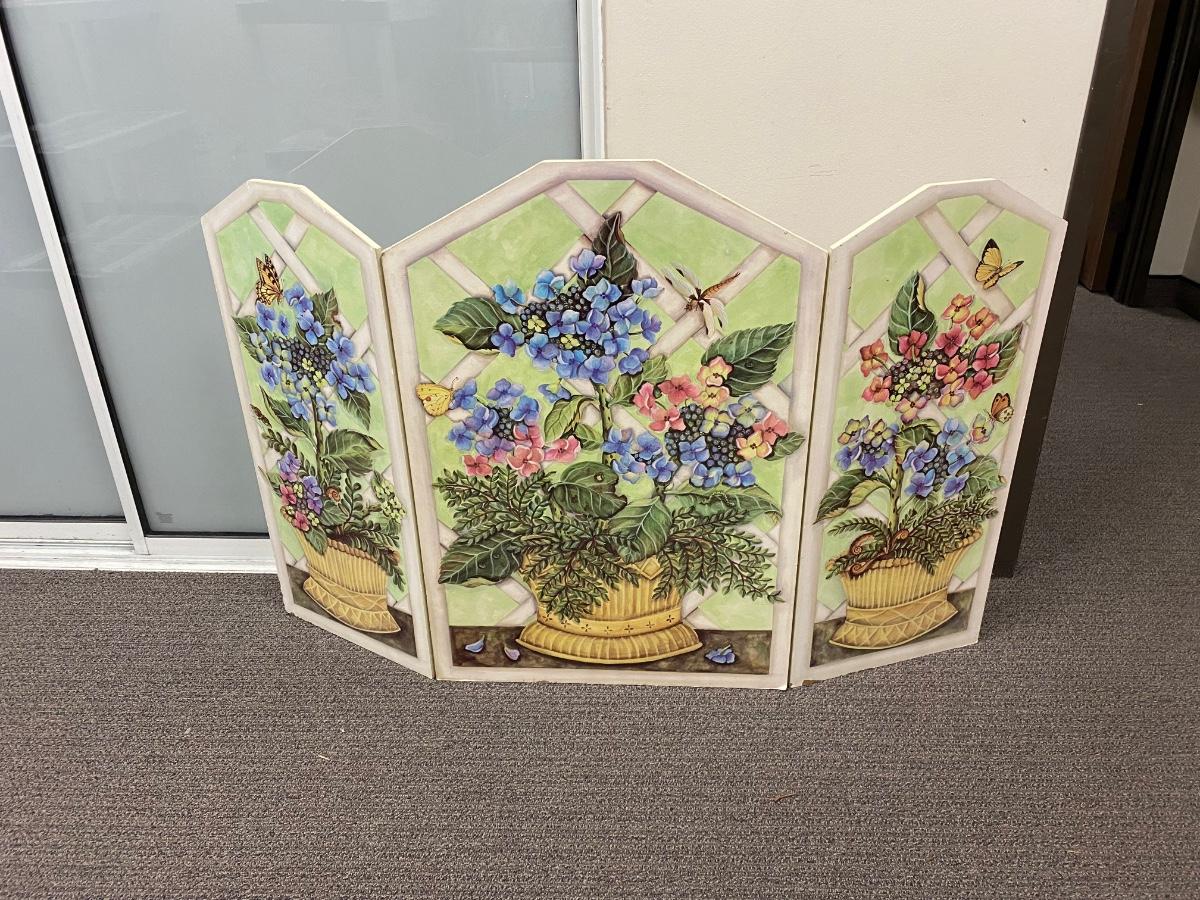 Floral art design covered fireplace screen. Good for in front of fireplaces when not used. Floral arrangement and butterfly detail art. Solid wood. In good used condition, there is some wear to the bottom edge.