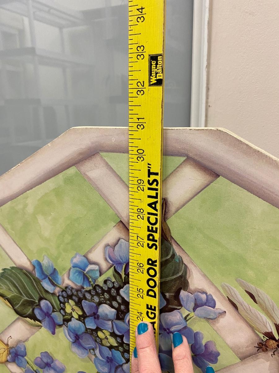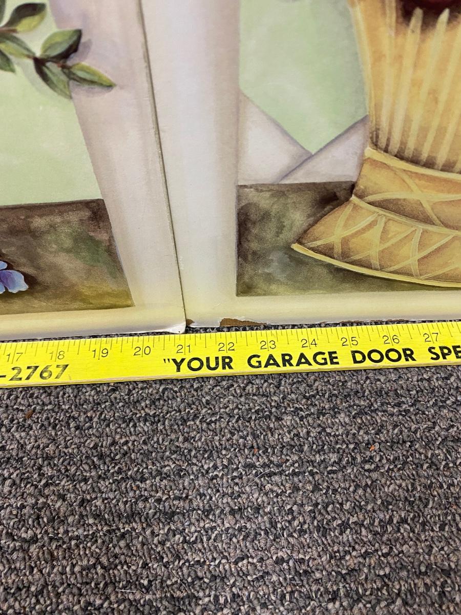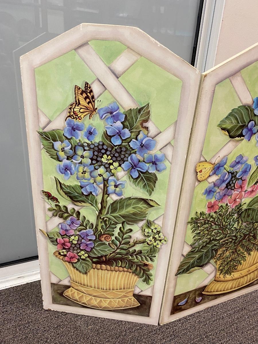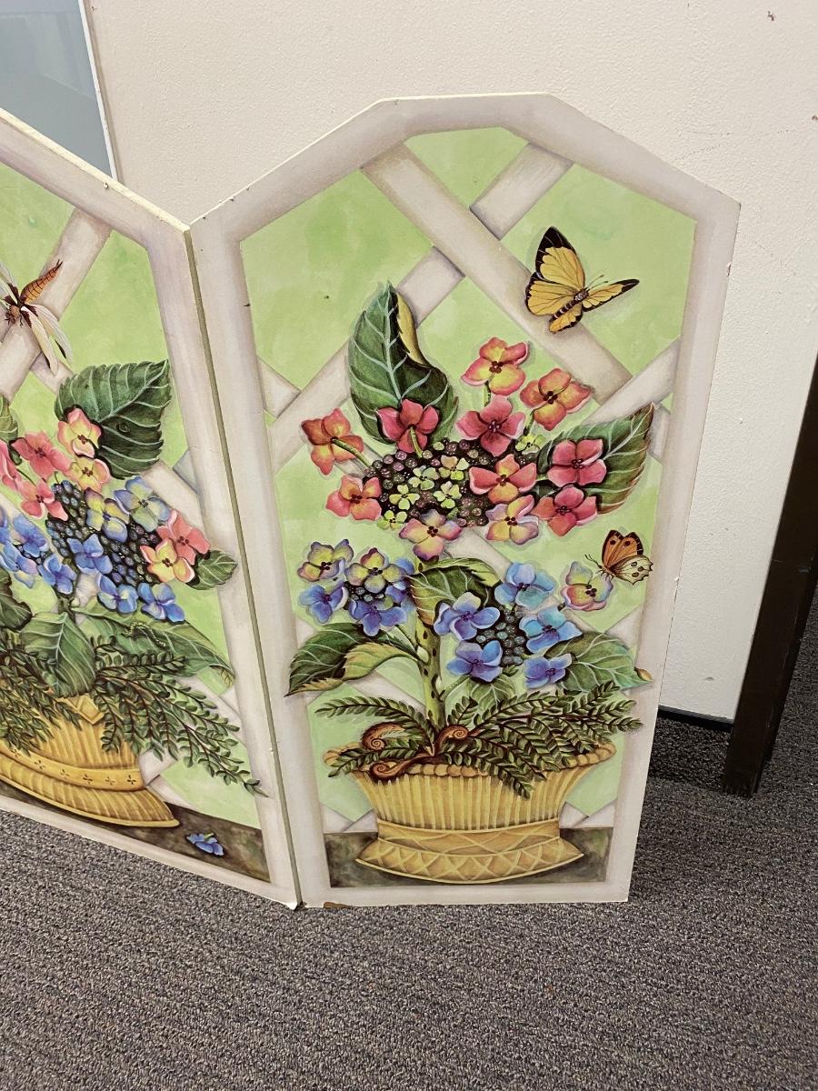 Floral art design covered fireplace screen. Good for in front of fireplaces when not used. Floral arrangement and butterfly detail art. Solid wood. In good used condition, there is some wear to the bottom edge.