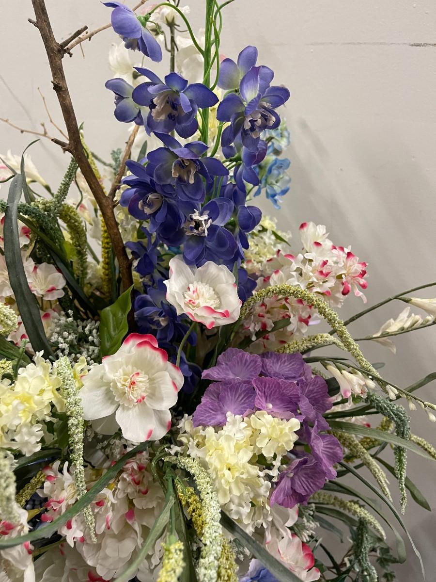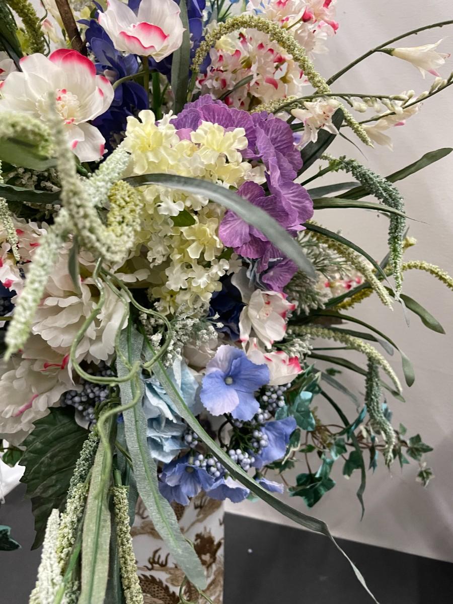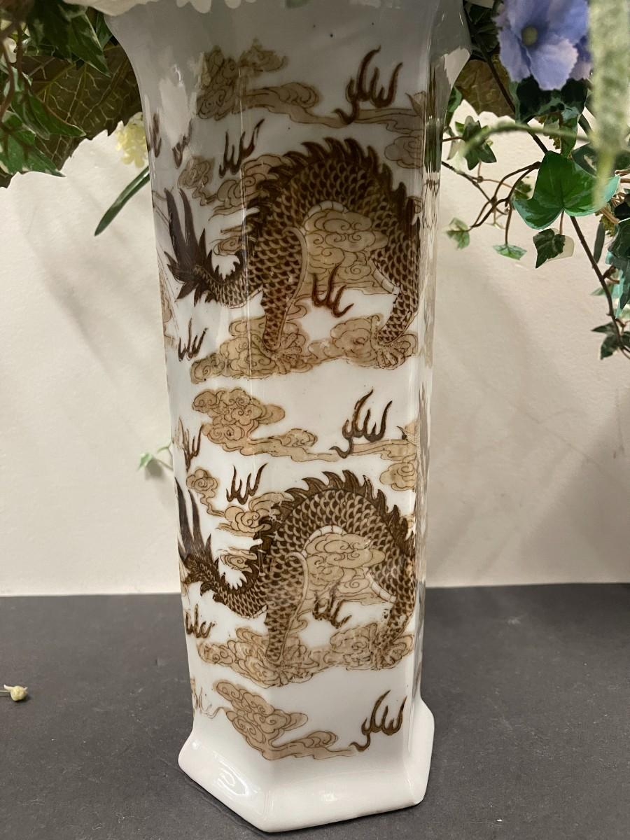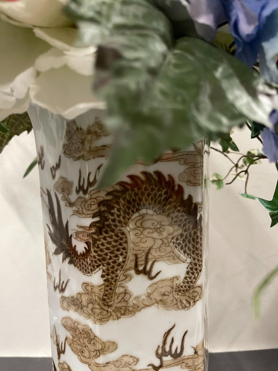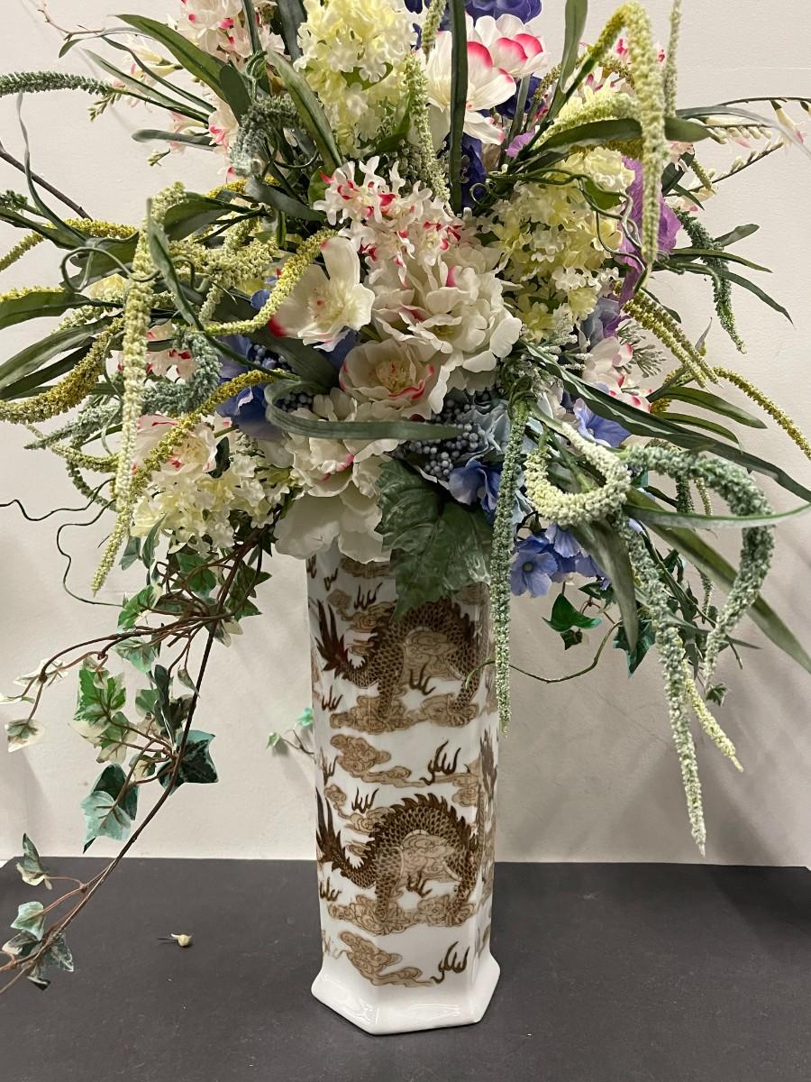 Floral Arrangement in Vintage Brown and White Dragon Chinese Porcelain Vase. Excellent condition. Vase is approx 14" high. With flowers: 36"